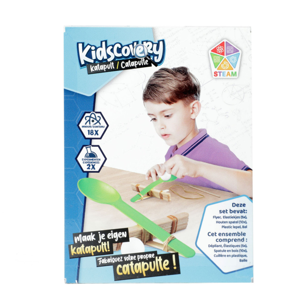 Kidscovery experimenteersetje voor het maken van je eigen catapult. Inhoud: 10 houten stokjes, 5 elastieken, plastic lepel, bal en drietalige instructies. Geschikt vanaf 8 jaar.