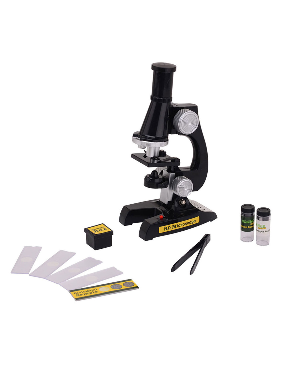Microscoop om 100x, 200x en 450x te vergroten, met lampje. Inclusief accessoires: microscoop kit, glaasjes om materiaal op te leggen, bakjes en een pincet. Geschikt voor kinderen vanaf 8 jaar.