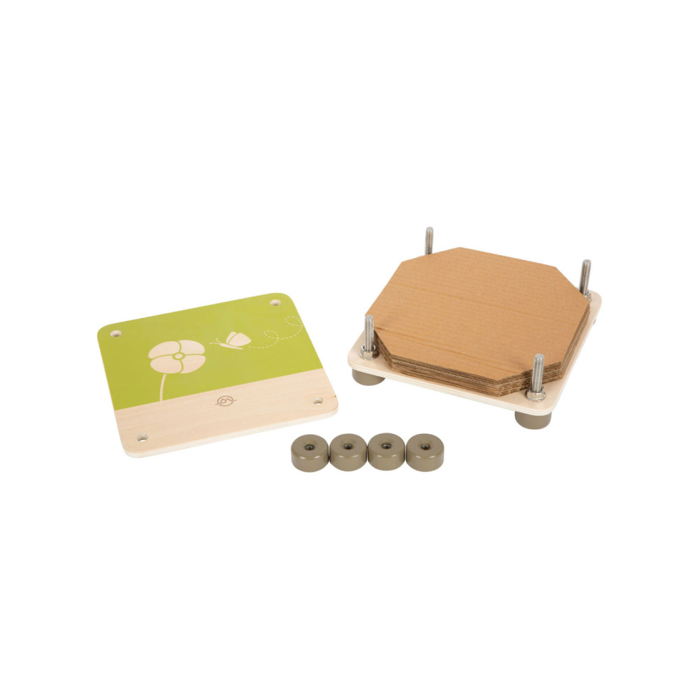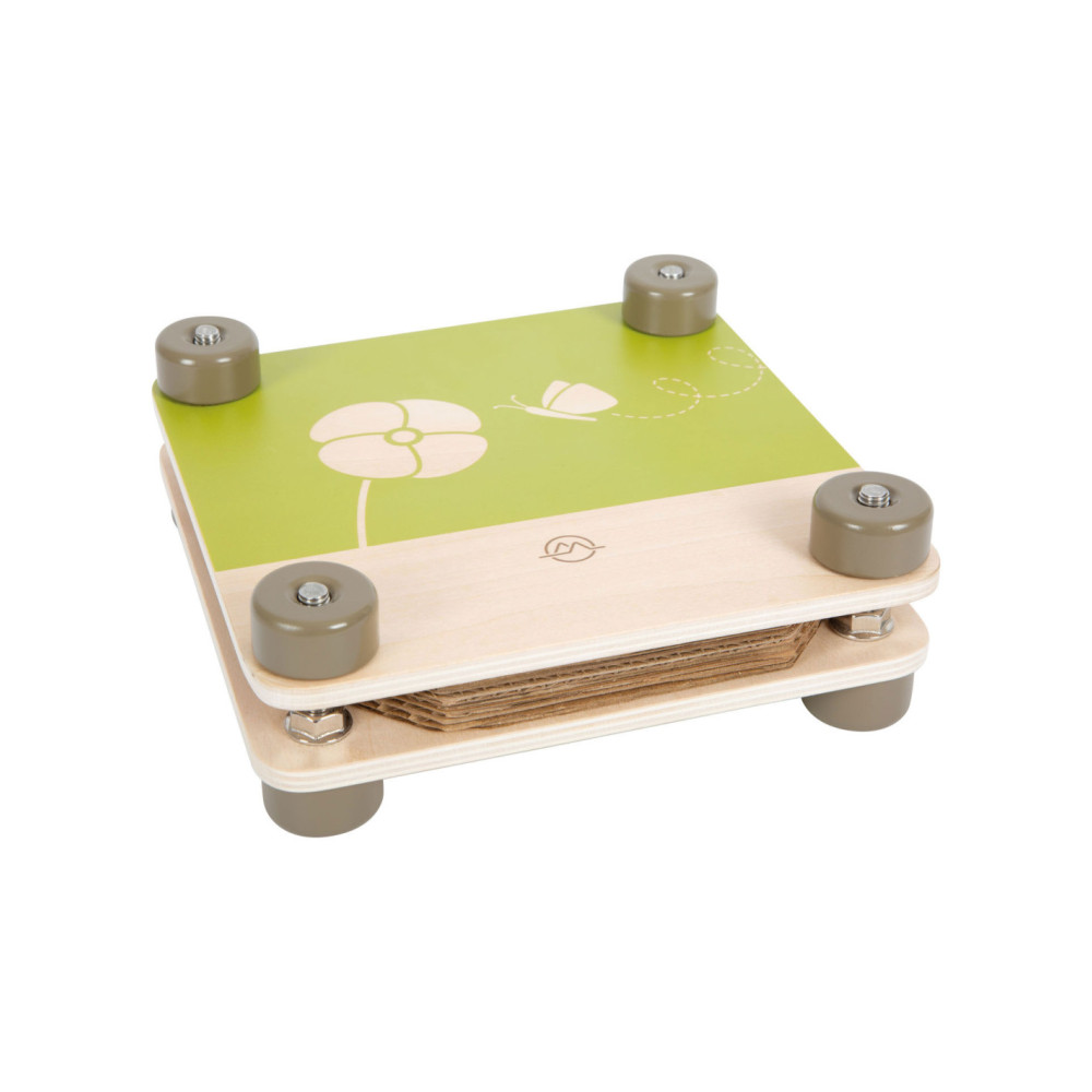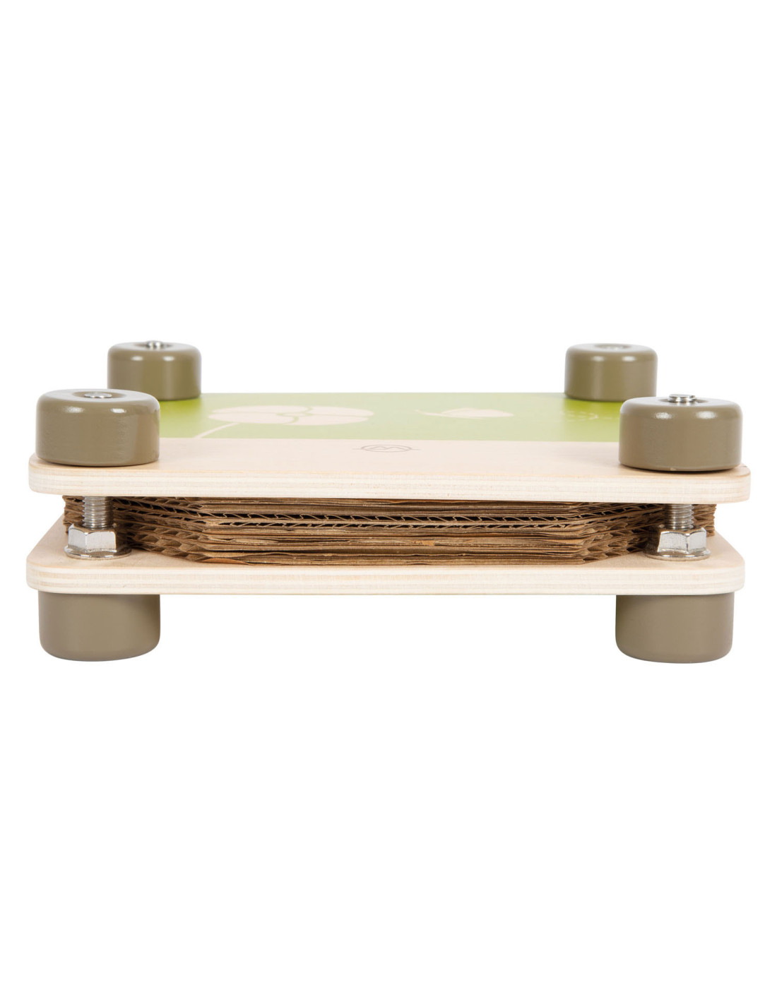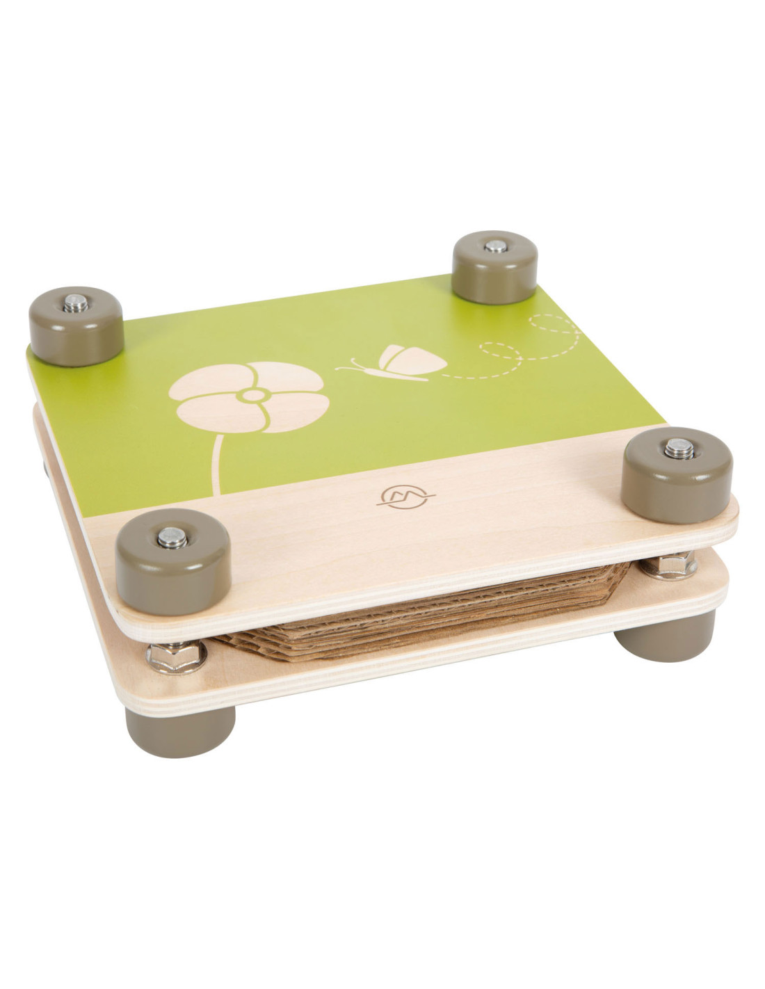 Bloemen in een handomdraai persen! Deze kindvriendelijke bloemenpers, gemaakt van stevig FSC®-gecertificeerd hout, is voorzien van vier poten en heeft 8 kartonnen vellen en 16 persvellen. Hiermee biedt het voldoende ruimte om bladeren, bloemblaadjes en bloemen te drogen en plat te maken. Door eenvoudigweg de verzamelde natuurlijke schatten tussen de lagen papier en karton te leggen, kunt u ze gemakkelijk bewaren. Vier metalen schroeven en moeren geplaatst binnen houten ringen maken het gemakkelijk voor kinderen om het te gebruiken, waardoor ze een stevige grip en voldoende kracht hebben om de twee houten panelen samen te drukken. Deze houten bloemenpers maakt ook een geweldige visuele indruk met zijn afgeronde randen, hoogwaardige productie en aantrekkelijk ontwerp met veel zichtbaar houtmateriaal gecombineerd met moderne groene kleuren.