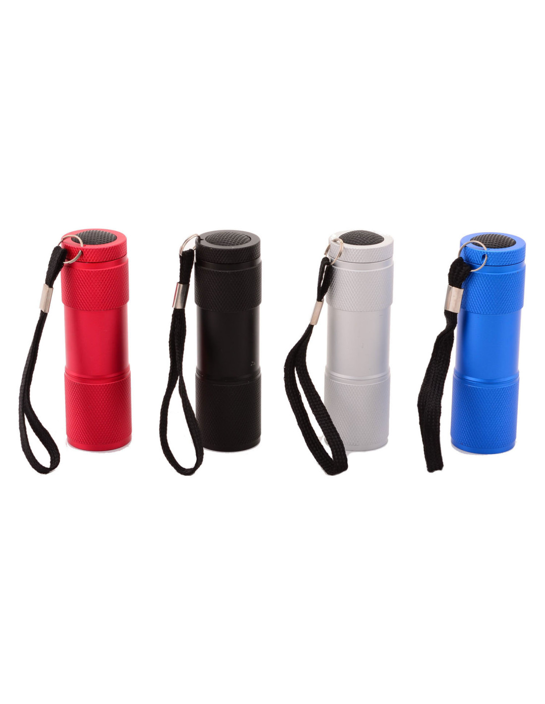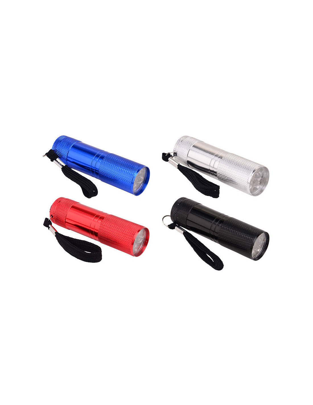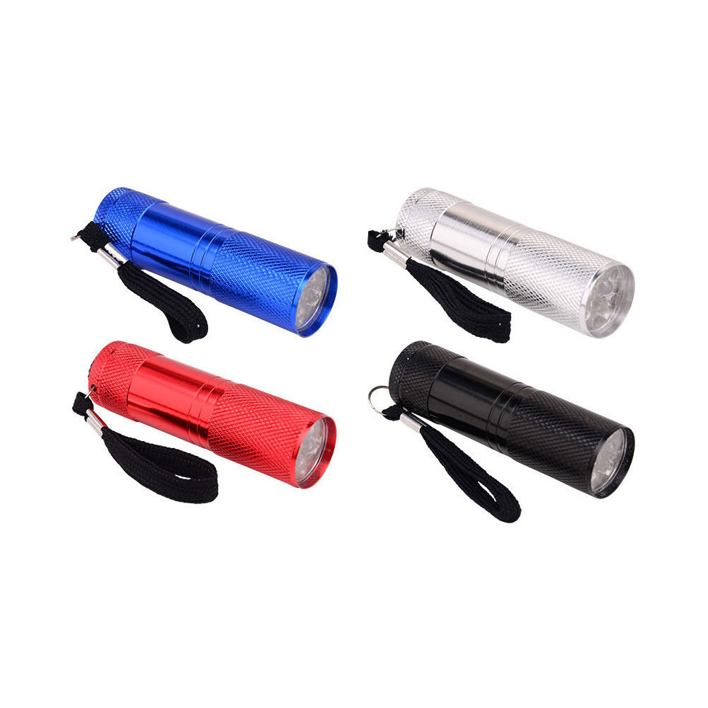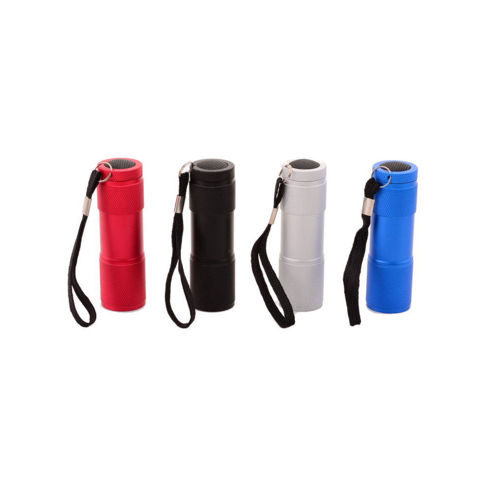 Compacte aluminium zaklamp met 9 LED-lichtpunten en draaglus. De zaklamp wordt geleverd inclusief 3 AAA batterijen. Verkrijgbaar in zwart, zilver, rood of blauw. Afmetingen: 3 x 3 x 8 centimeter.