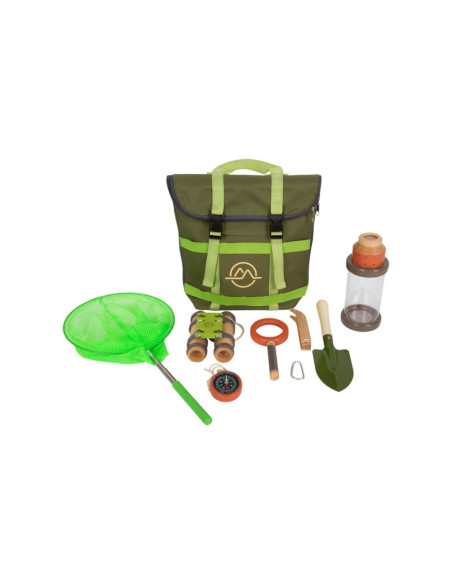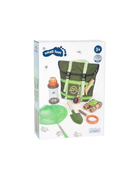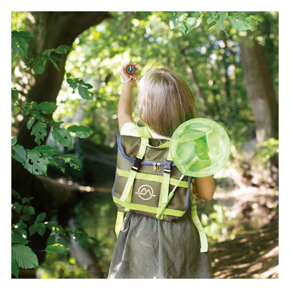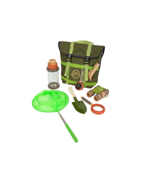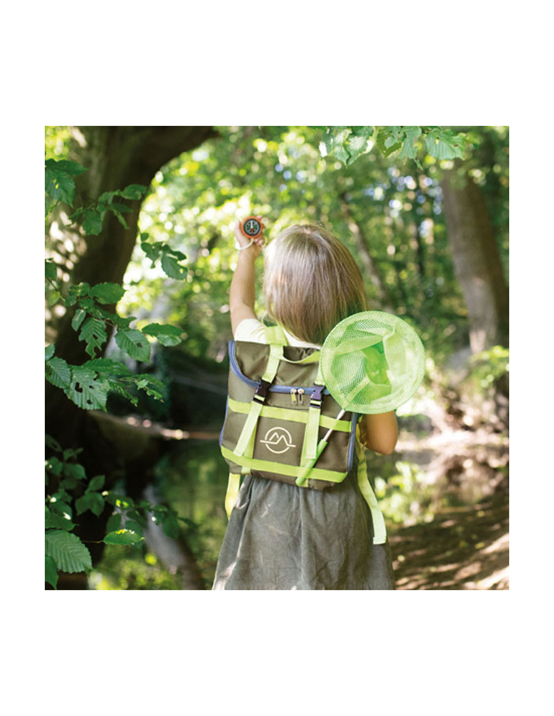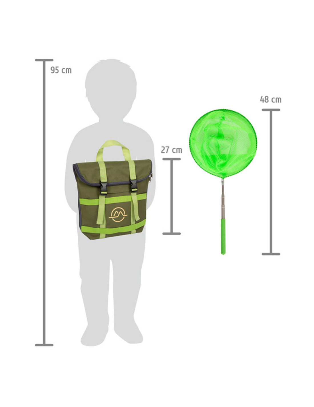 Avonturiers rugzak voor kinderen. Inhoud: insectenpot met schroefdeksel en geïntegreerd vergrootglas, houten verrekijker, insectennet met telescoopstok, kompas met draagkoord, vergrootglas met vergrotingsfunctie, pincet, schep en veerhaak. Afmetingen: rugzak ca. 27 x 10 x 14 cm, schepnet (uitgeschoven) lengte: ca. 85 cm, Ø ca. 20 cm. Geschikt voor kinderen vanaf 3 jaar oud.