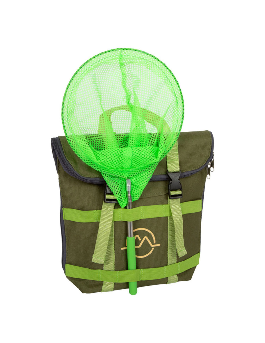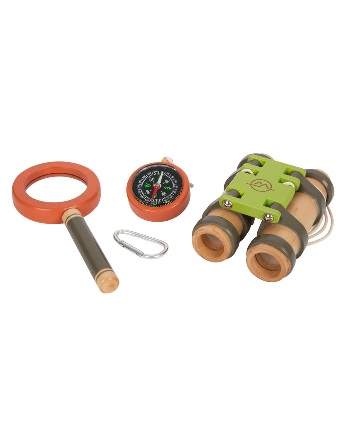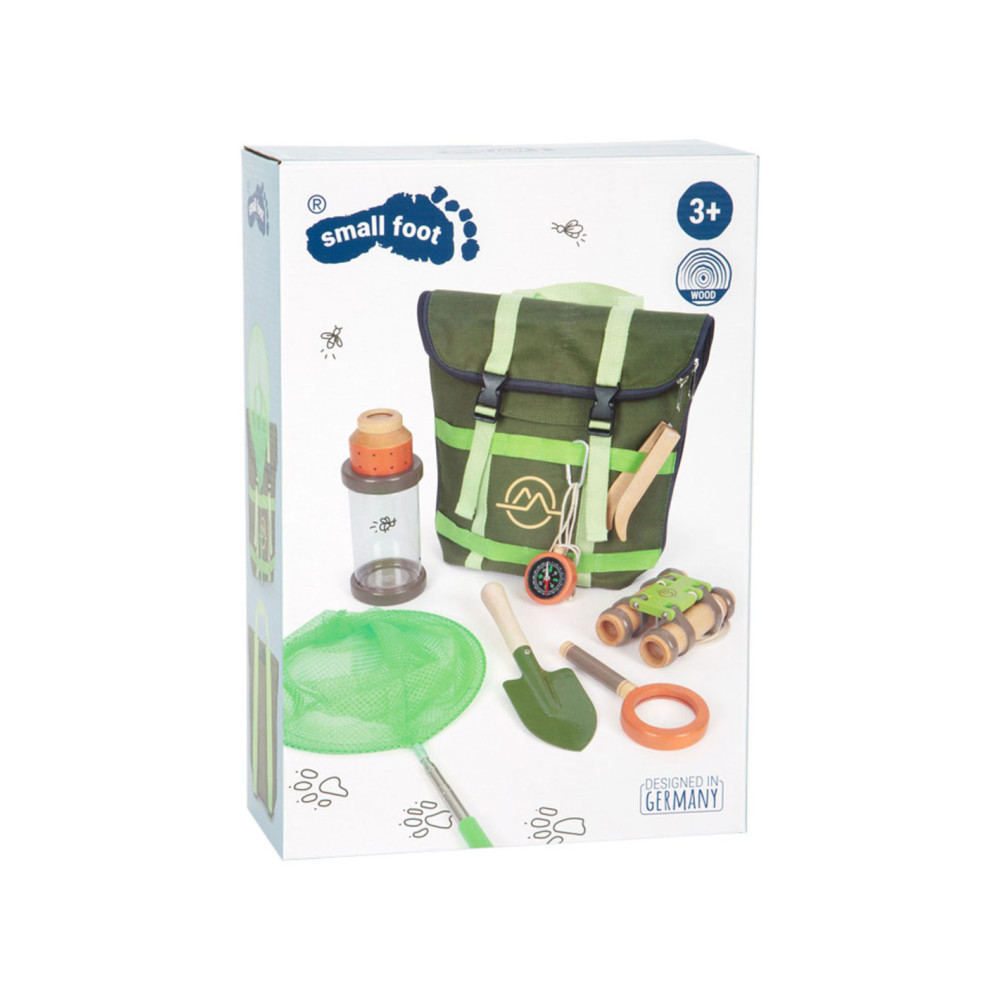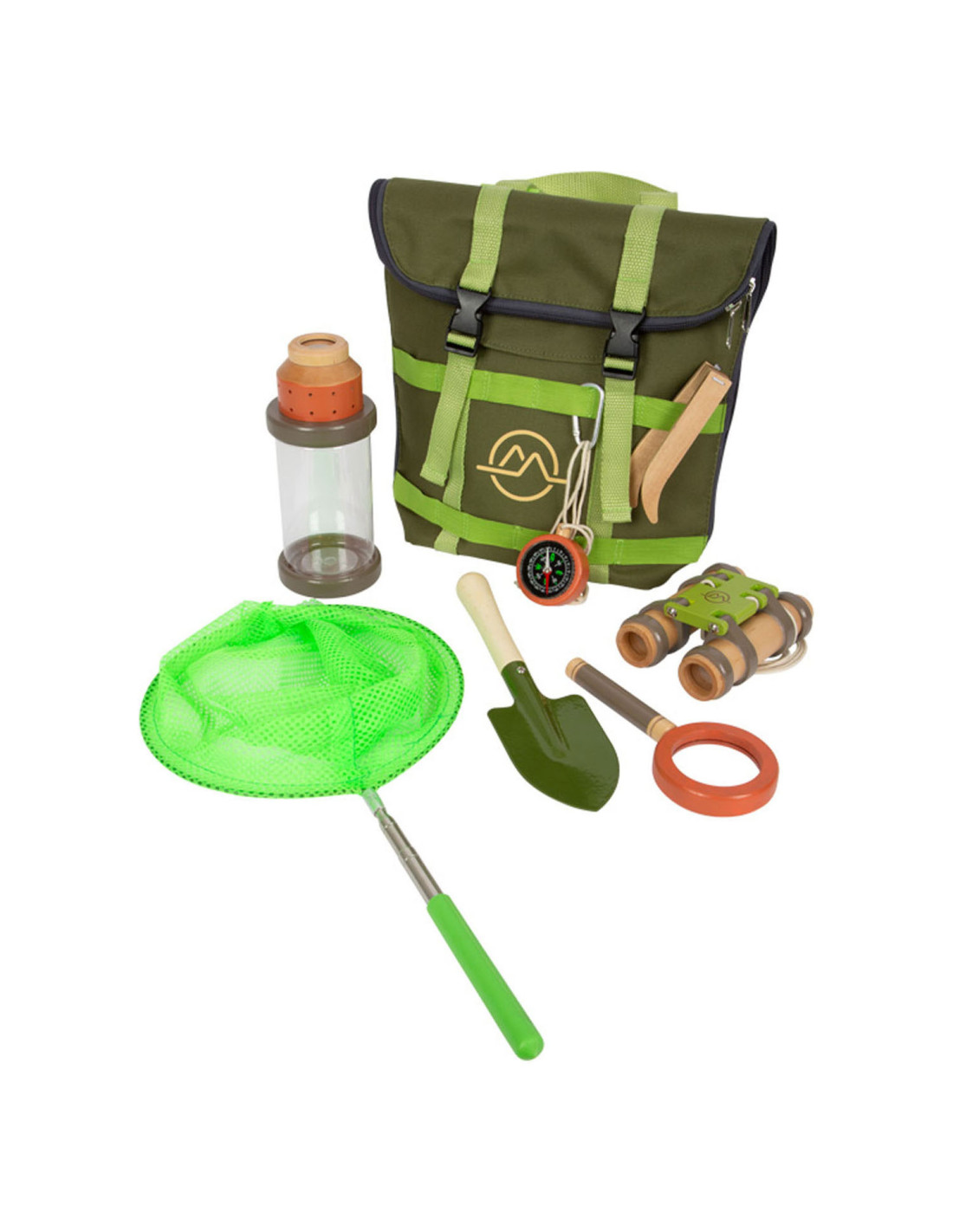 Avonturiers rugzak voor kinderen. Inhoud: insectenpot met schroefdeksel en geïntegreerd vergrootglas, houten verrekijker, insectennet met telescoopstok, kompas met draagkoord, vergrootglas met vergrotingsfunctie, pincet, schep en veerhaak. Afmetingen: rugzak ca. 27 x 10 x 14 cm, schepnet (uitgeschoven) lengte: ca. 85 cm, Ø ca. 20 cm. Geschikt voor kinderen vanaf 3 jaar oud.