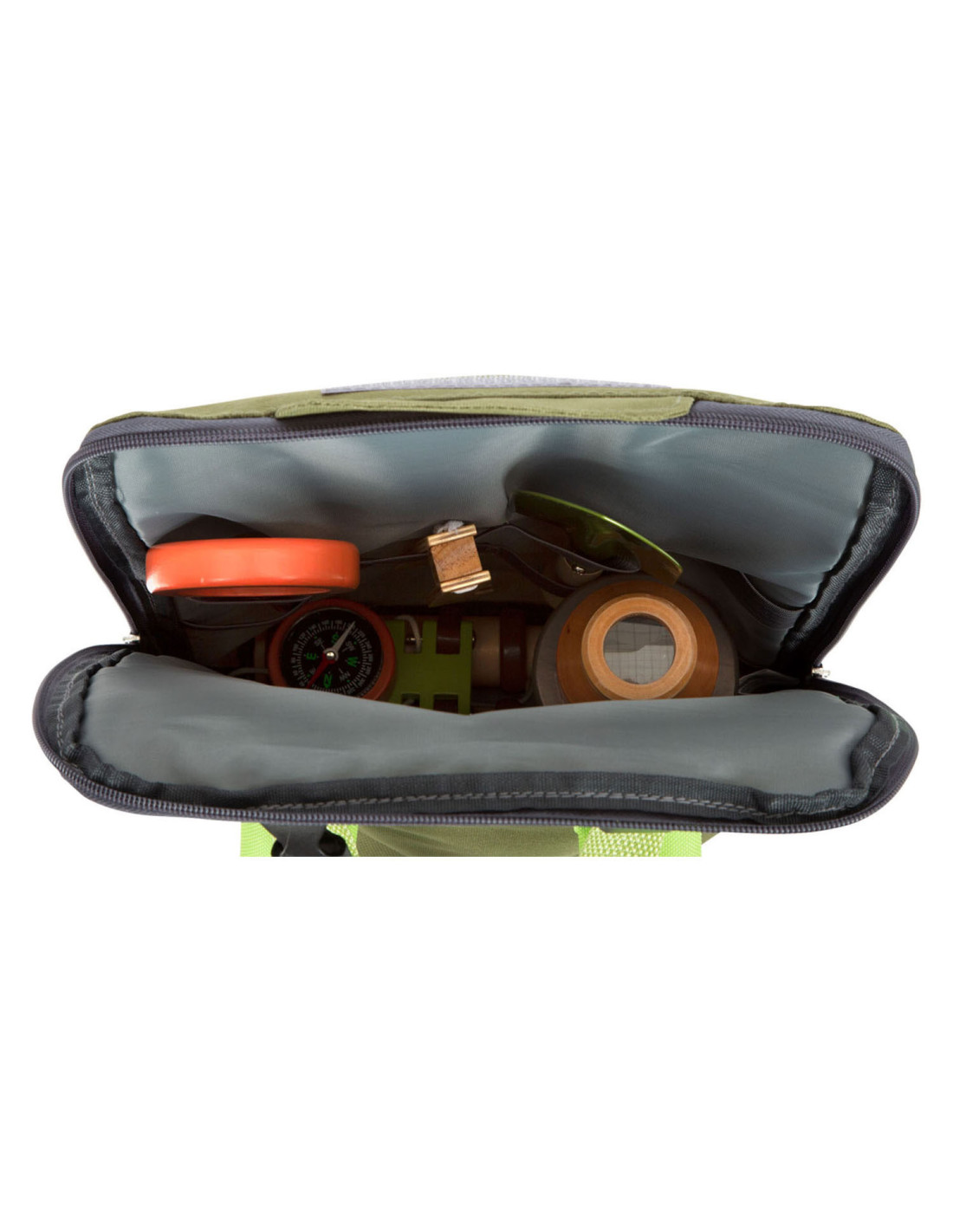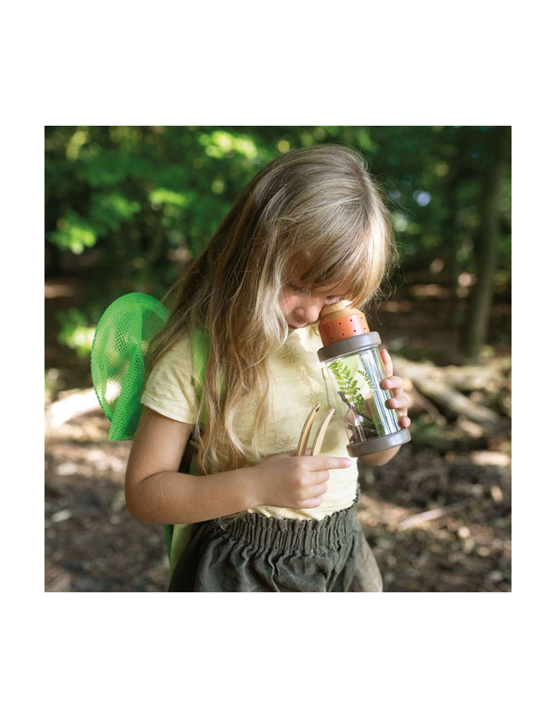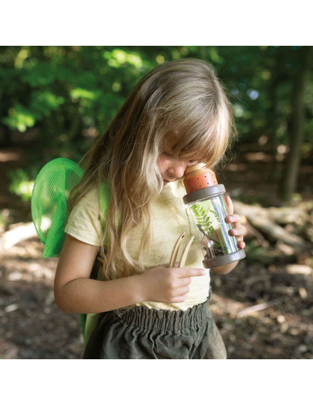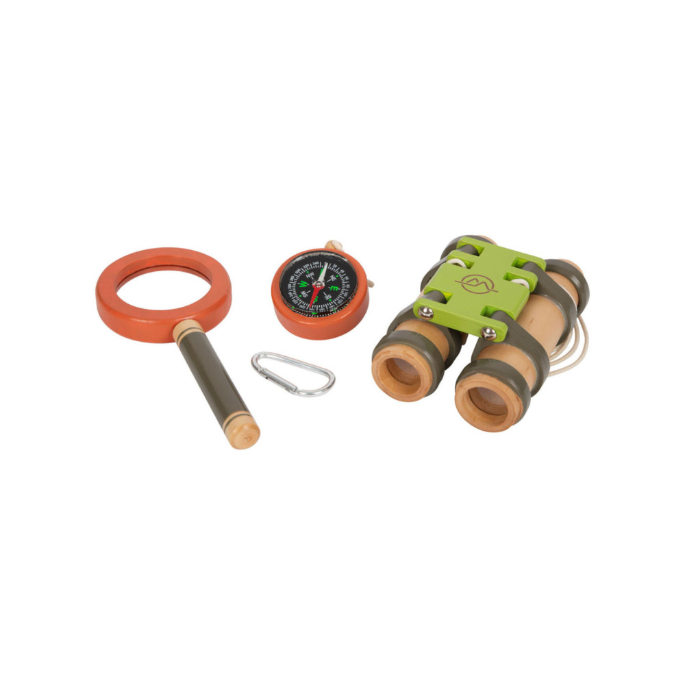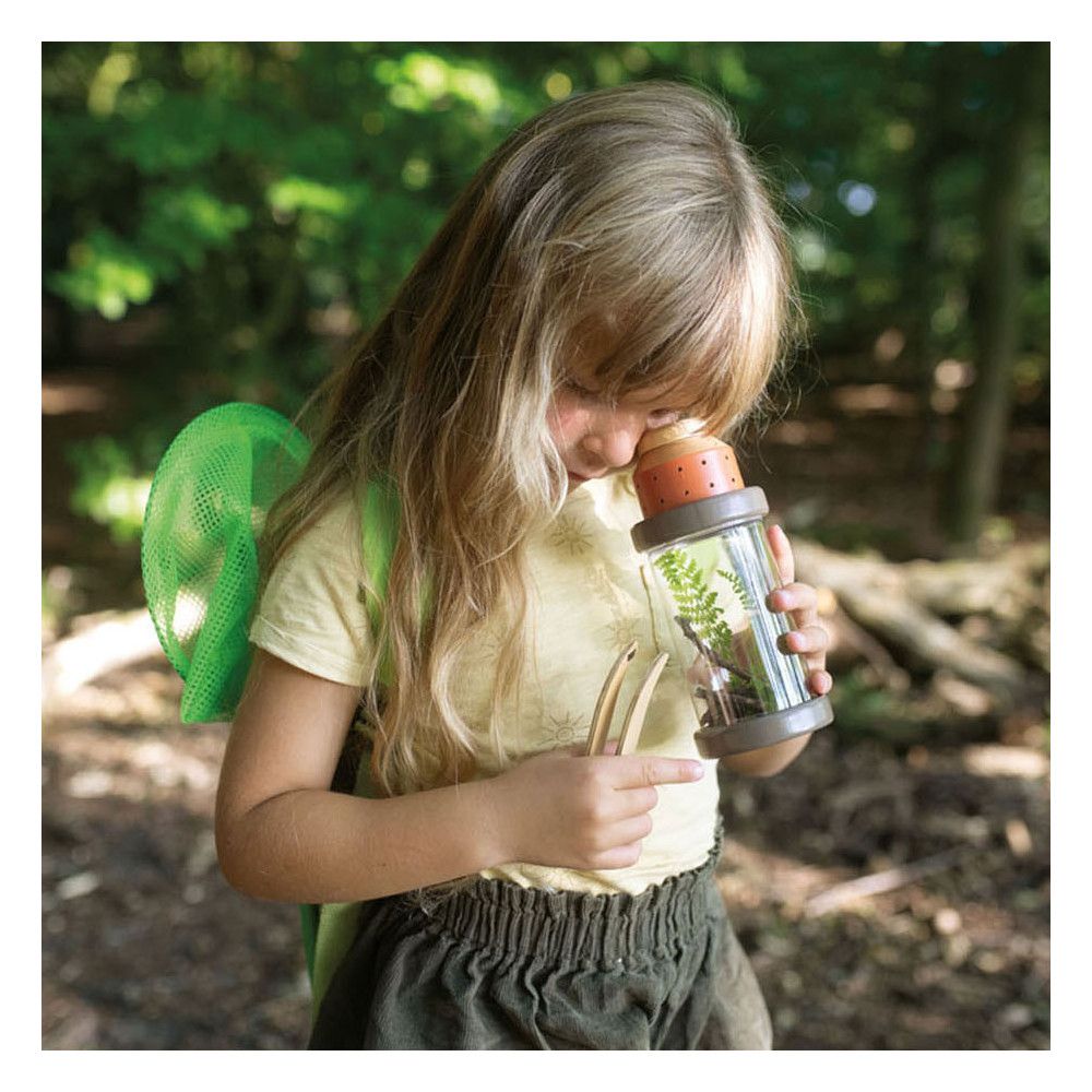 Avonturiers rugzak voor kinderen. Inhoud: insectenpot met schroefdeksel en geïntegreerd vergrootglas, houten verrekijker, insectennet met telescoopstok, kompas met draagkoord, vergrootglas met vergrotingsfunctie, pincet, schep en veerhaak. Afmetingen: rugzak ca. 27 x 10 x 14 cm, schepnet (uitgeschoven) lengte: ca. 85 cm, Ø ca. 20 cm. Geschikt voor kinderen vanaf 3 jaar oud.