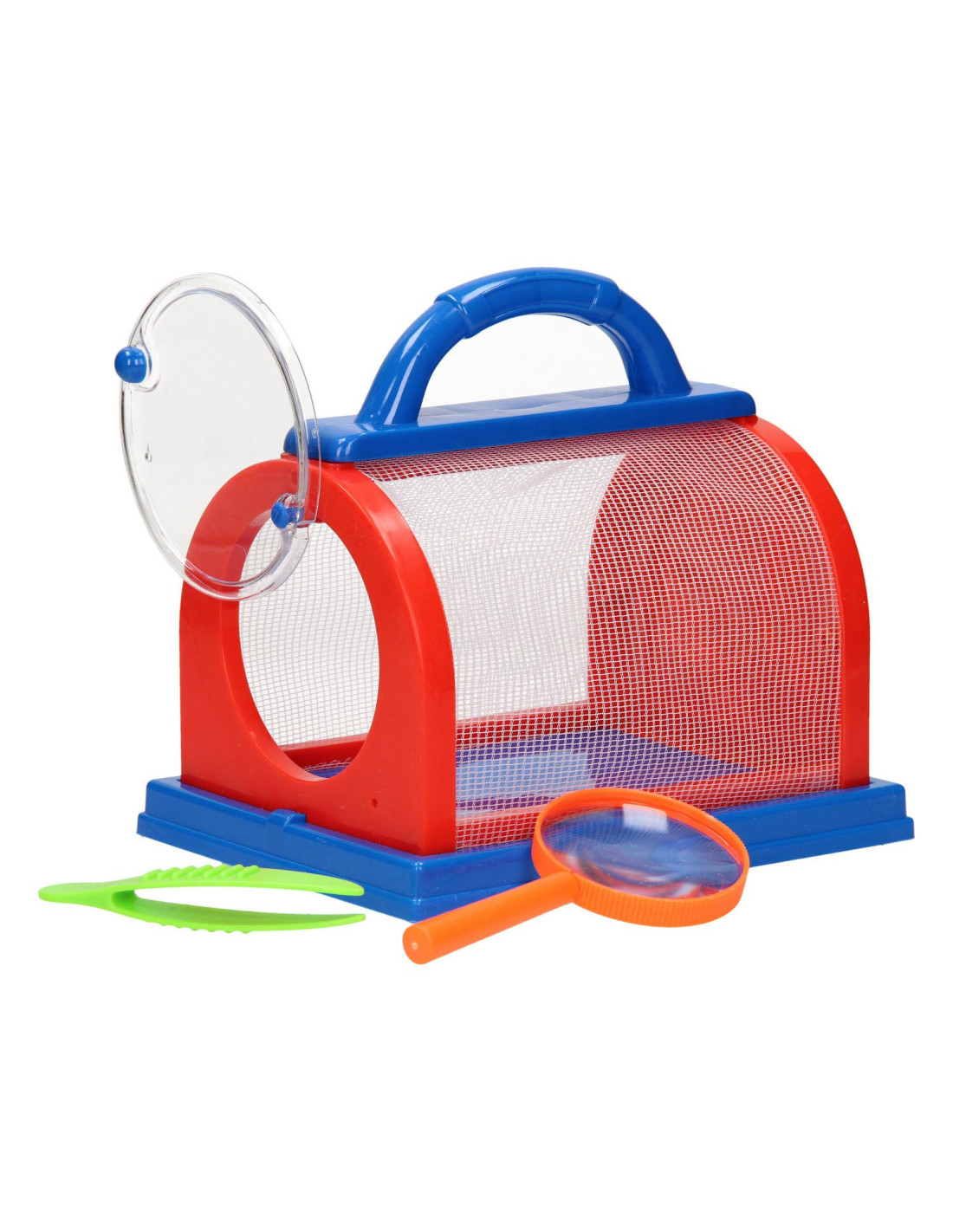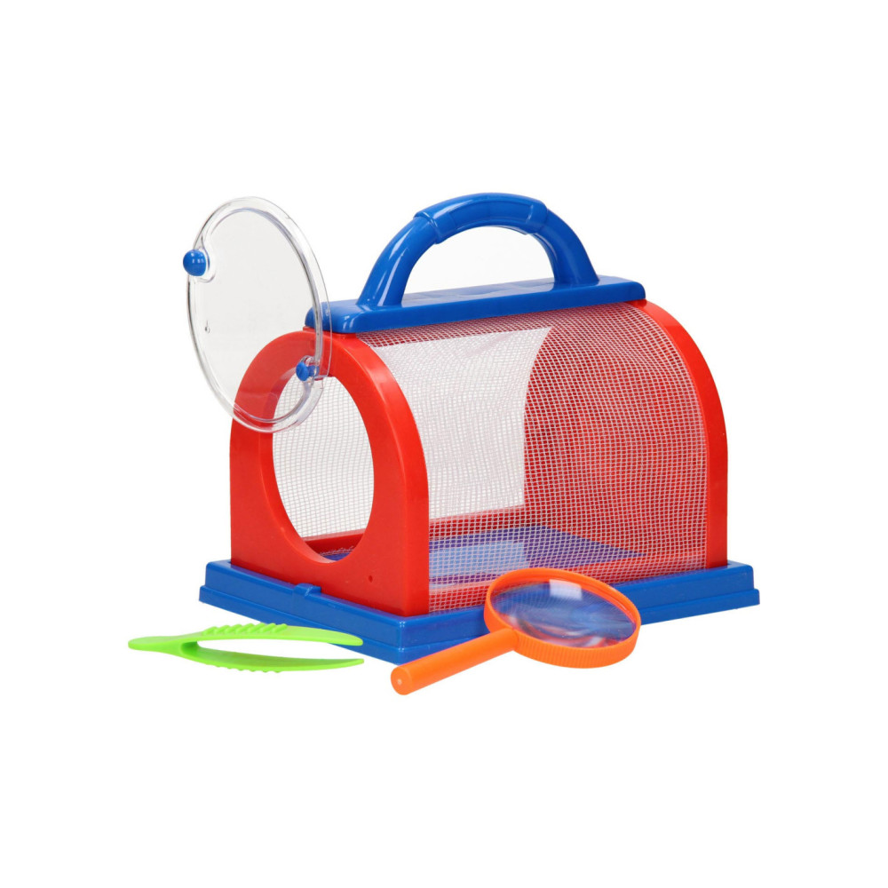 Insecten observatieset met observatiebakje, pincet en loep. Vang en bekijk kleine beestjes van heel dichtbij. Gemaakt van rood/blauw kunststof en geschikt voor kinderen vanaf 3 jaar.