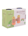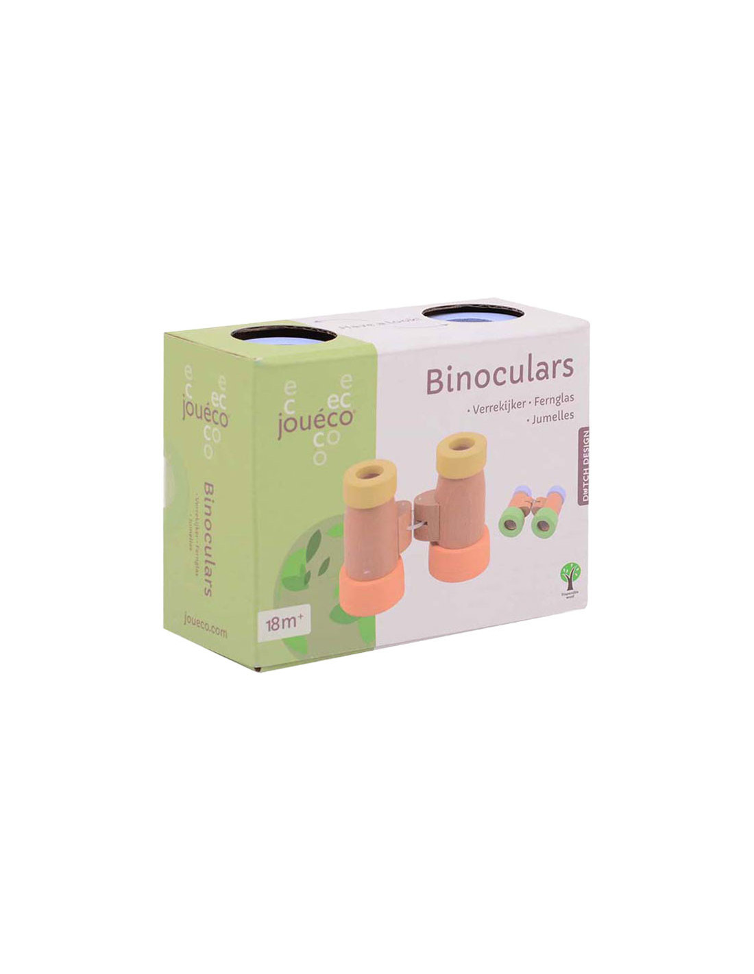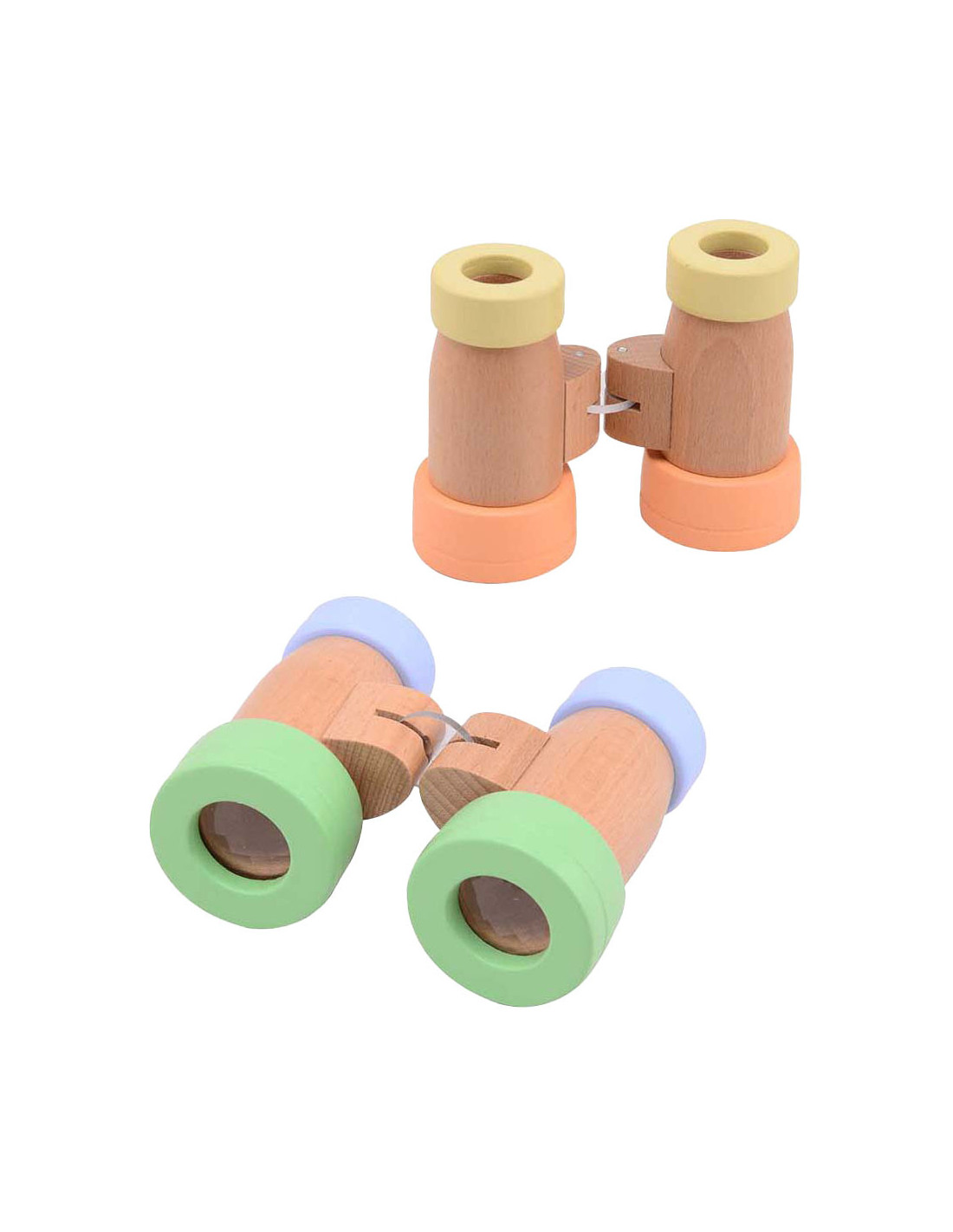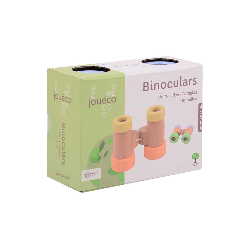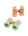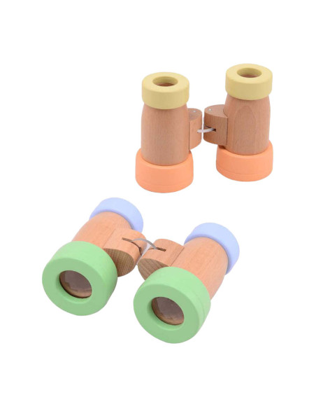 Houten verrekijker met facet ogen. Geschikt voor kinderen vanaf 18 maanden. De verrekijker is ongeveer 13 cm lang en gemaakt van hout in pastelkleuren.