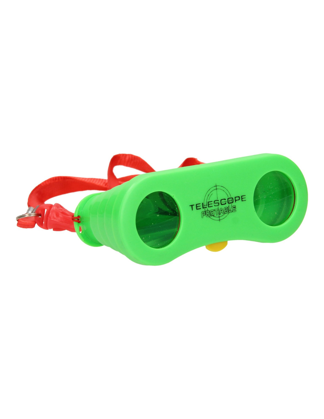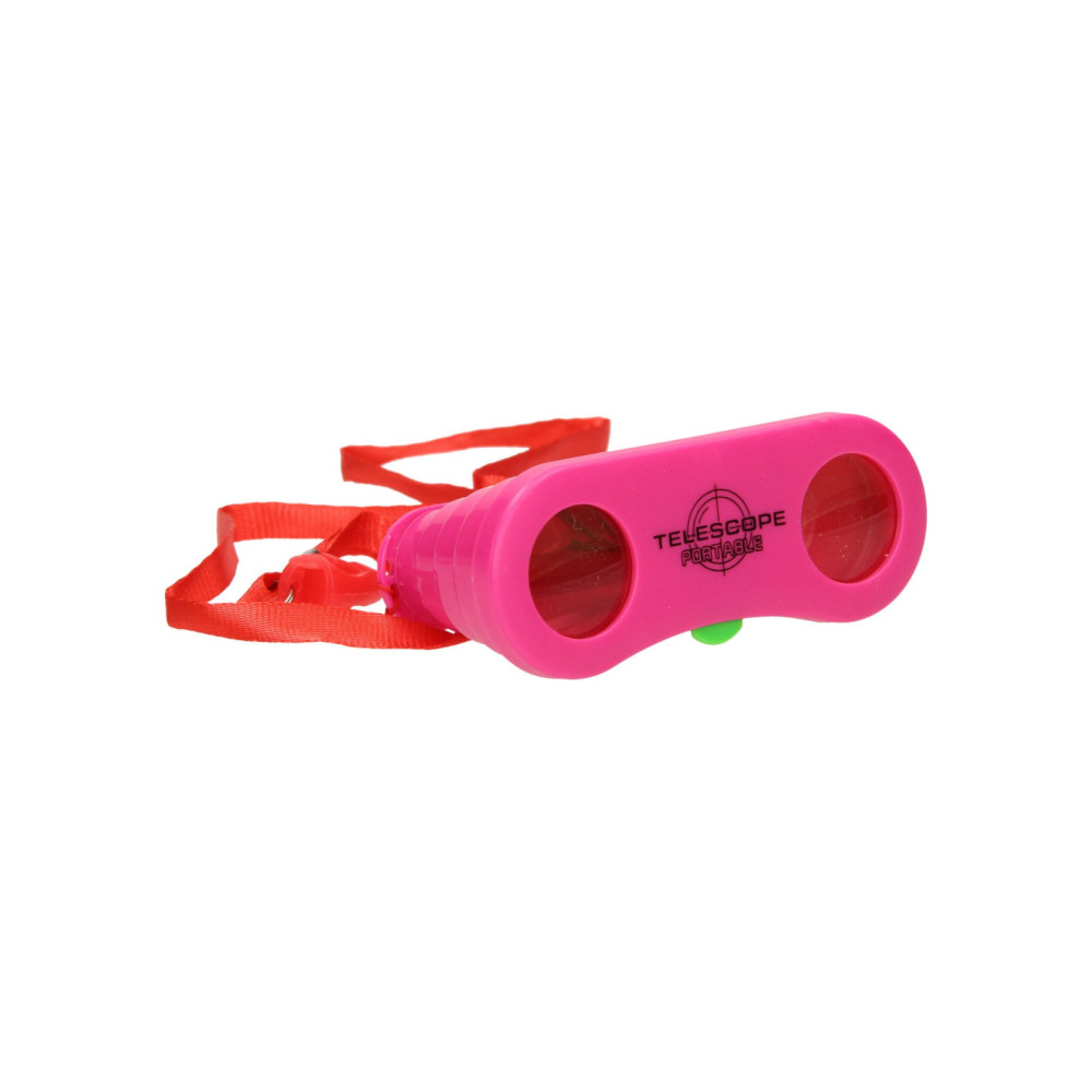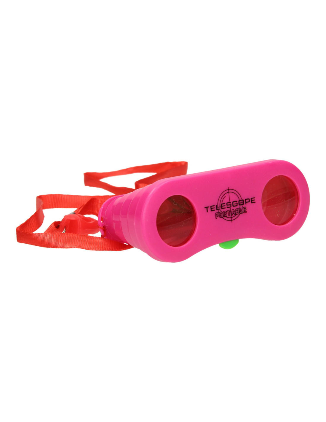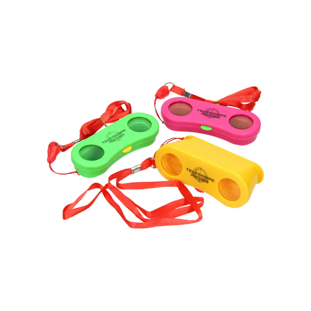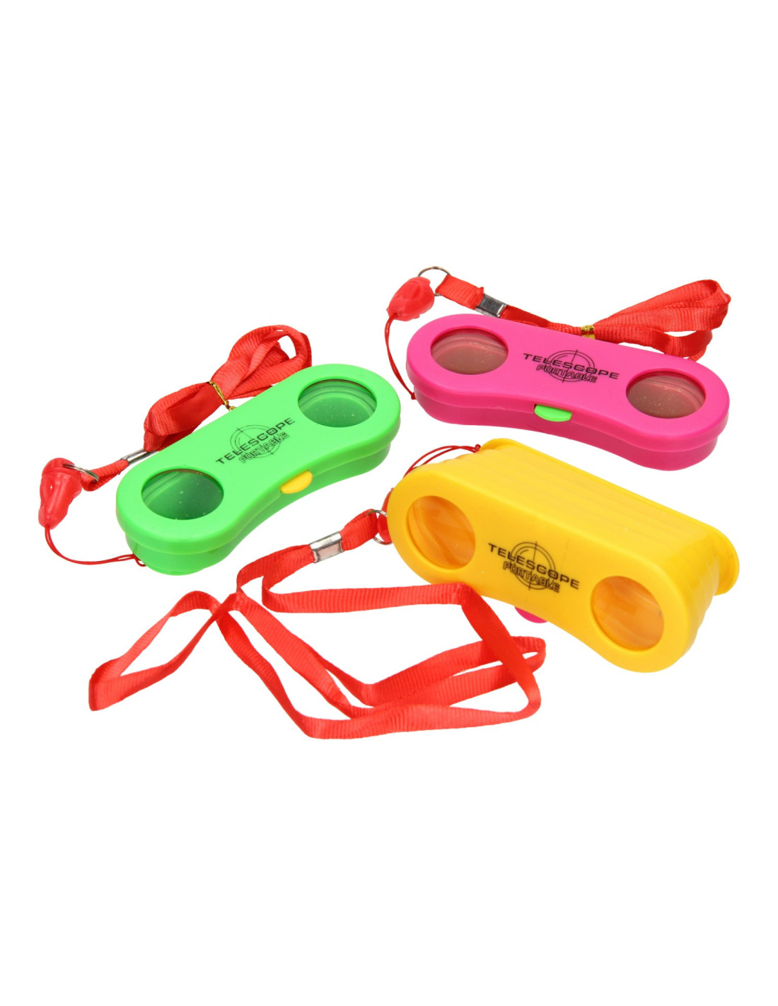 Druk op het knopje en zie hoe de verrekijker uitschuift! Klap hem weer in zodat hij minder ruimte inneemt en dus gemakkelijker mee te nemen is. Maak het koordje eraan, zodat je de verrekijker om je nek kan hangen. Gemaakt van kunststof. De verrekijker is 10 centimeter lang, 3 centimeter breed en 2 centimeter hoog.
