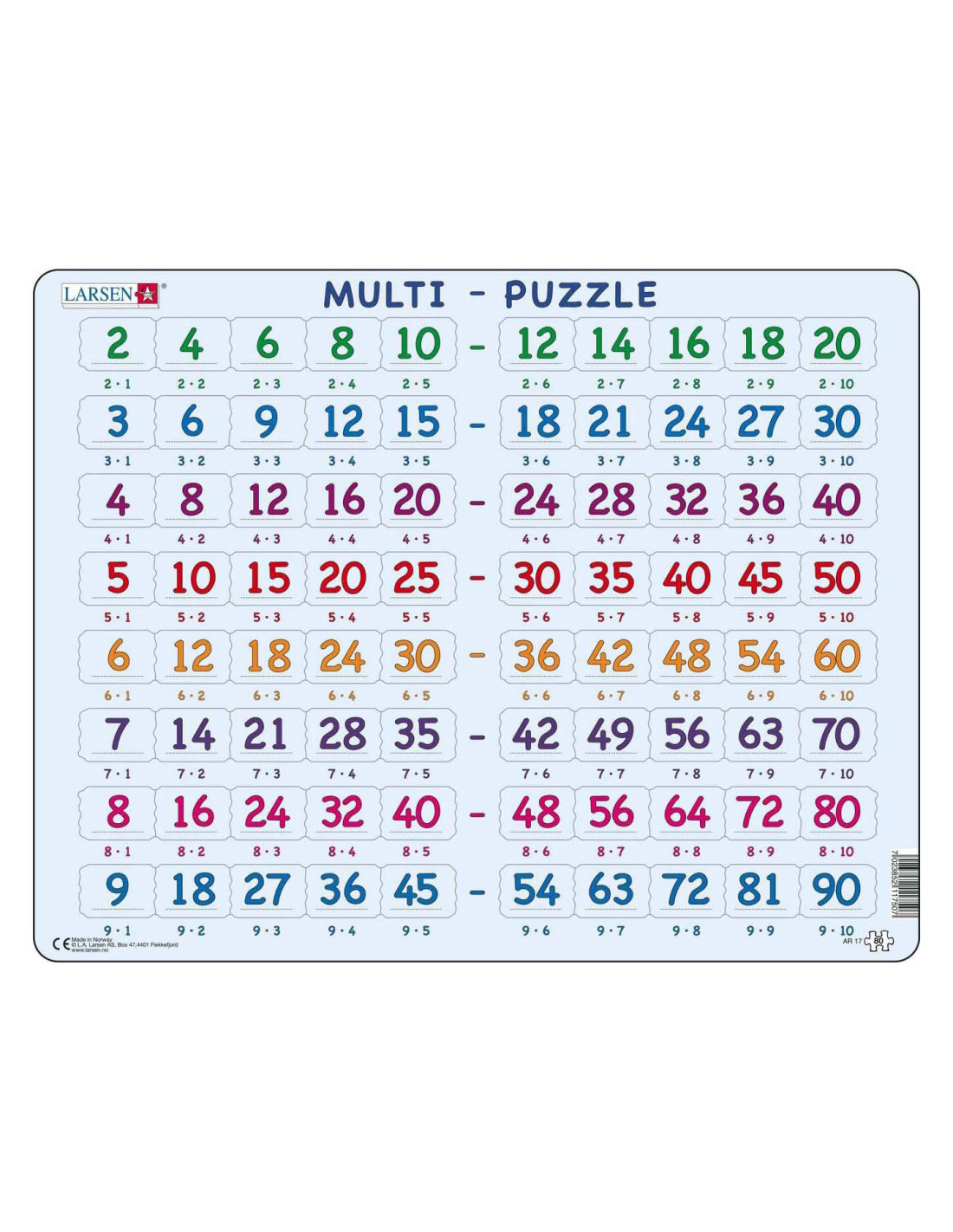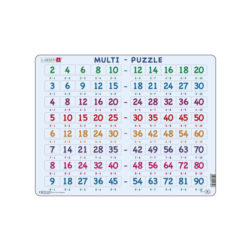 De puzzels van Larsen hebben een frame waarin de puzzelstukjes keer op keer makkelijk gelegd kunnen worden. De puzzelstukjes hebben elk een eigen unieke vorm die maar op één plek in het frame past. Doordat de totale dikte van het gerecyclede karton van de Larsen puzzels 4,4 mm dik is, gaat deze jaren mee. In het thema Larsen Educatieve Puzzels' zijn diverse educatieve frame puzzels beschikbaar. Biologie, wiskunde, aardrijkskunde, leren schrijven, leren klokkijken, etc. Waarom Larsen?- De jongste kinderen ontwikkelen hun motoriek met de unieke puzzelstukjes.- Ook oudere kinderen spelen en leren veel over interessante thema's. - Originele thema's moedigen de kinderen aan en helpen hen zich te concentreren. - Extra dikke en stevige puzzelstukjes. - Gemaakt in Europa van gerecycled karton.
