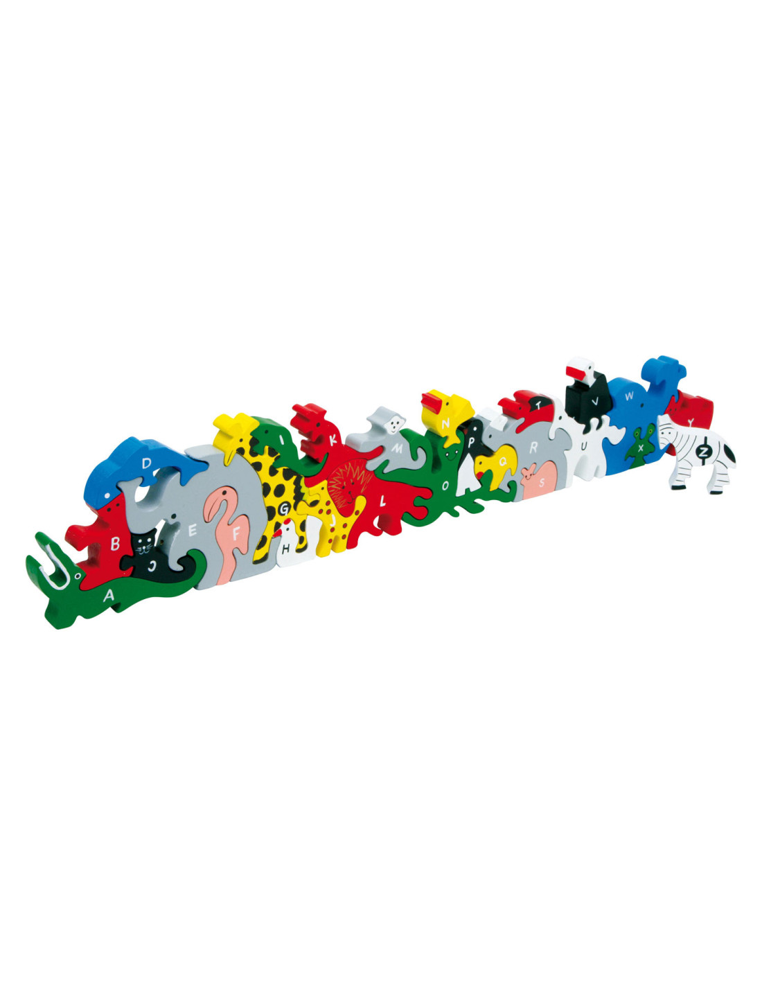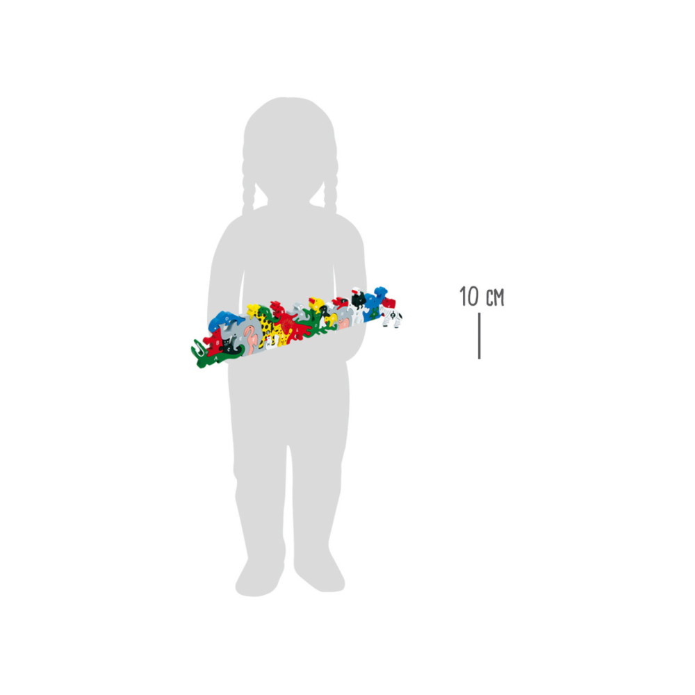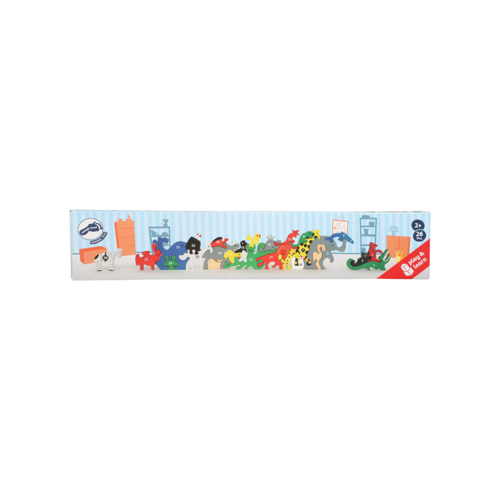 Wie lukt het om de houten dieren in de juiste volgorde in elkaar te zetten? Nummers van 1 - 26 aan de ene kant en het alfabet aan de andere kant helpen een beetje bij het spelen.
