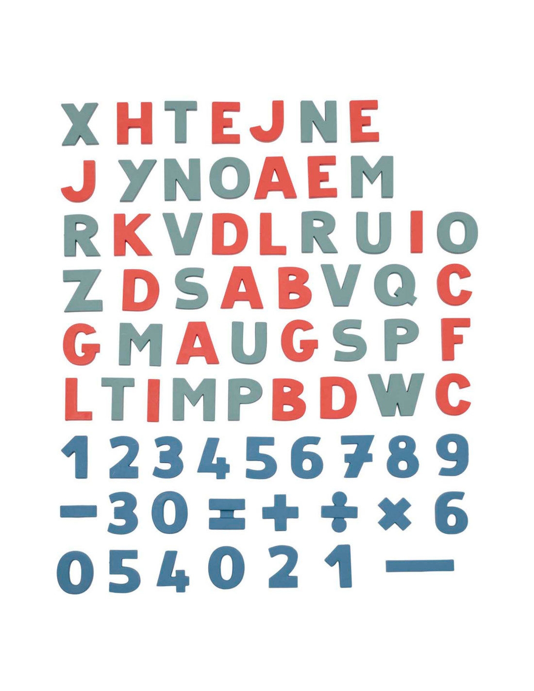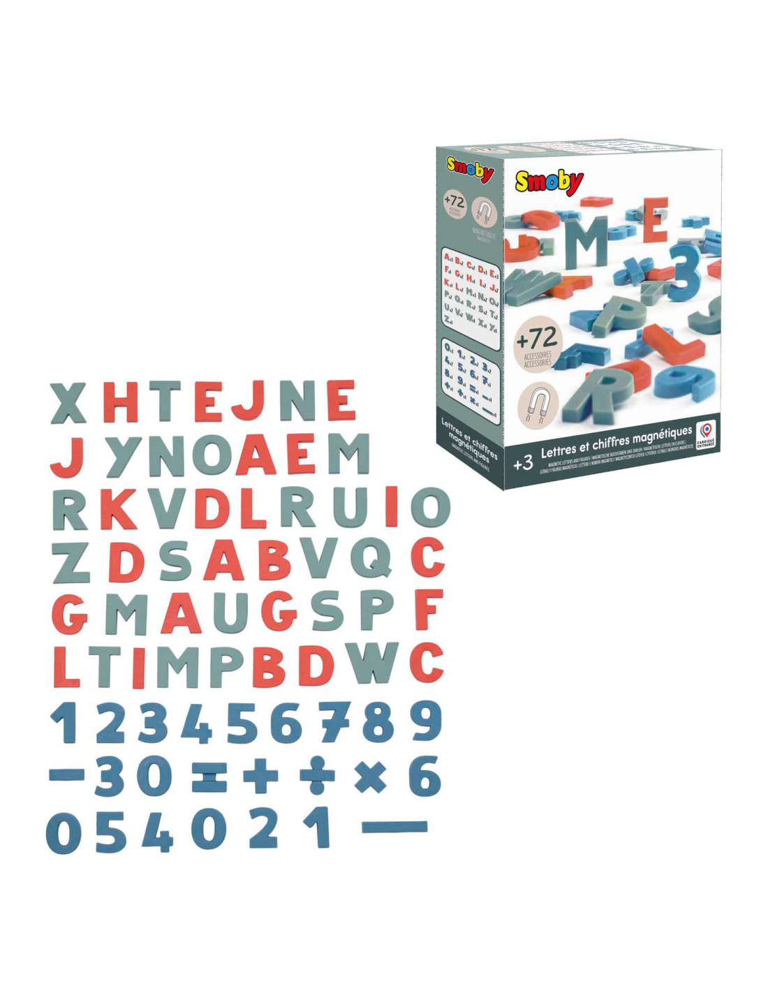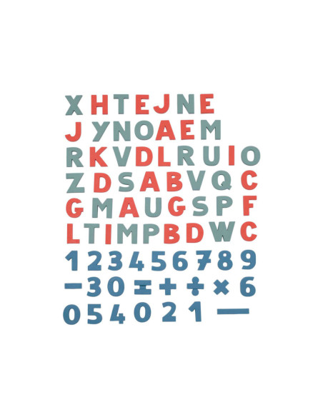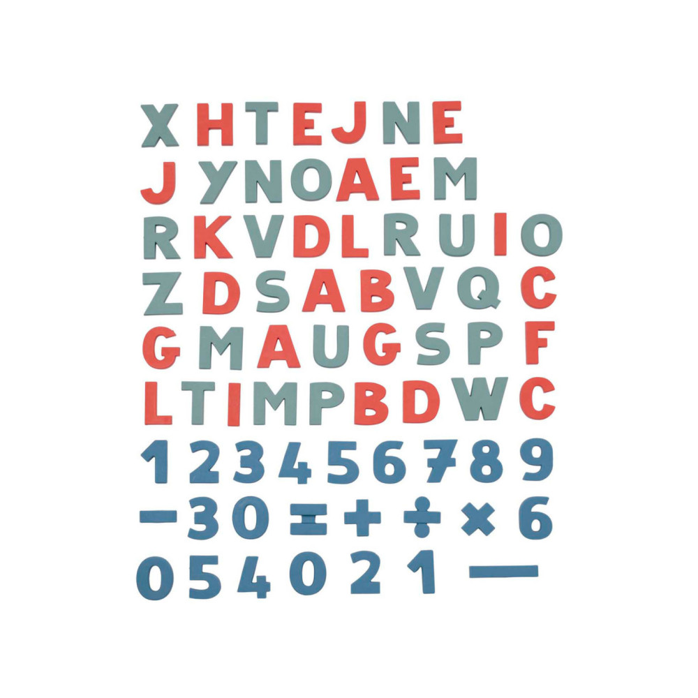Set van 72 magnetische letters en cijfers. De set bevat 24 rode letters, 24 groene letters en 24 blauwe cijfers en tekens. Geschikt voor kinderen vanaf 3 jaar.