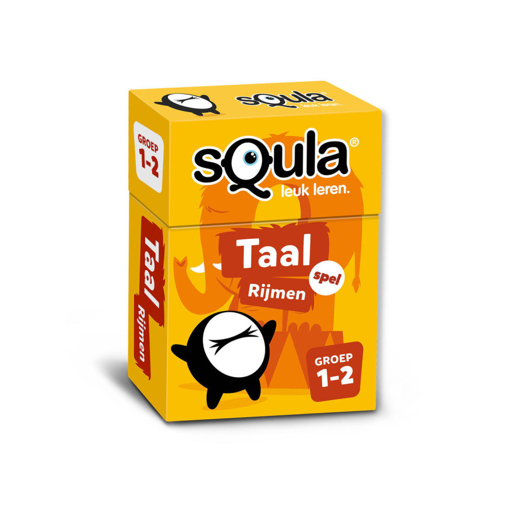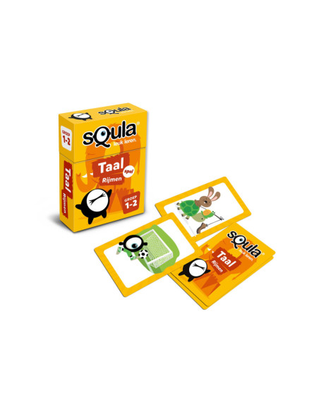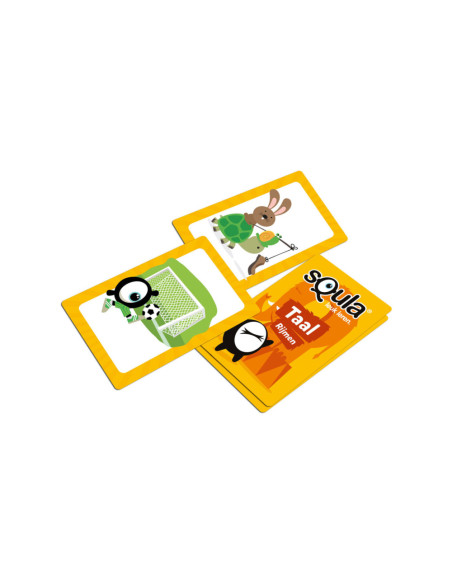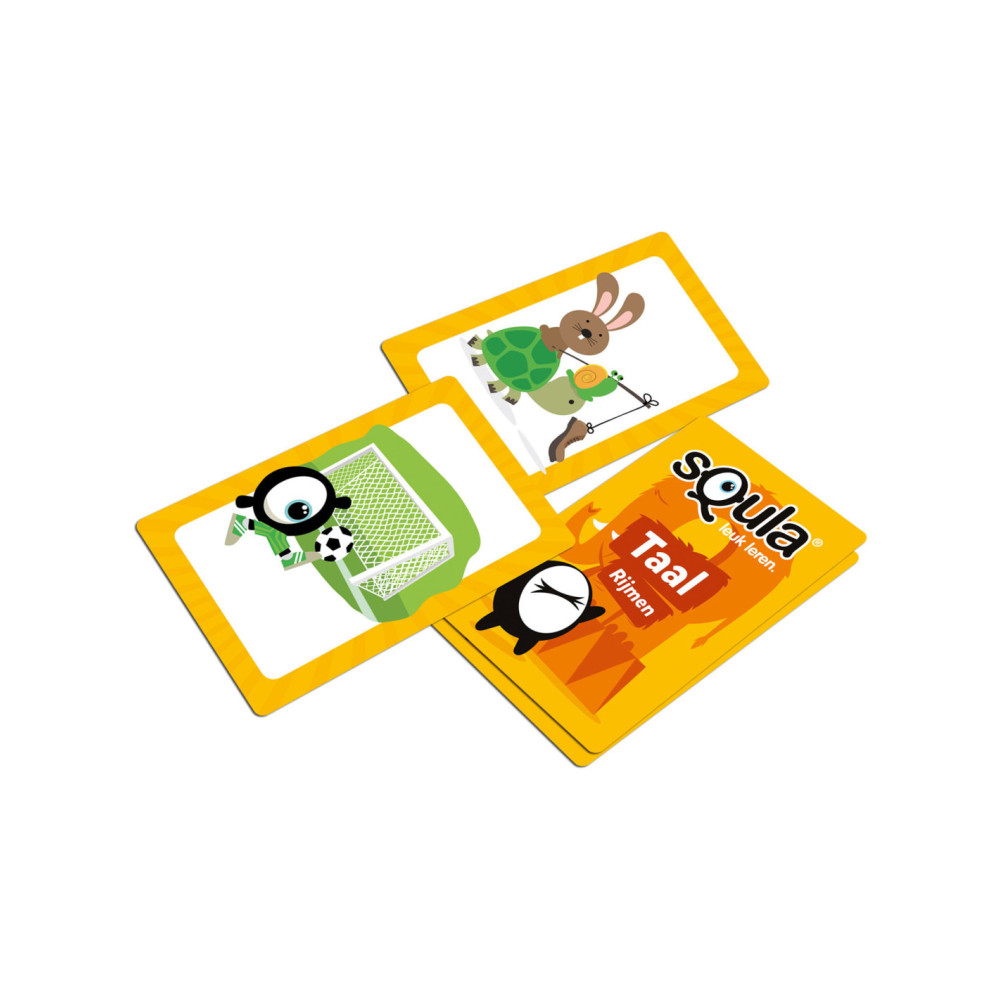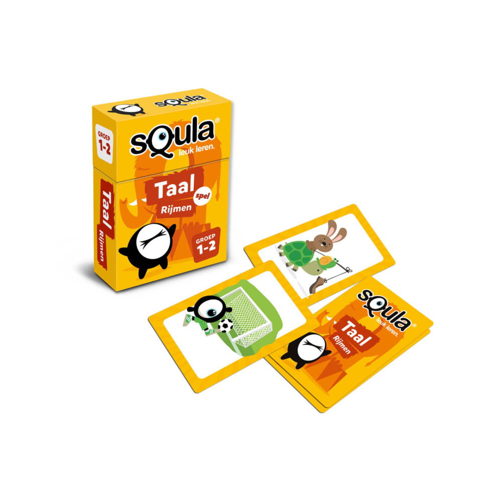 Squla. Leuk leren! Nu ook als kaartspel te spelen. In dit kaartspel ga je op zoek naar woorden die op elkaar rijmen. Je draait twee kaarten om en zoekt op elke kaart iets wat op elkaar rijmt, waarbij je je fantasie mag gebruiken. Er is dus niet één oplossing of 'juiste' combinatie maar er zijn juist vele mogelijkheden. Spaar zoveel mogelijk setjes en win! Geschikt voor kinderen in groep 1 - 2.
