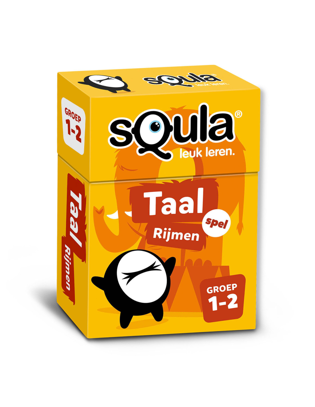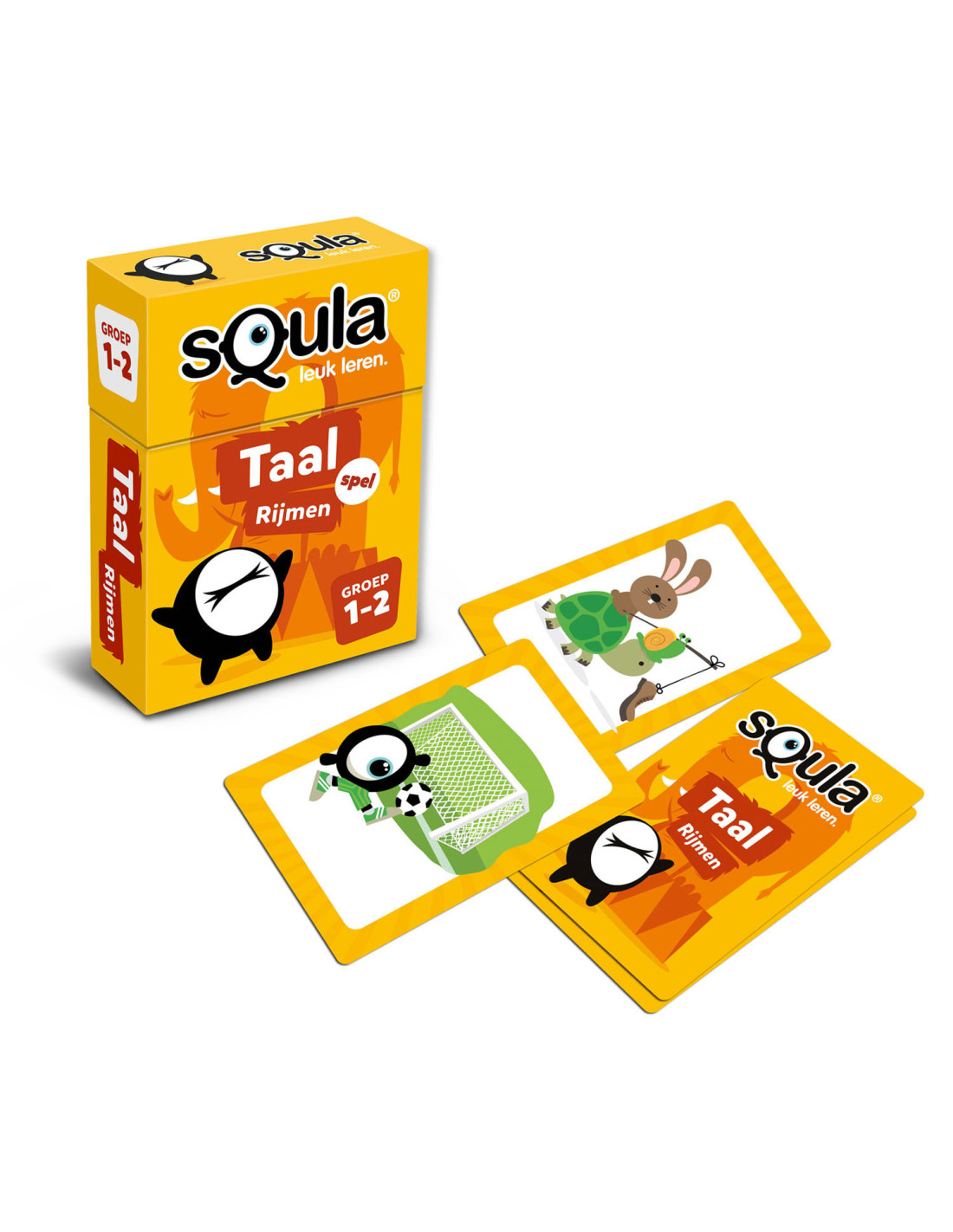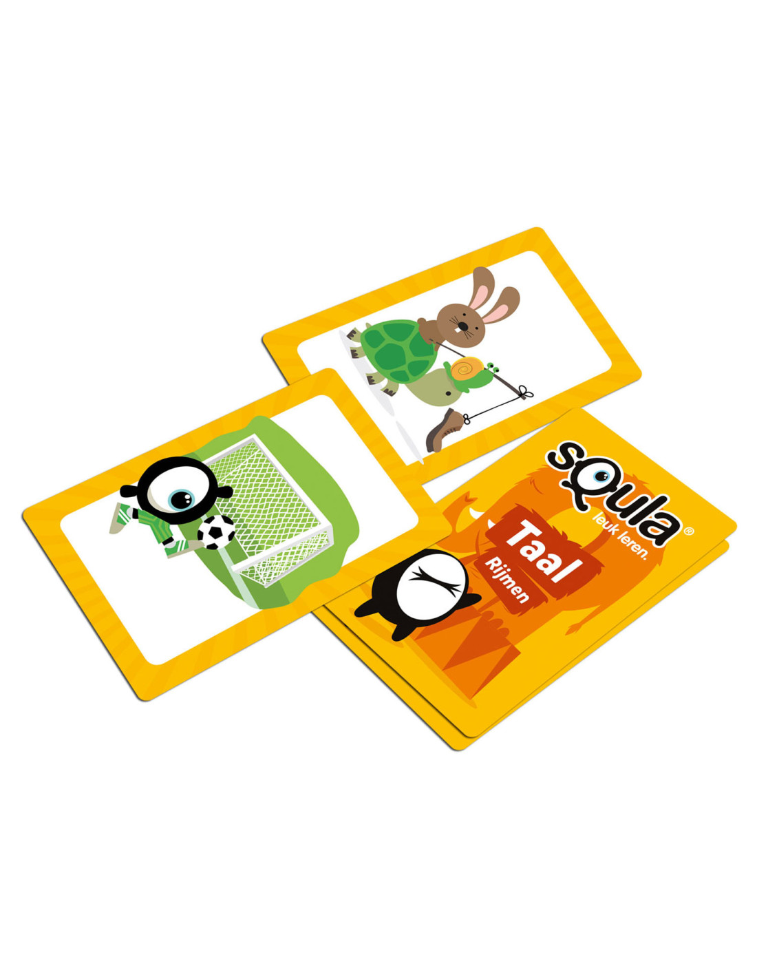Squla. Leuk leren! Nu ook als kaartspel te spelen. In dit kaartspel ga je op zoek naar woorden die op elkaar rijmen. Je draait twee kaarten om en zoekt op elke kaart iets wat op elkaar rijmt, waarbij je je fantasie mag gebruiken. Er is dus niet één oplossing of 'juiste' combinatie maar er zijn juist vele mogelijkheden. Spaar zoveel mogelijk setjes en win! Geschikt voor kinderen in groep 1 - 2.