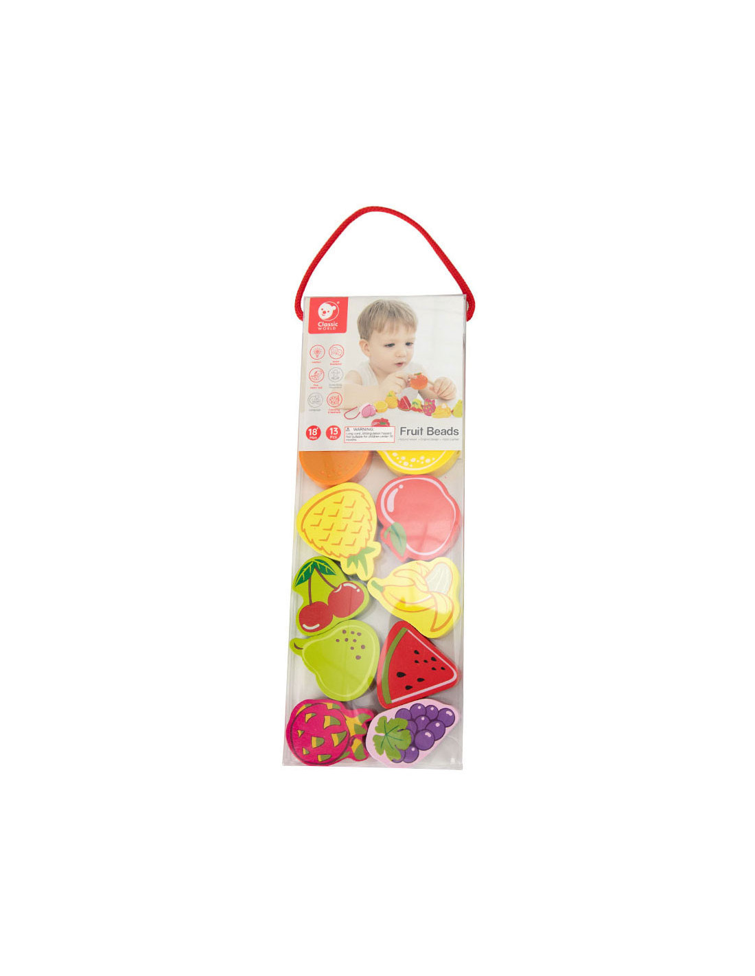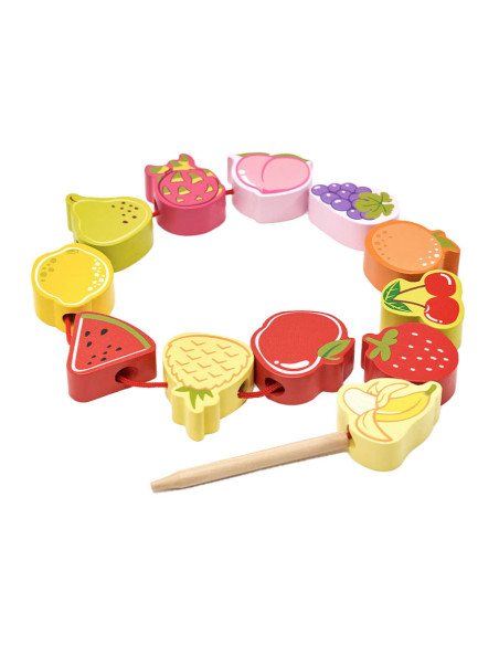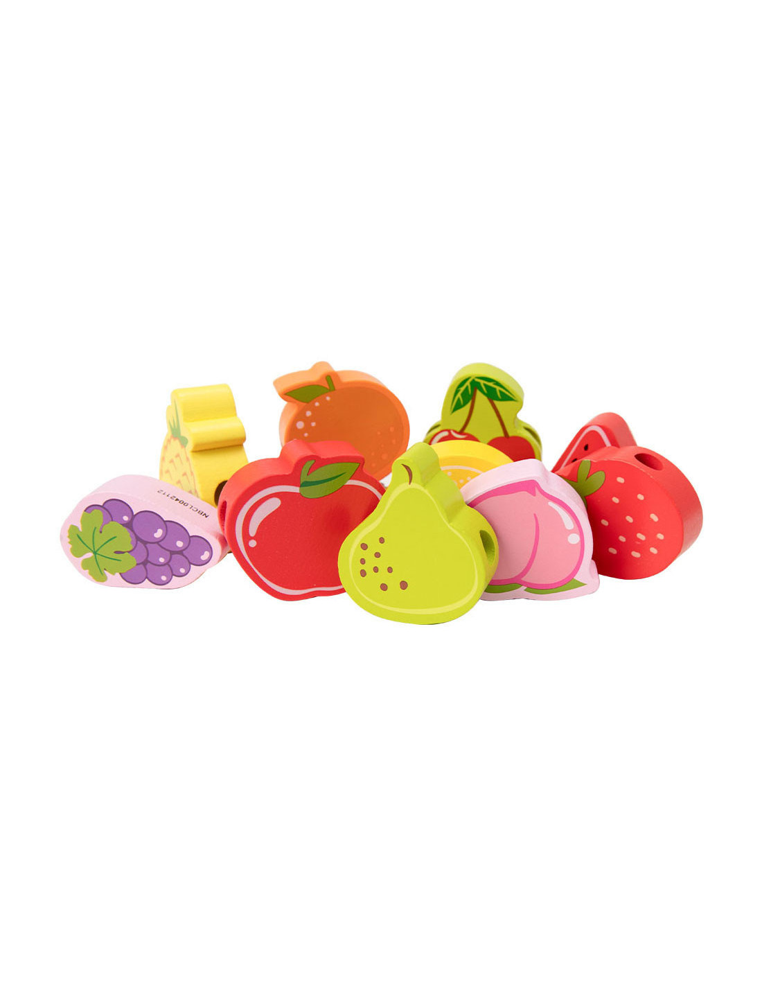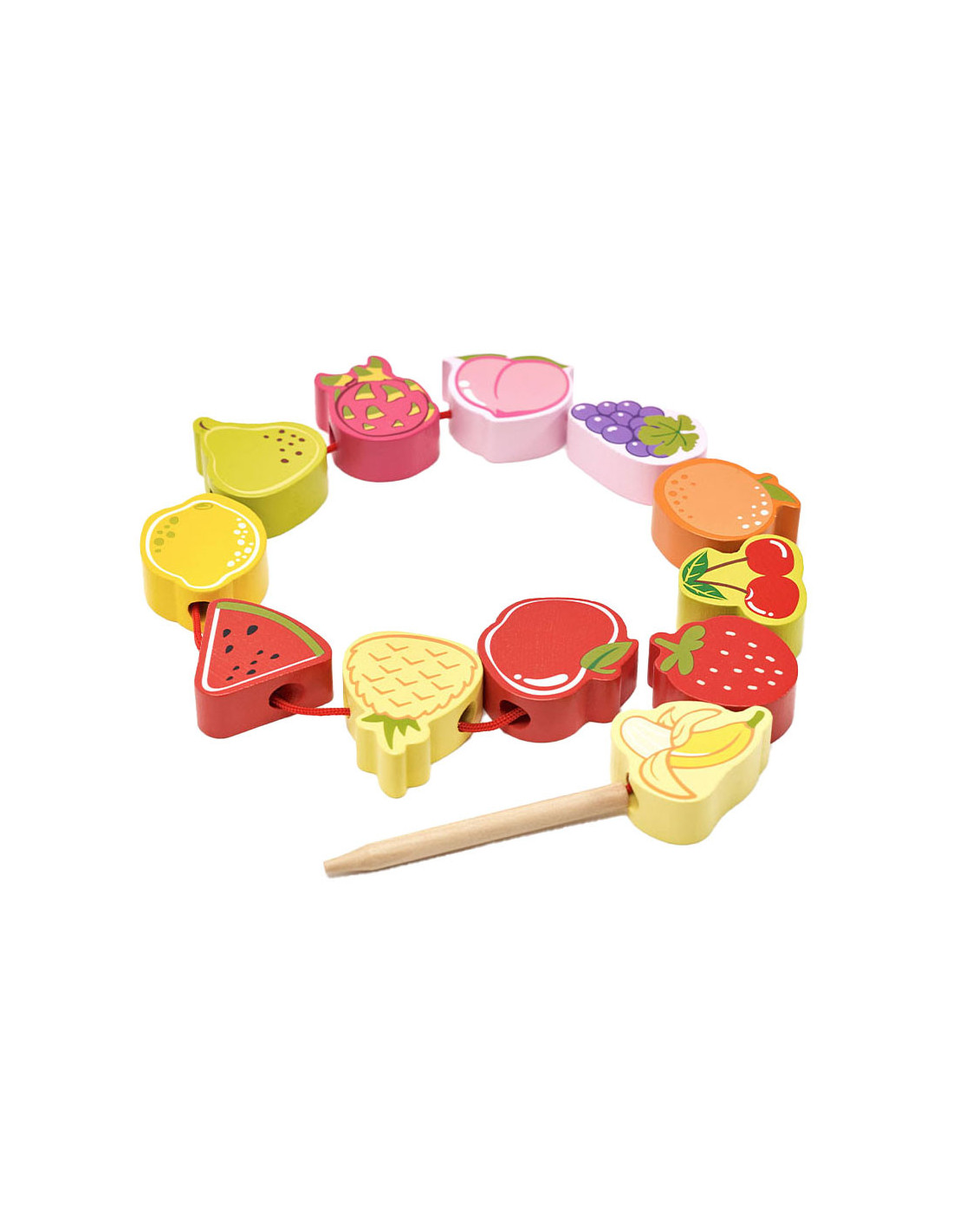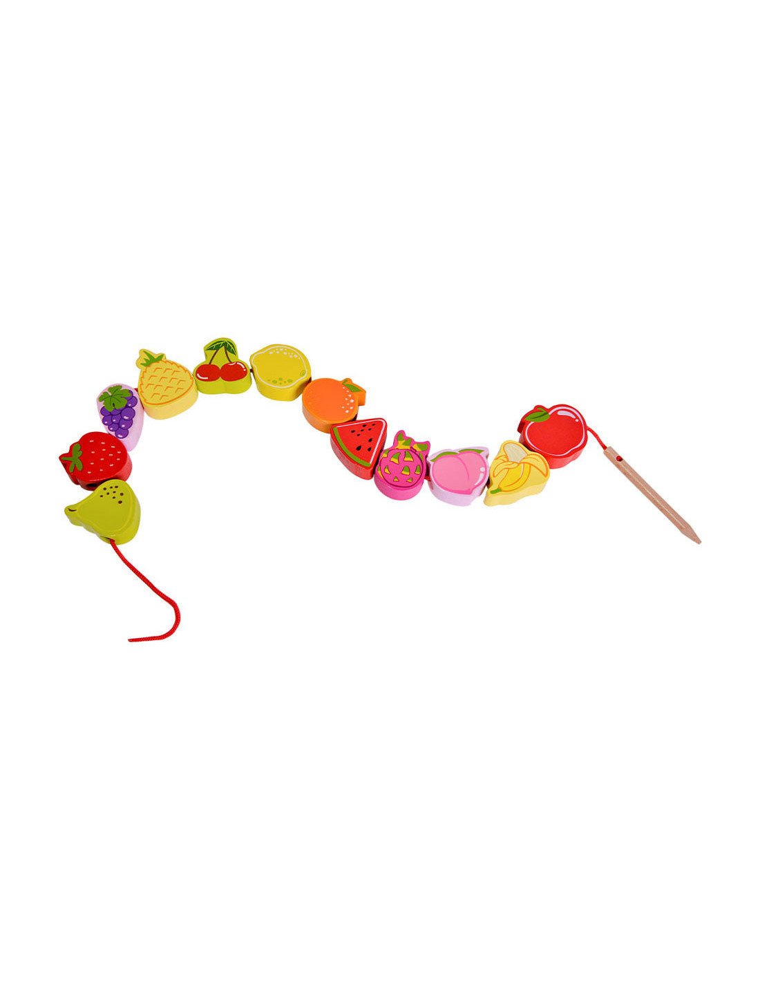 Houten rijgkralen met de opdruk van verschillende soorten fruit. De set bestaat uit 13 houten kralen bedruk met fruit soorten, een koord met houten staafje en opbergzakje. Geschikt voor kinderen vanaf 18 maanden.
