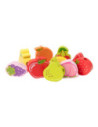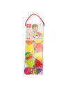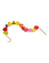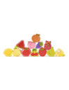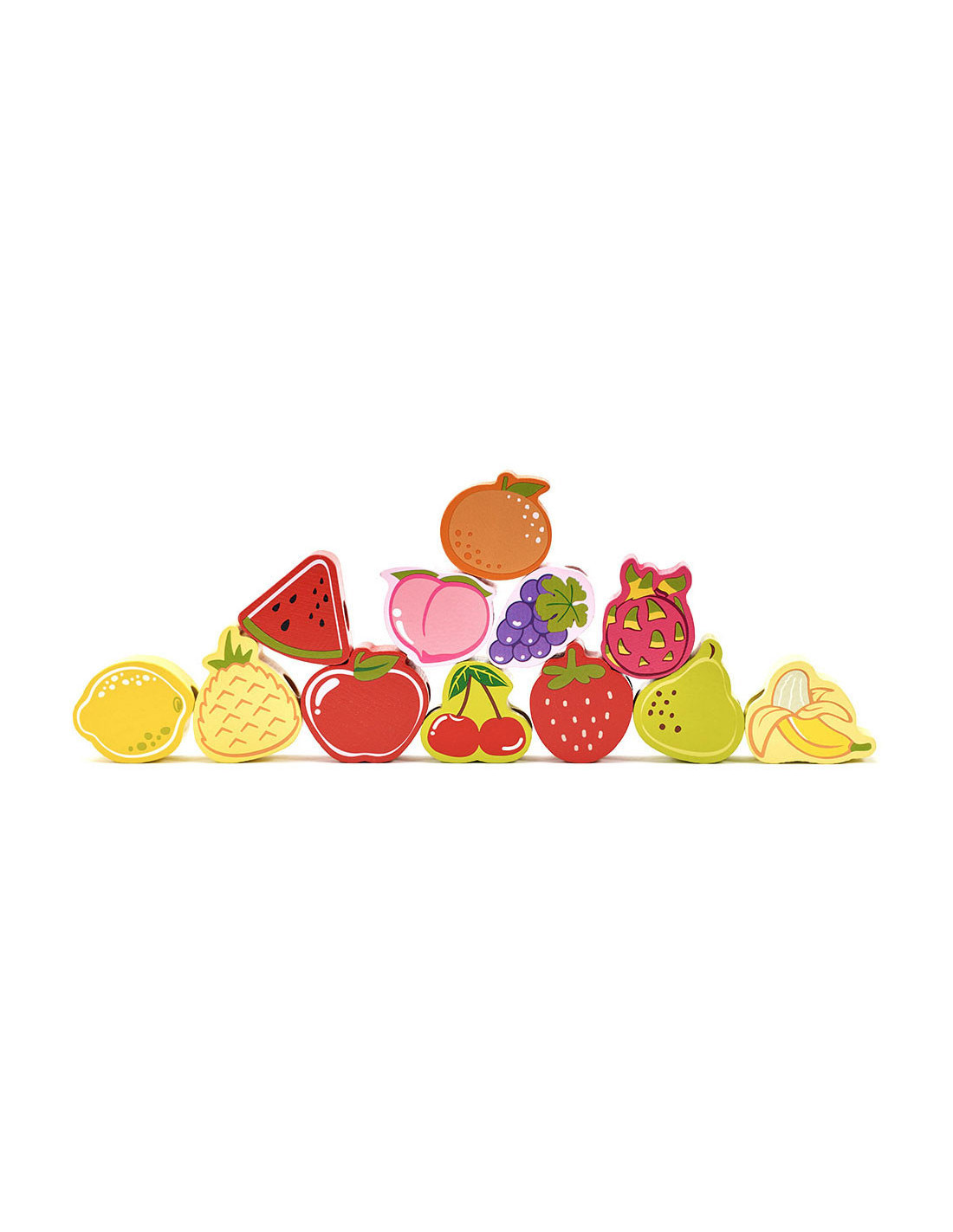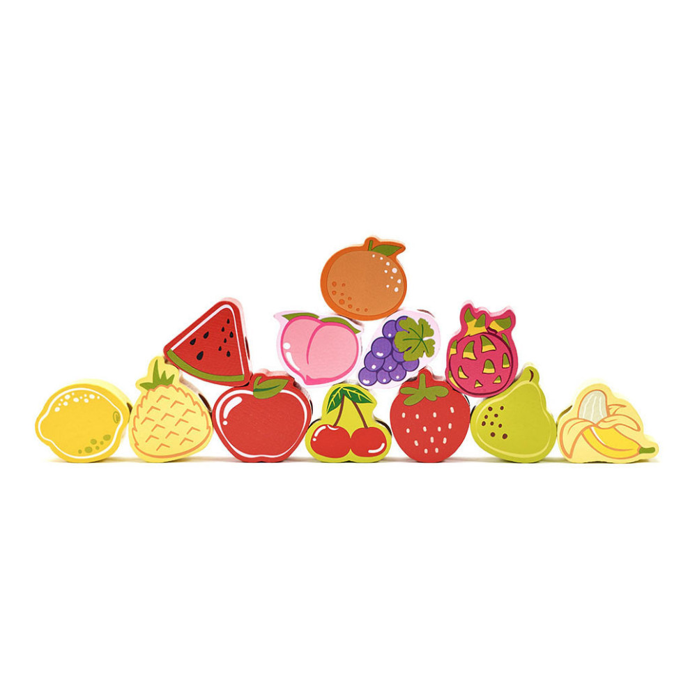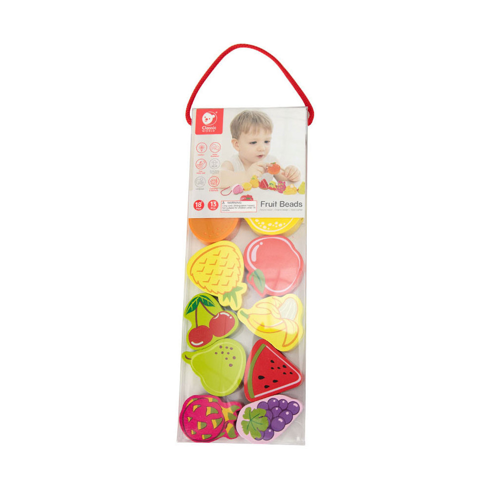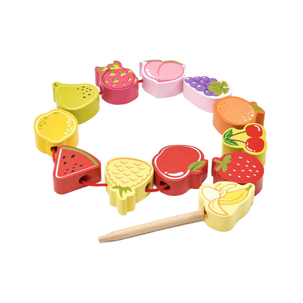 Houten rijgkralen met de opdruk van verschillende soorten fruit. De set bestaat uit 13 houten kralen bedruk met fruit soorten, een koord met houten staafje en opbergzakje. Geschikt voor kinderen vanaf 18 maanden.