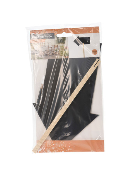 Krijtbord in pijlvorm op houten stok. Hoogte: 50 centimeter.