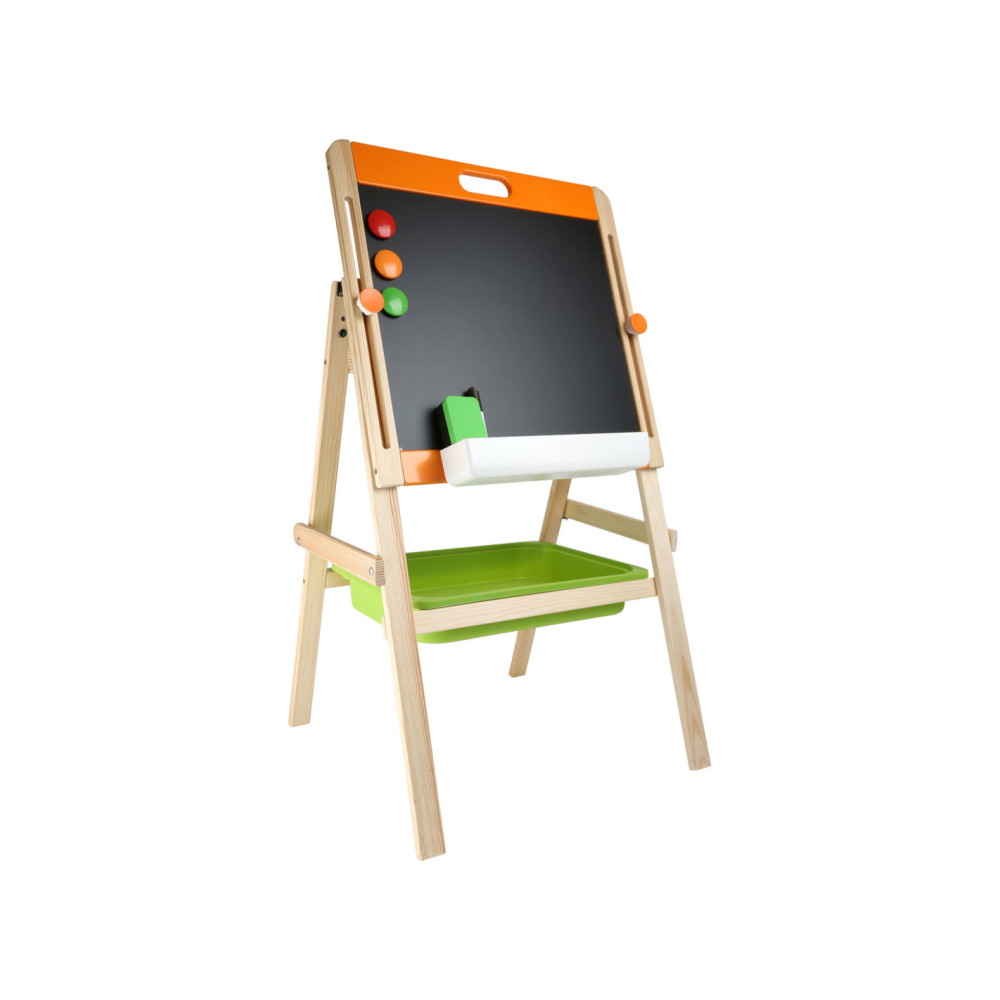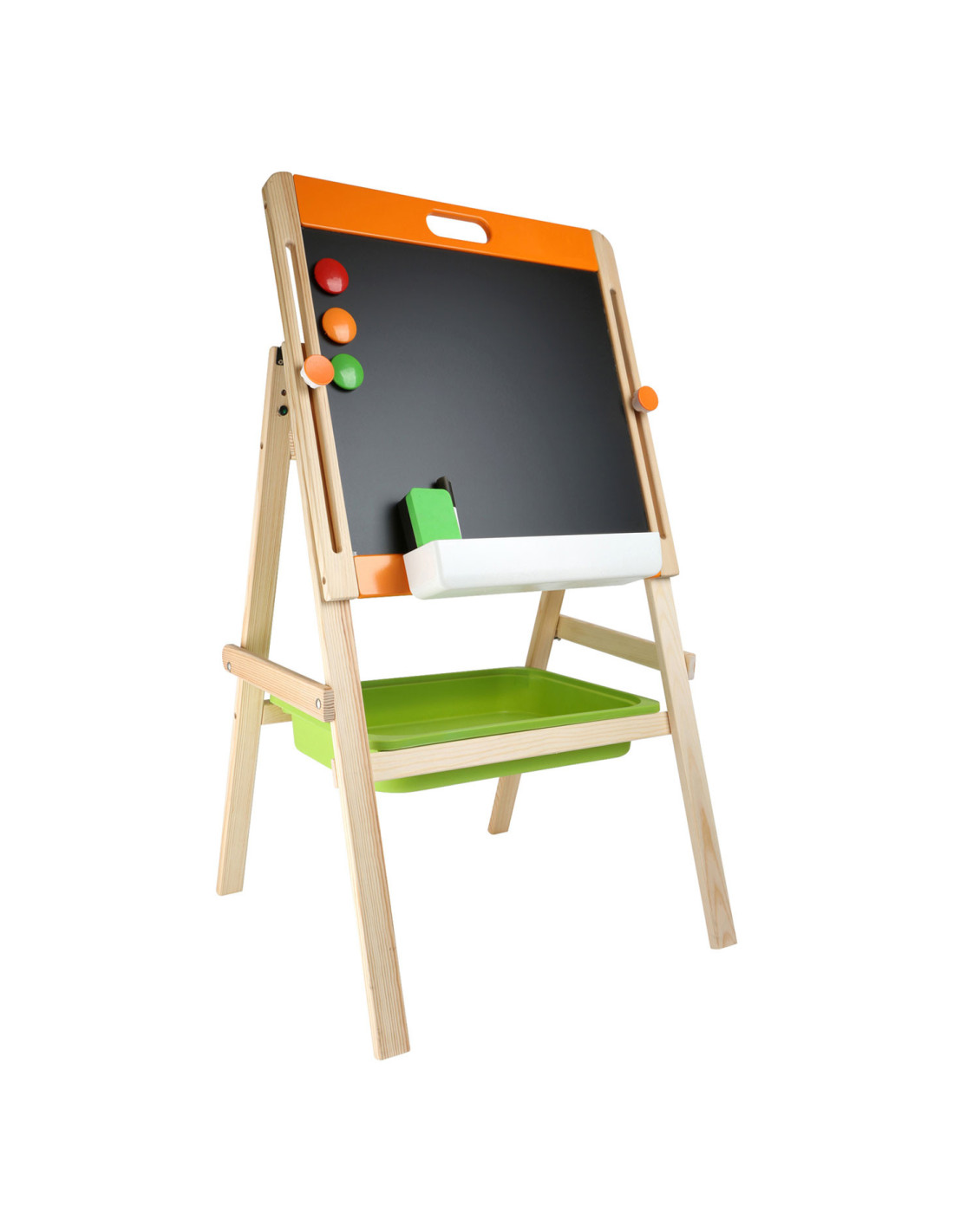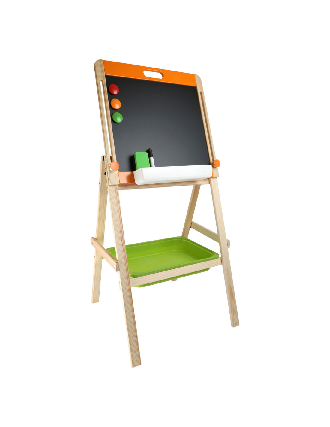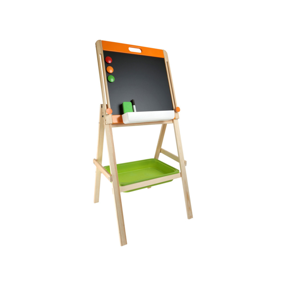 Dit schrijfbord heeft verschillende oppervlakken voor krijt en viltstiften. Het kan ook worden gebruikt voor magneten. De aanhaakbare groene box kan worden gebruikt voor opslag. De afstandhouders op de poten zijn handig voor een stabiele houvast. Inclusief spons, krijt, viltstift en vier magneten.