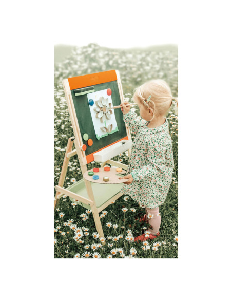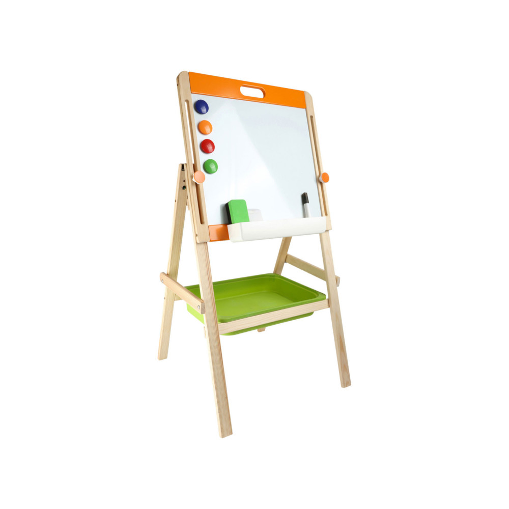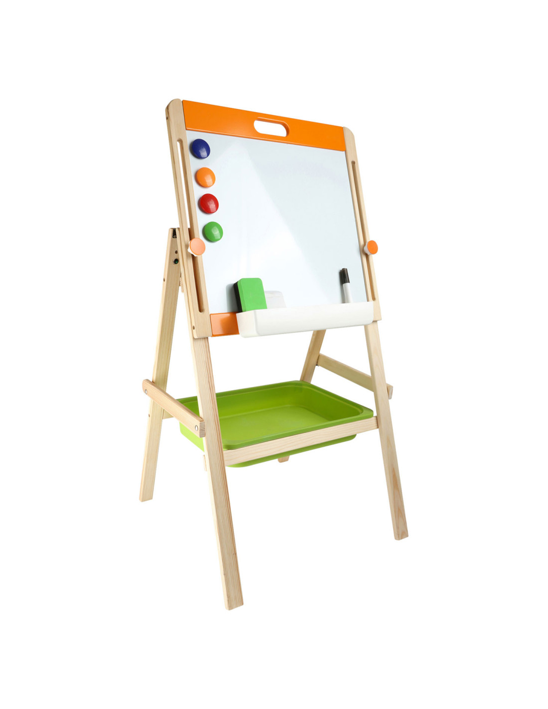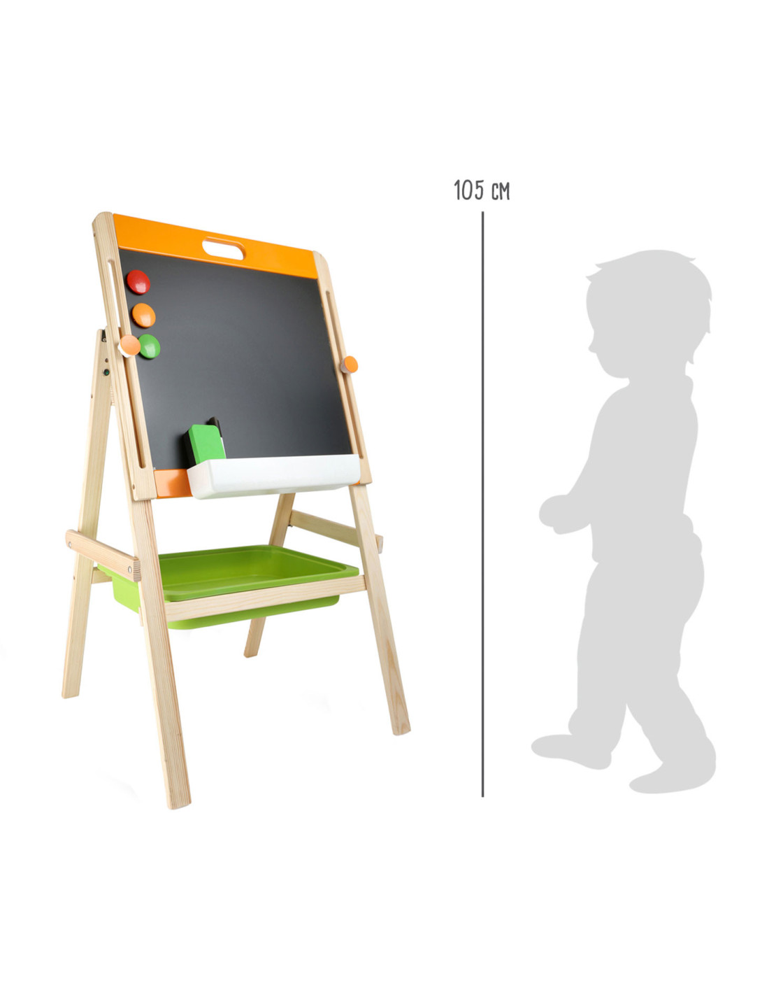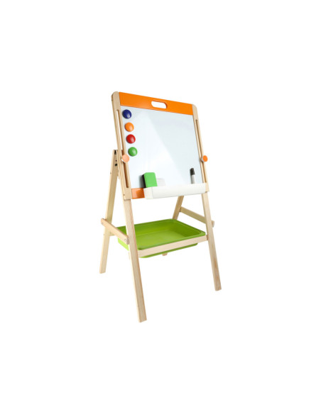 Dit schrijfbord heeft verschillende oppervlakken voor krijt en viltstiften. Het kan ook worden gebruikt voor magneten. De aanhaakbare groene box kan worden gebruikt voor opslag. De afstandhouders op de poten zijn handig voor een stabiele houvast. Inclusief spons, krijt, viltstift en vier magneten.