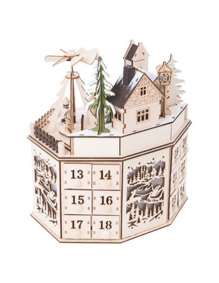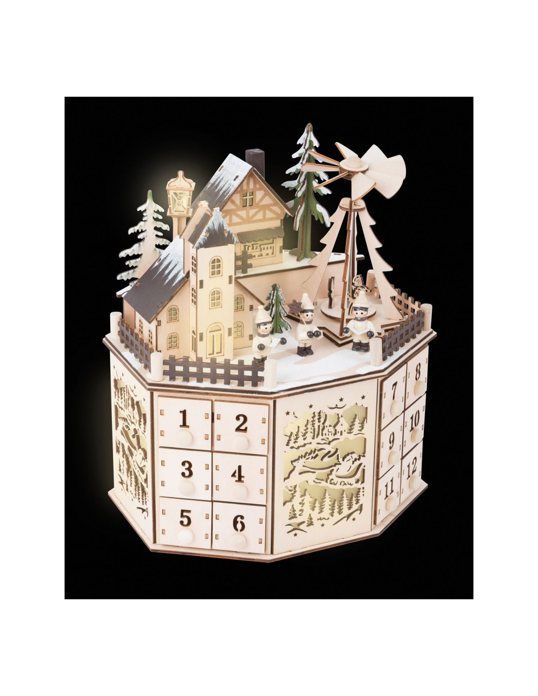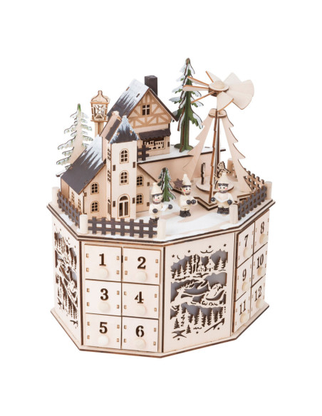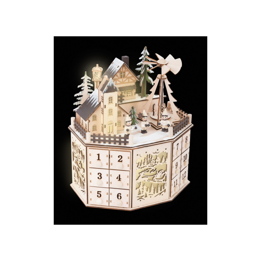 Een dromerig kerstlandschap! Deze fijn gedetailleerde adventskalender maakt indruk met het prachtige design van de verlichte, historische huizen en de elektrisch aangedreven kerstpiramide. Vier kersthoutsnijwerken zijn in scène gezet met een verlichte matglazen look. Een adventskalender die zeker ieders aandacht zal trekken.