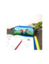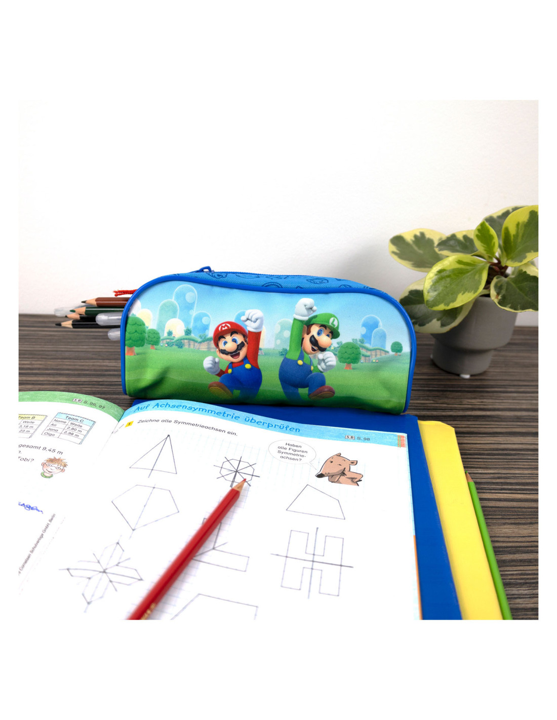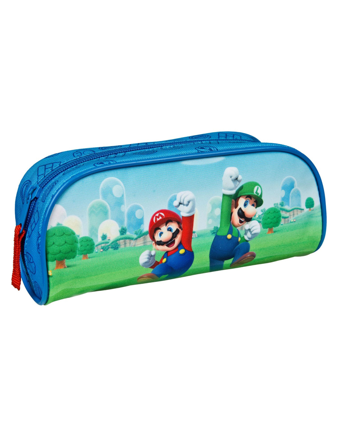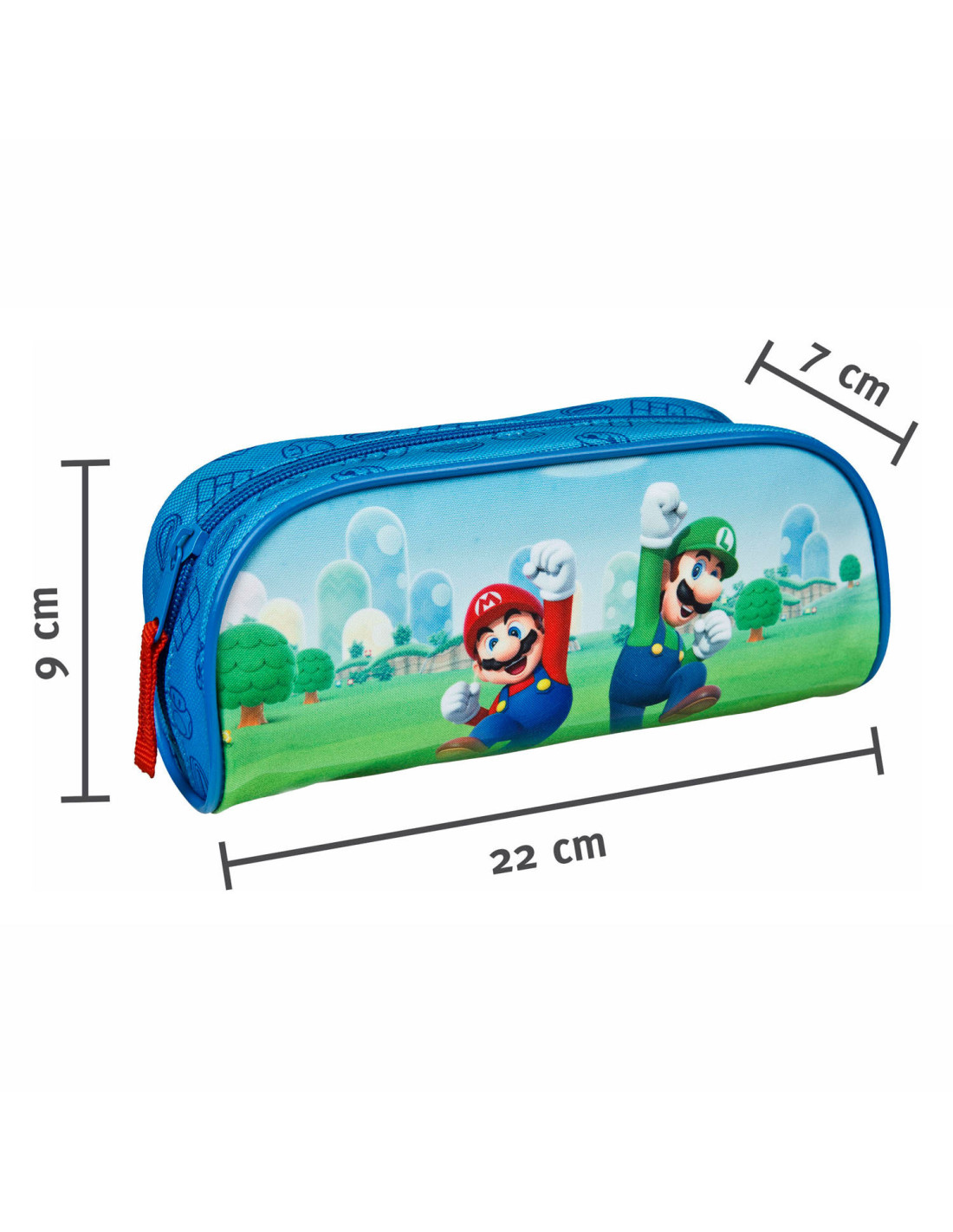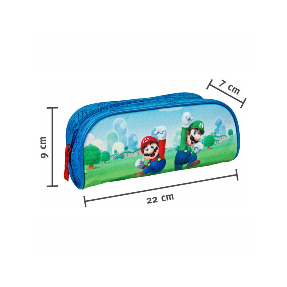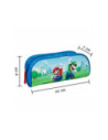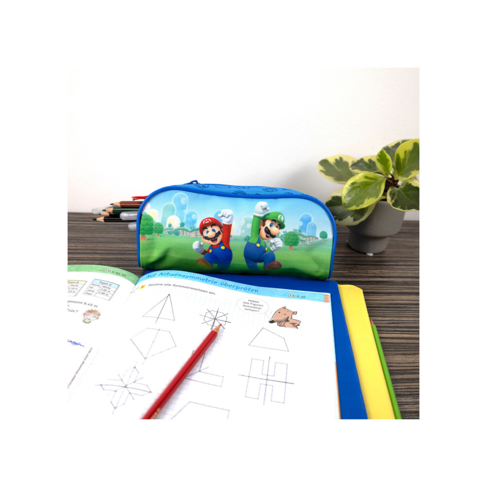 Blauwe etui met opdruk van Super Mario. Afmetingen: 20,5 bij 6 bij 10 centimeter.