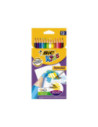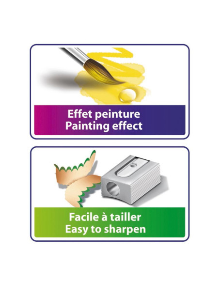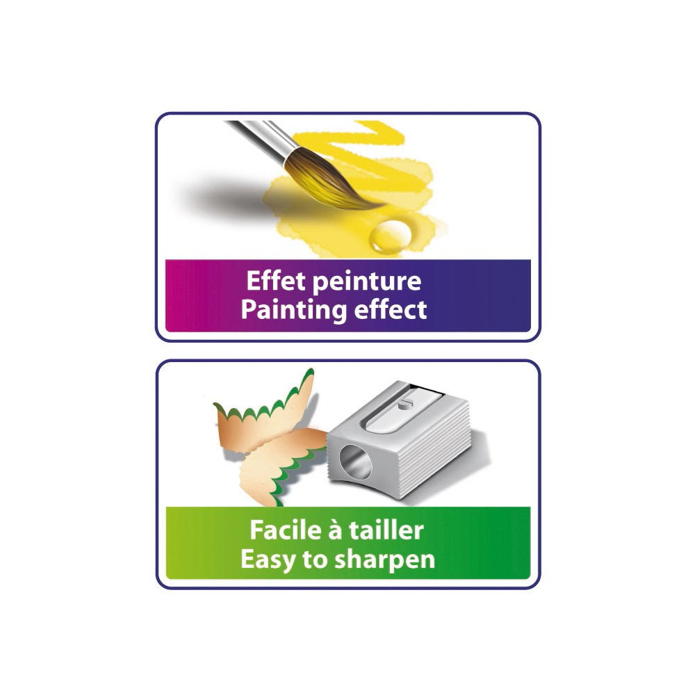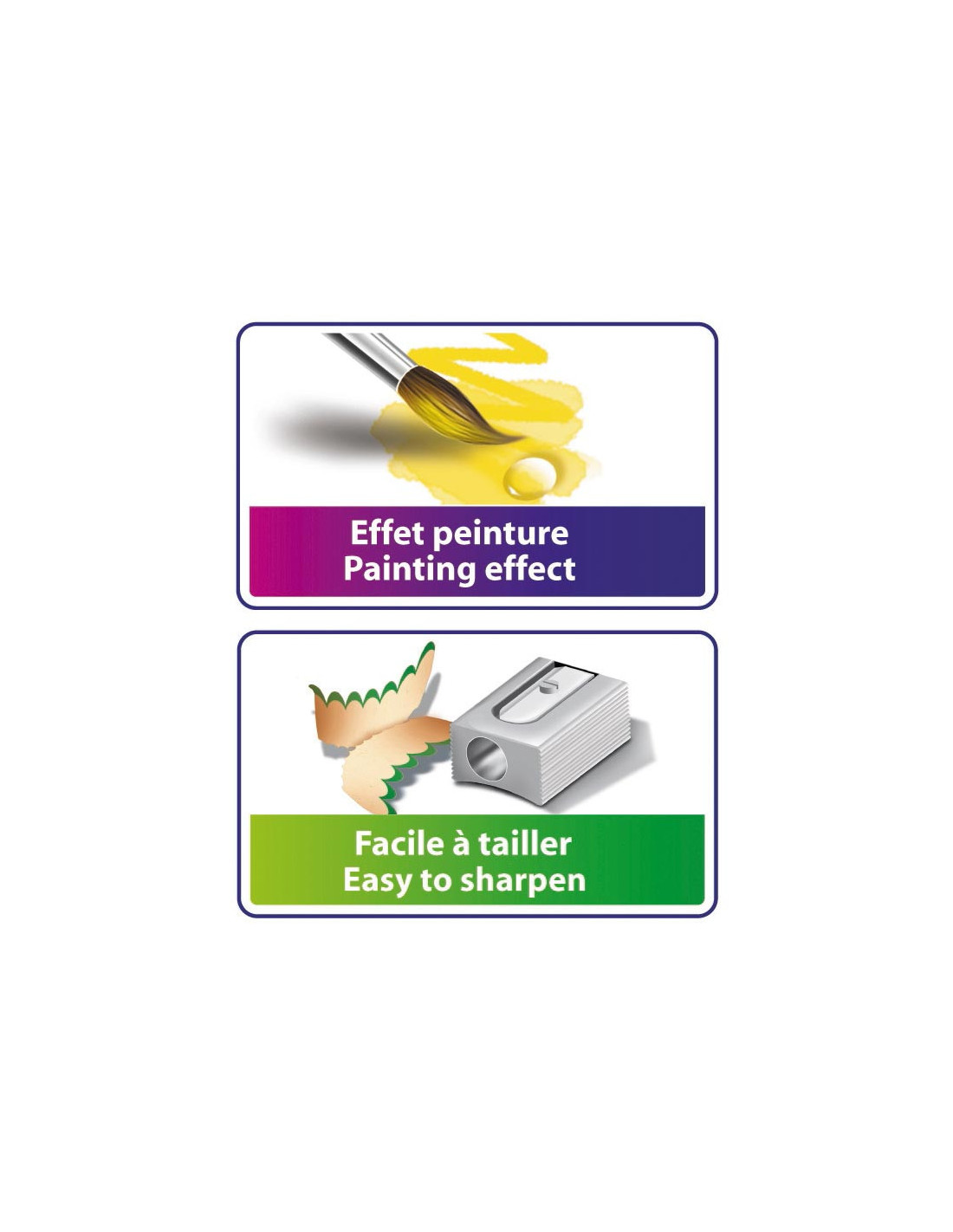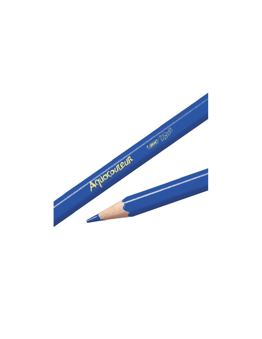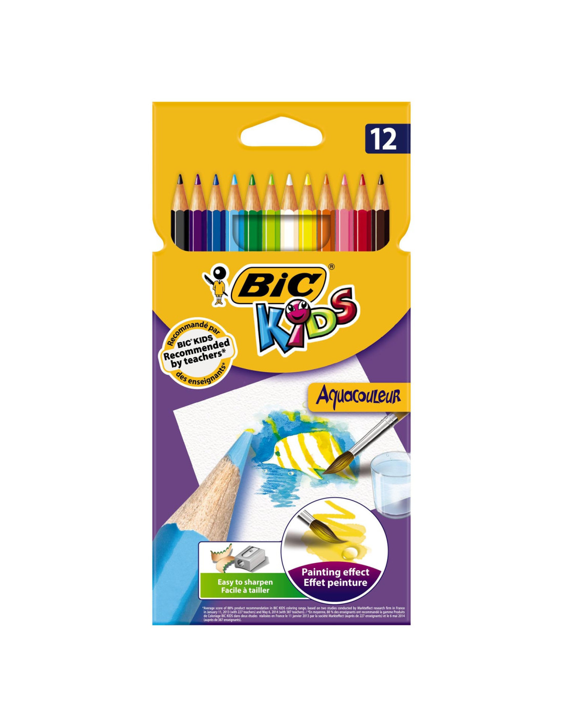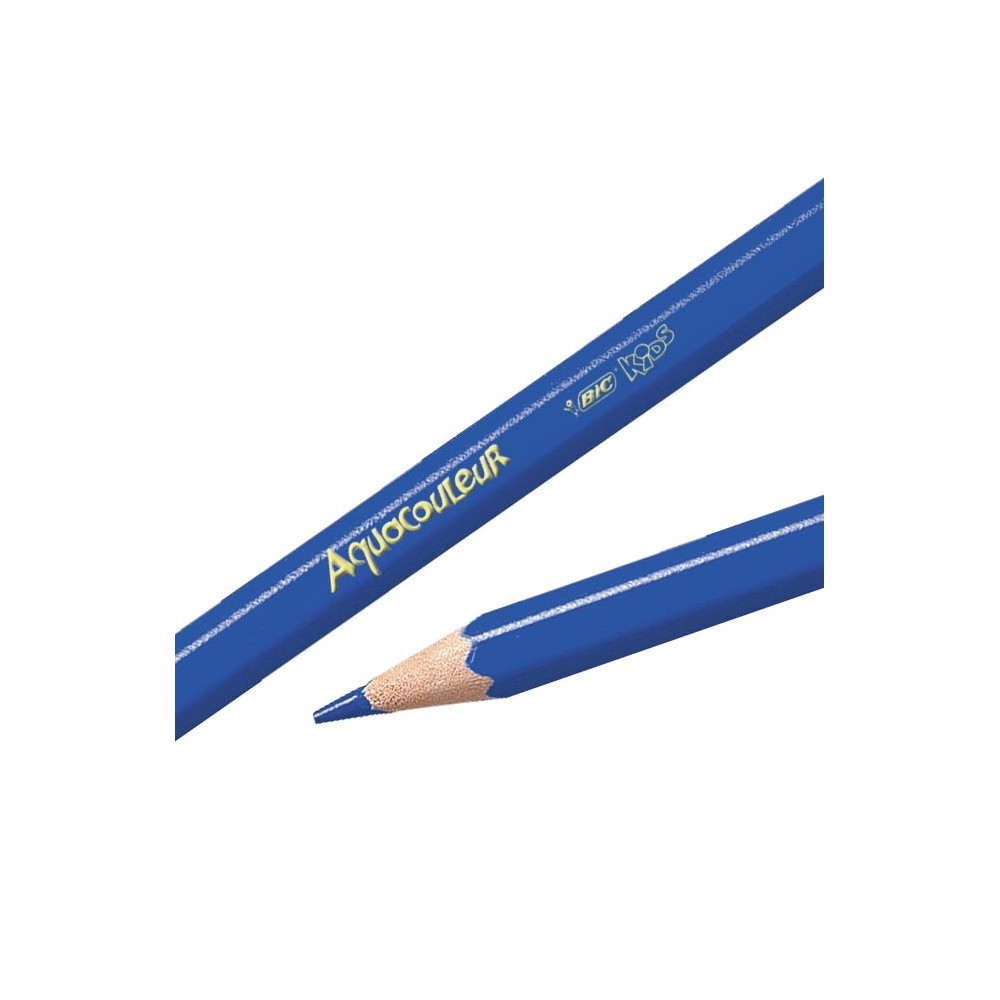 Etui met 12 BIC aquarelpotloden. Dit potlood kan dubbel gebruikt worden: als klassiek potlood of als aquarelpotlood door het potlood in water te dompelen of door de tekening te bewerken met een nat penseel. Hierdoor kan het effect verkregen worden van een aquarelschilderij.