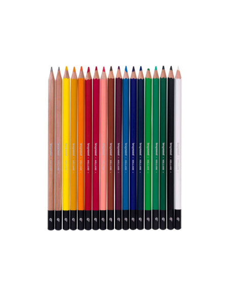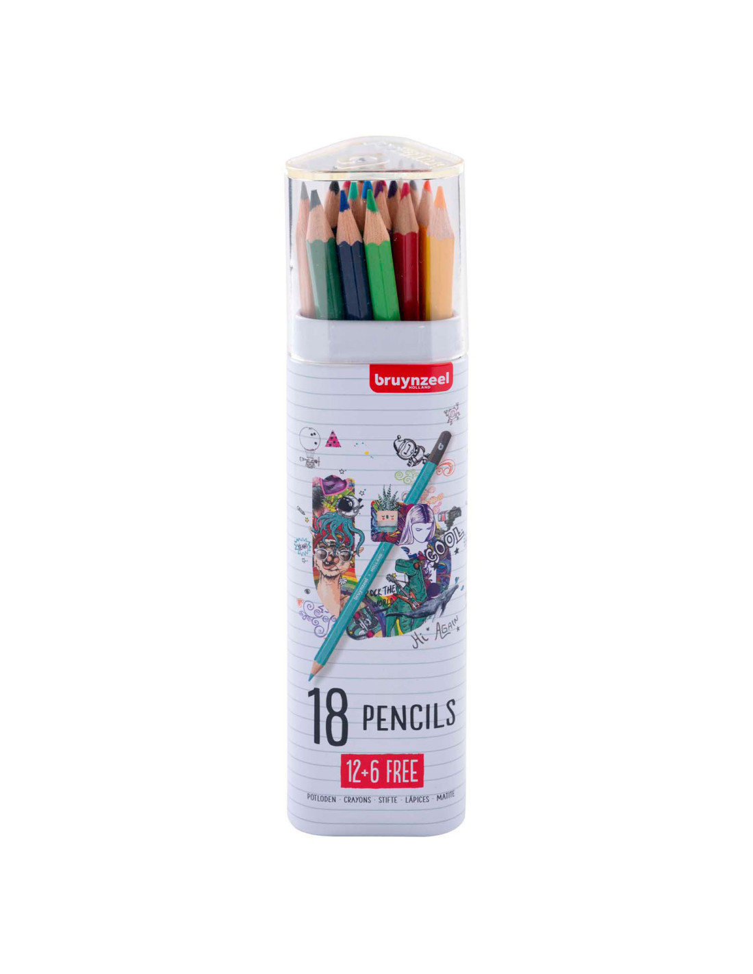 18 potloden in een blik. Deze kleurpotloden zijn een must-have voor elke schooltas! Een goede kleurweergave door het pigment van hoogwaardige kwaliteit in de kern van het potlood. Ideaal voor gebruik tijdens vakken als tekenen, wiskunde of biologie. De potloden worden bewaard in een compact doosje, zodat ze makkelijk mee te nemen zijn. De verpakking bevat 2 HB grafietpotloden, 10 kleurpotloden + 6 gratis! Glutenvrij. Alle potloden van Bruynzeel zijn met zorg vervaardigd uit verantwoord verkregen hout. Daarnaast hebben Bruynzeel potloden een dubbele verlijming, waardoor deze extra sterk zijn en het risico dat de kern breekt, bijvoorbeeld als het potlood op de grond valt, minimaal is! Dit voorkomt puntbreuk en zorgt ervoor dat je het potlood zelden hoeft te slijpen.