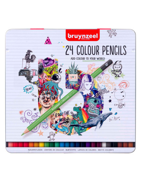 24 kleurpotloden in een blik. Deze kleurpotloden zijn een must-have voor elke schooltas! Een goede kleurweergave door het pigment van hoogwaardige kwaliteit in de kern van het potlood. Ideaal voor gebruik tijdens vakken als tekenen, wiskunde of biologie. De potloden worden bewaard in een compact doosje, zodat ze makkelijk mee te nemen zijn. Glutenvrij. Alle potloden van Bruynzeel zijn met zorg vervaardigd uit verantwoord verkregen hout. Daarnaast hebben Bruynzeel potloden een dubbele verlijming, waardoor deze extra sterk zijn en het risico dat de kern breekt, bijvoorbeeld als het potlood op de grond valt, minimaal is! Dit voorkomt puntbreuk en zorgt ervoor dat je het potlood zelden hoeft te slijpen.