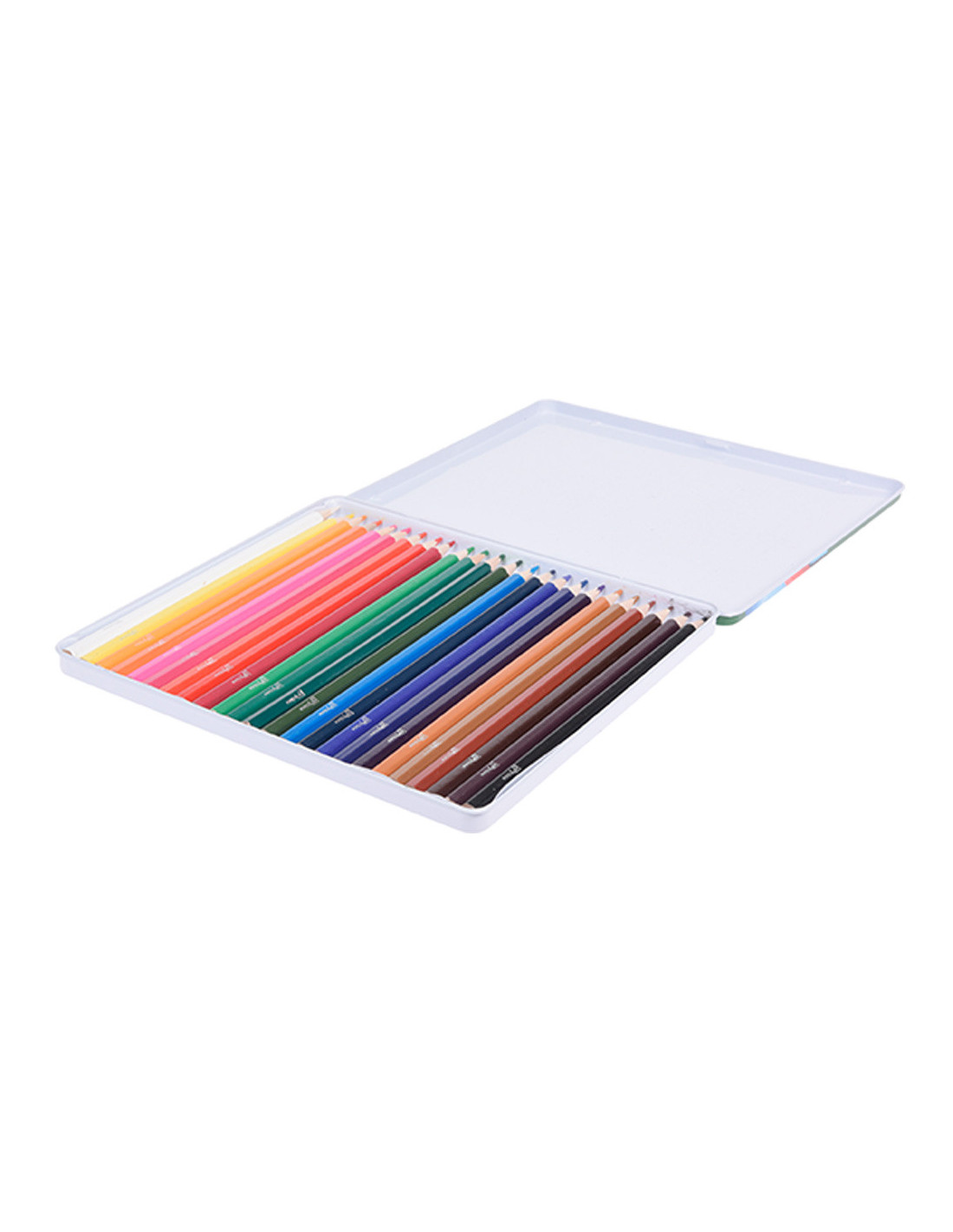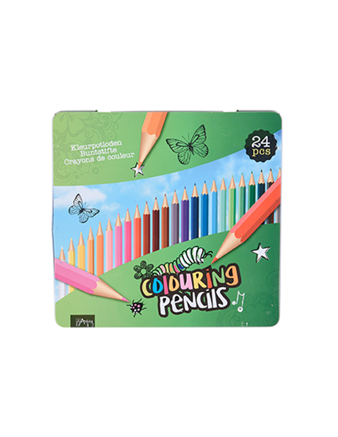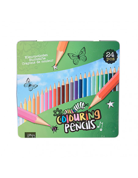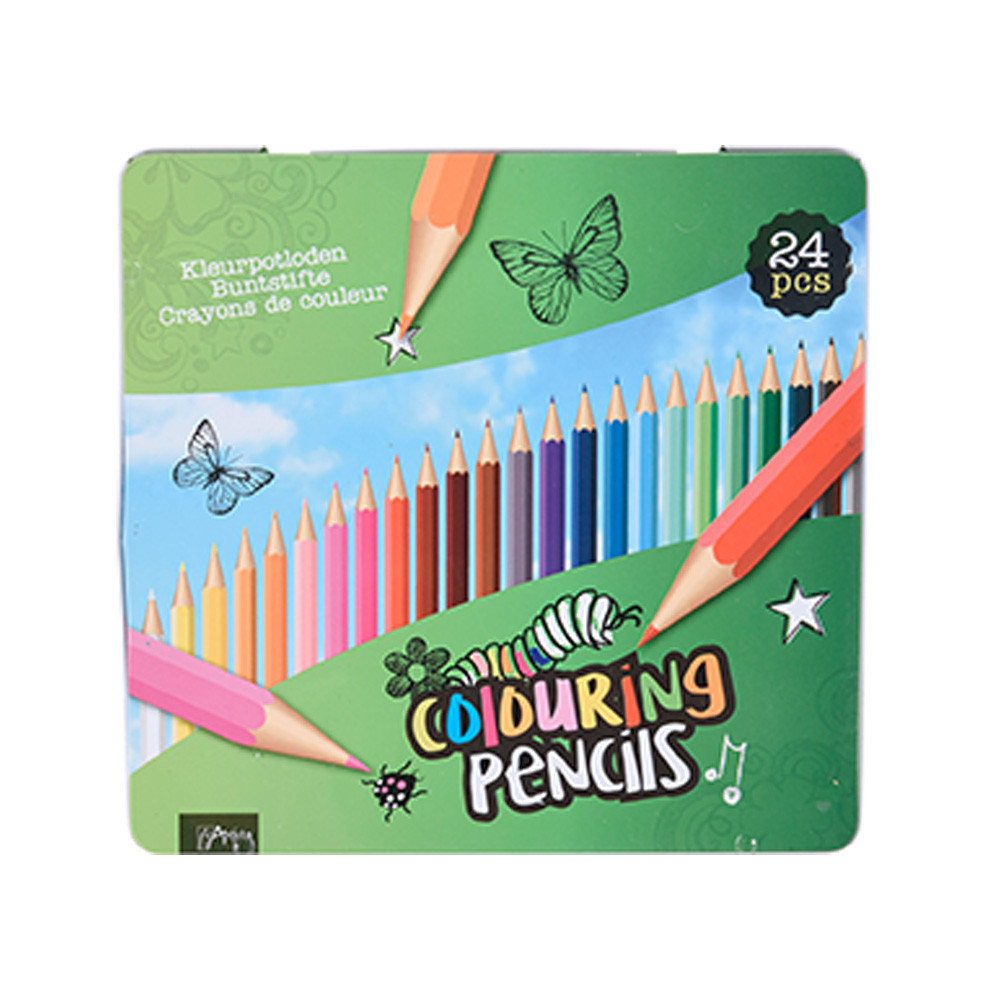 Set van 24 verschillende gekleurde potloden. De potloden zitten in een handige blik, zodat jij jouw kleurpotloden gemakkelijk overal mee naar toe kan nemen.