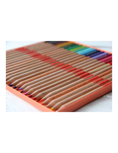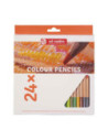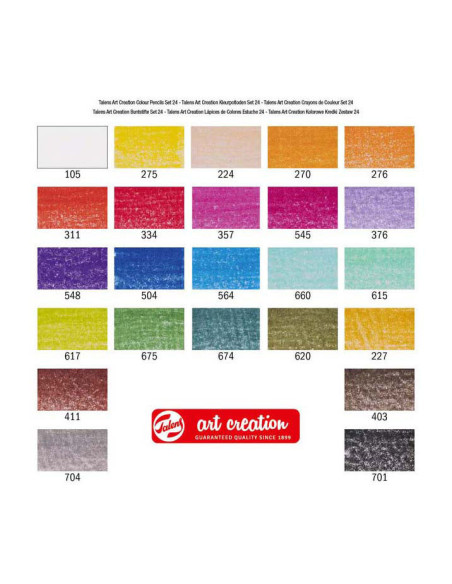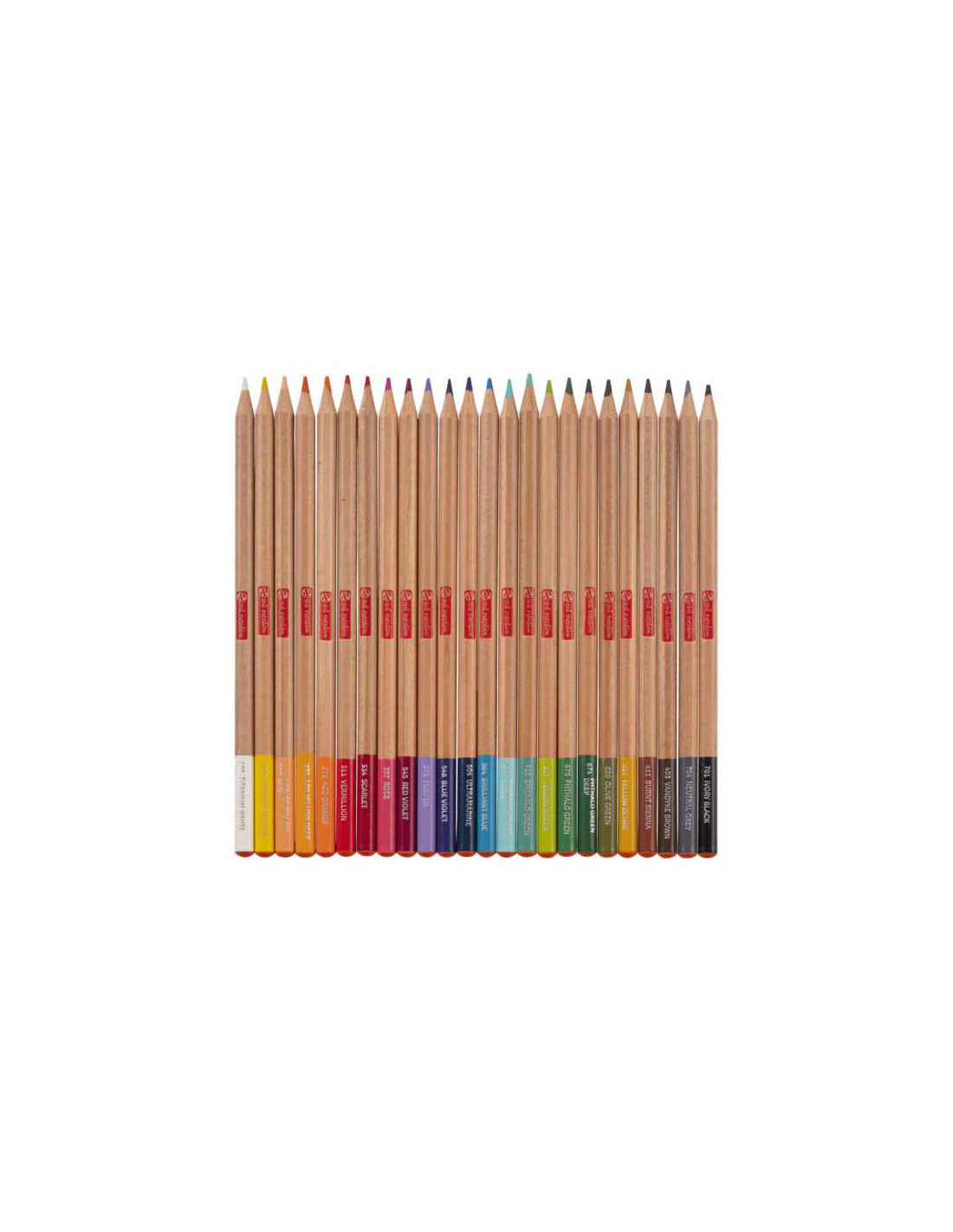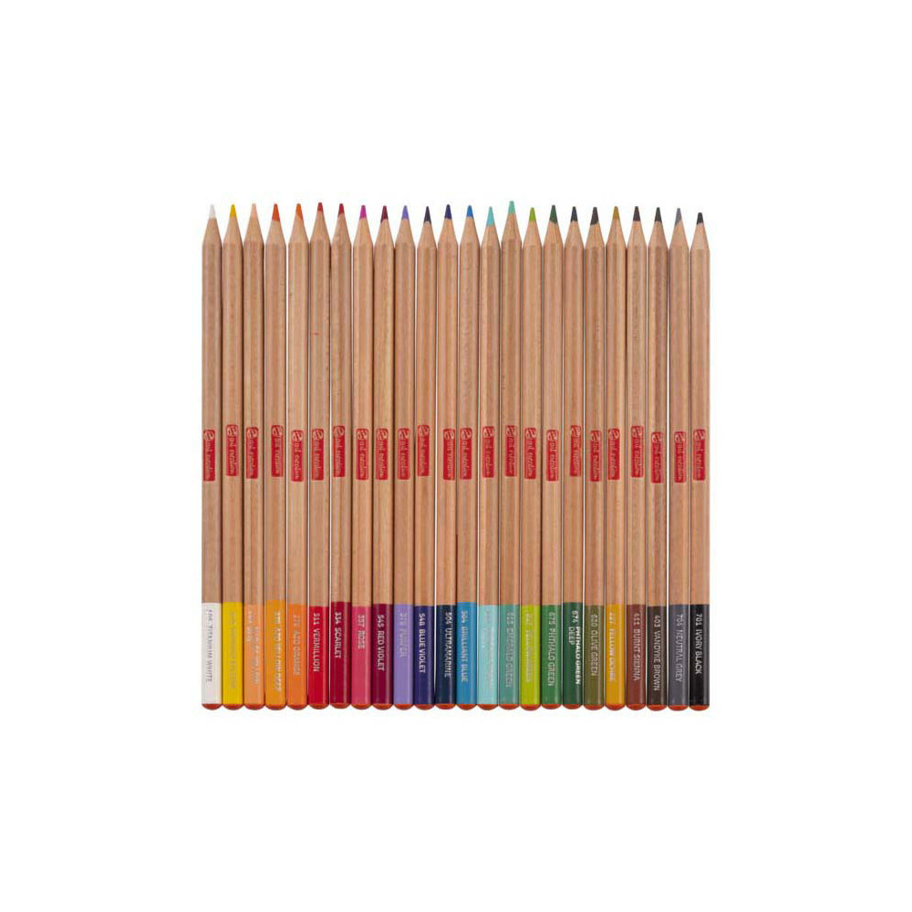 Inhoud: 24 potloden (105 Titaanwit – 224 Napelsgeel Rood – 275 Primairgeel – 270 Azogeel Donker – 276 Azo-oranje – 311 Vermiljoen – 334 Scharlaken – 357 Roze – 545 Roodviolet – 376 Purper – 548 Blauwviolet – 504 Ultramarijn – 564 Briljantblauw – 660 Turkooisgroen Licht – 615 Paul Veronesegroen – 675 Phtalogroen – 617 Geelgroen – 674 Phtalogroen Donker – 620 Olijfgroen – 227 Gele Oker – 411 Sienna Gebrand – 403 Van Dijckbruin – 704 Neutraalgrijs – 701 Ivoorzwart).