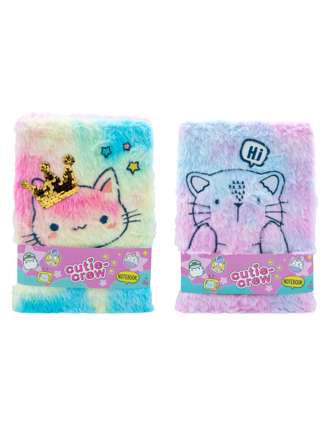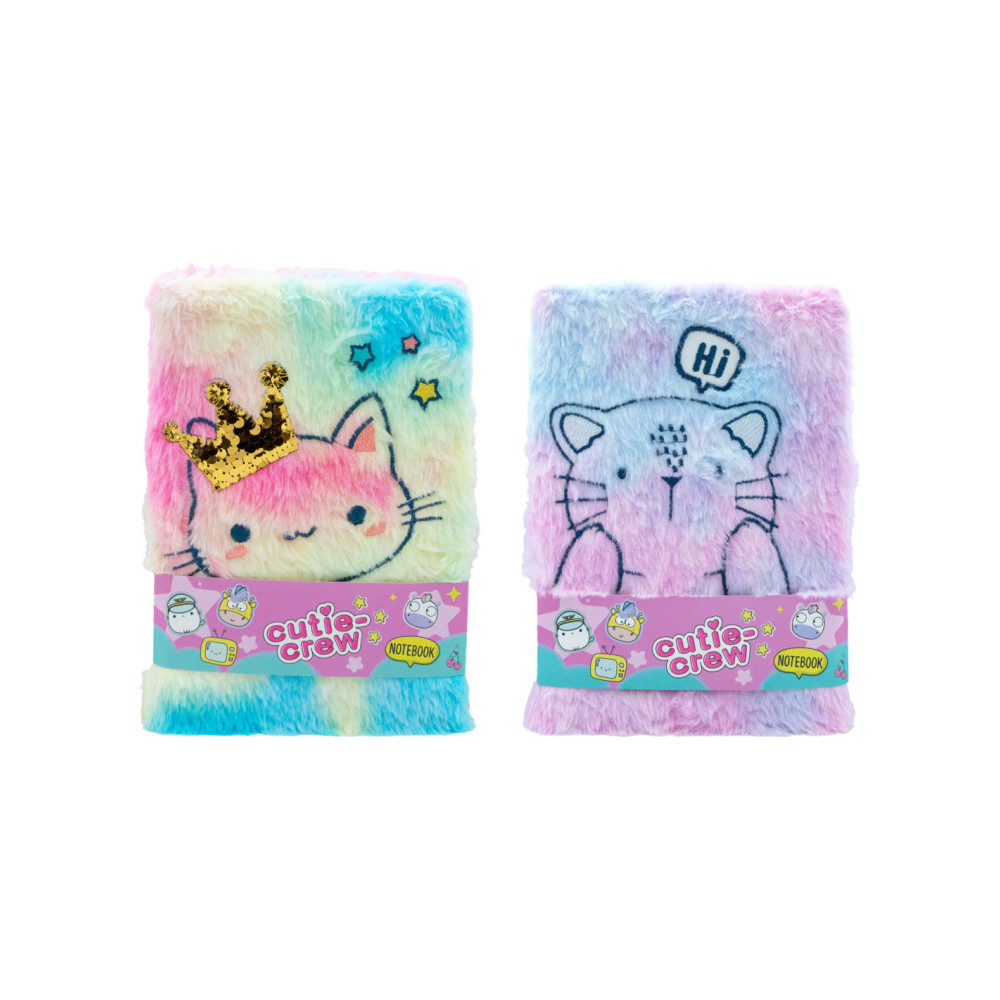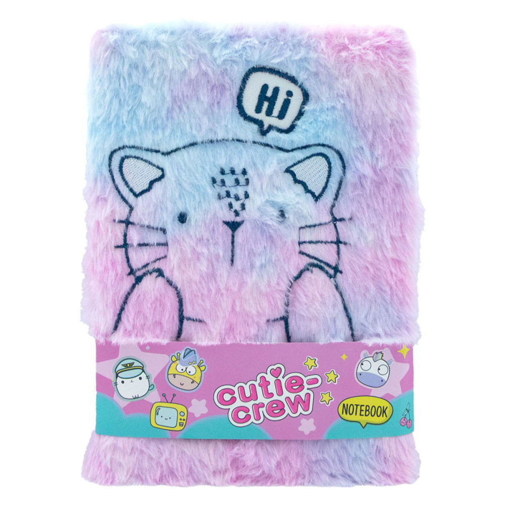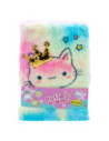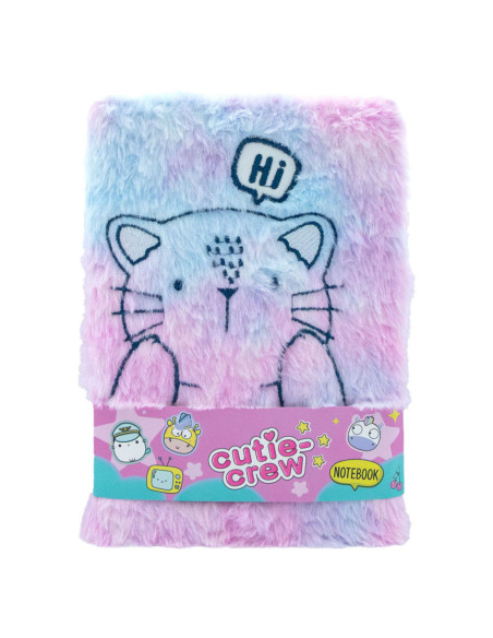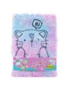 Notitieboek met een pluche omslag. De omslag is bedrukt met een afbeelding van een kat. Het formaat van het schrift is 20,5 x 15 x 3,5 cm.