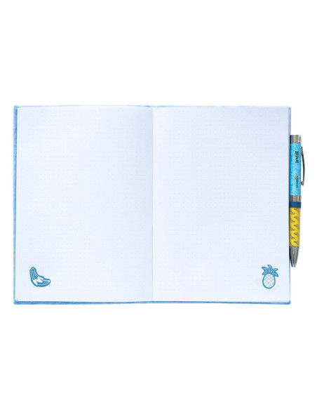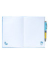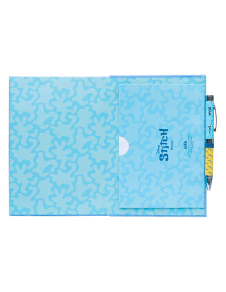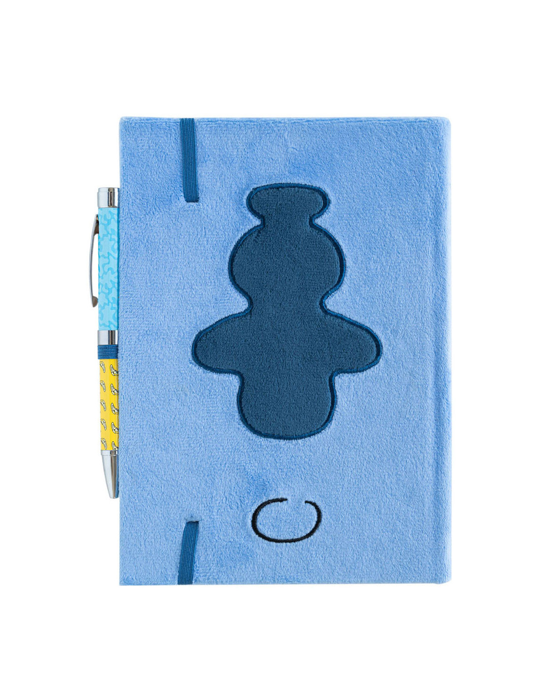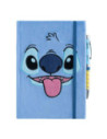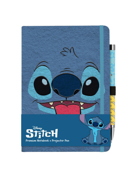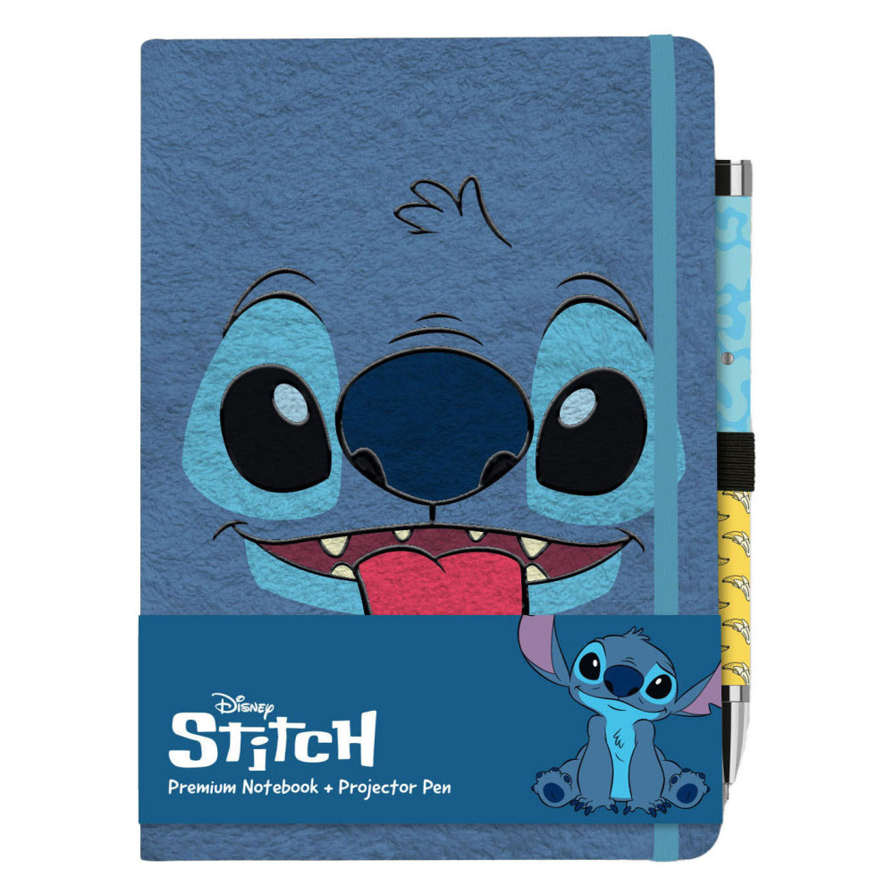Zacht, premium notitieboek van Stitch. Het A5 notitieboek heeft een sluitelastiek en wordt geleverd met een balpen met projectorfunctie. Vanbinnen heeft het zachte notitieboek een opbergvak voor papier en 80 pagina’s met een subtiel stippenpatroon.