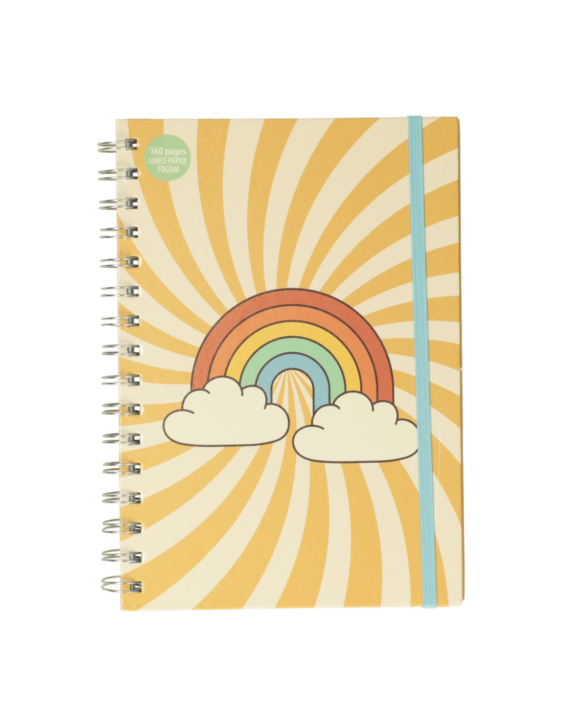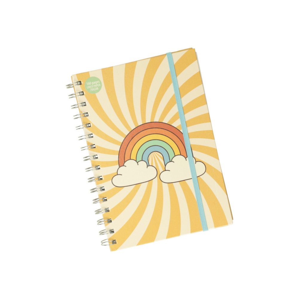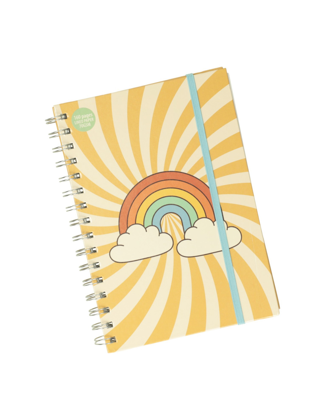 Klein notitieboekje in het geel. Het schriftje heeft een tekening van een regenboog op de voorkant en een blauw elastiek. Het formaat is 21,5 x 5 cm en het schriftje heeft 160 bladzijdes. De kaft en bladzijdes zijn gemaakt van 100% FSC hout. Het schrift is 21,5 x 5 cm.