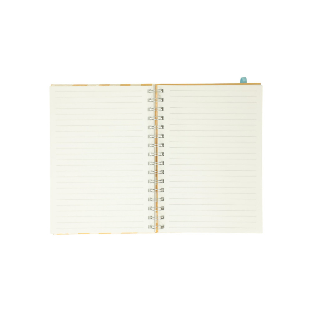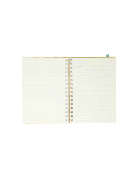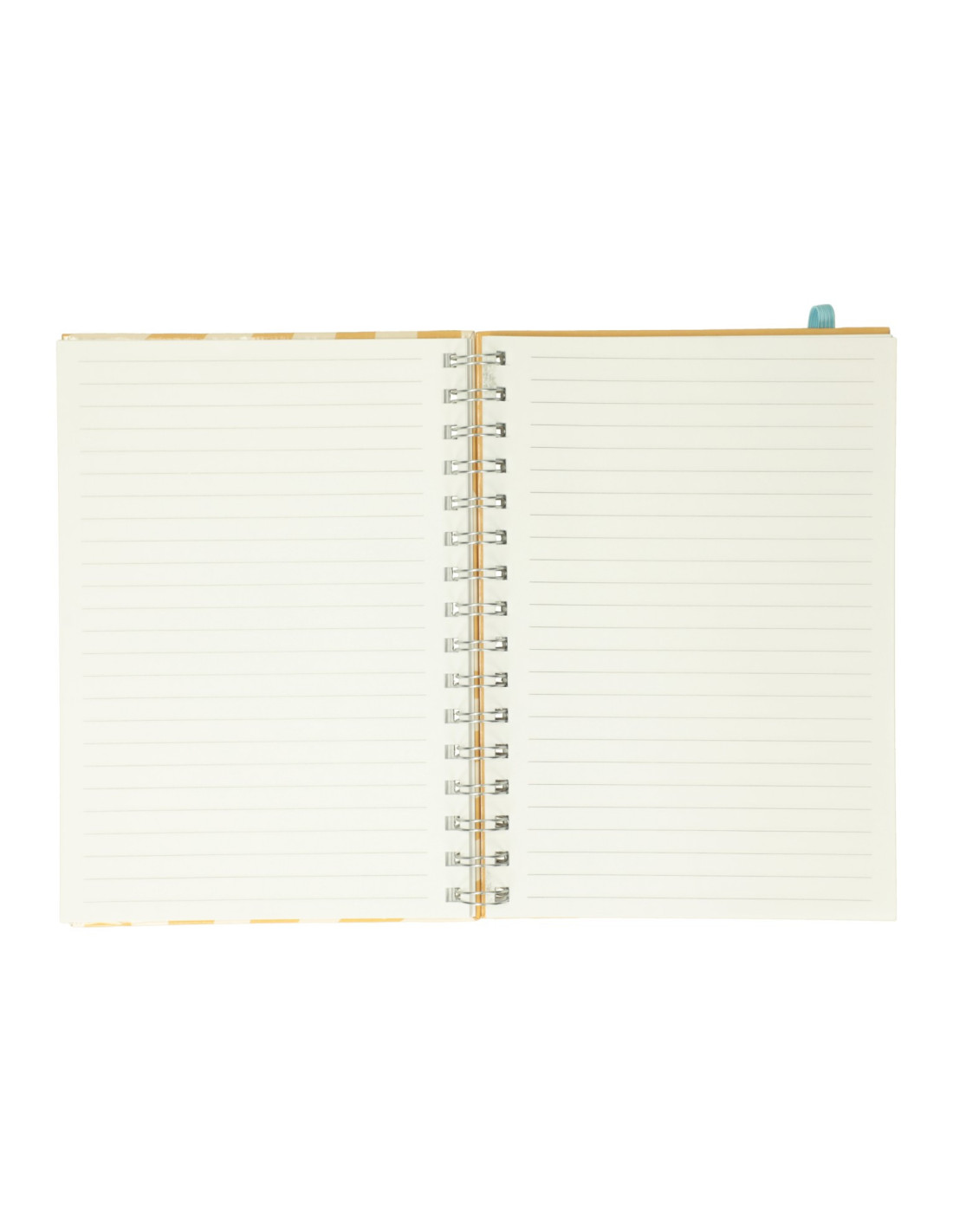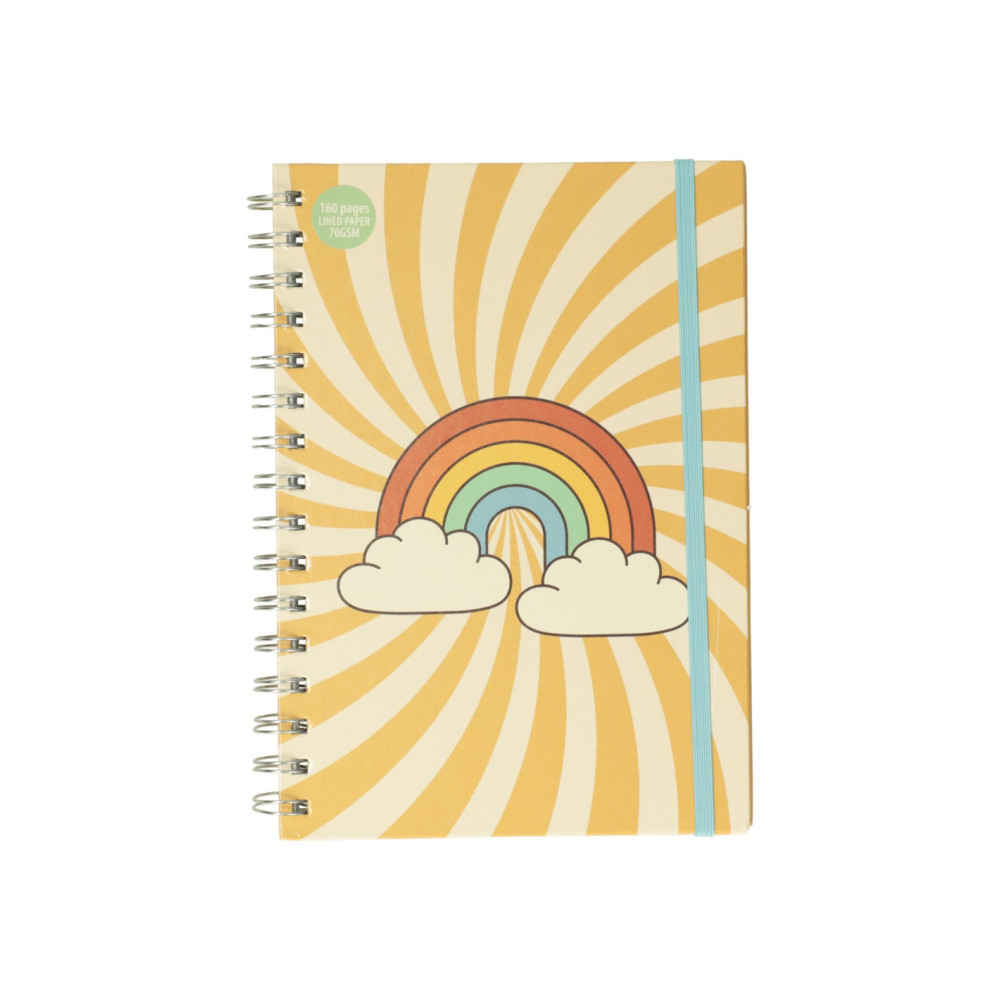 Klein notitieboekje in het geel. Het schriftje heeft een tekening van een regenboog op de voorkant en een blauw elastiek. Het formaat is 21,5 x 5 cm en het schriftje heeft 160 bladzijdes. De kaft en bladzijdes zijn gemaakt van 100% FSC hout. Het schrift is 21,5 x 5 cm.