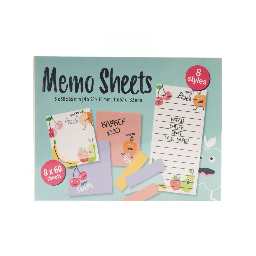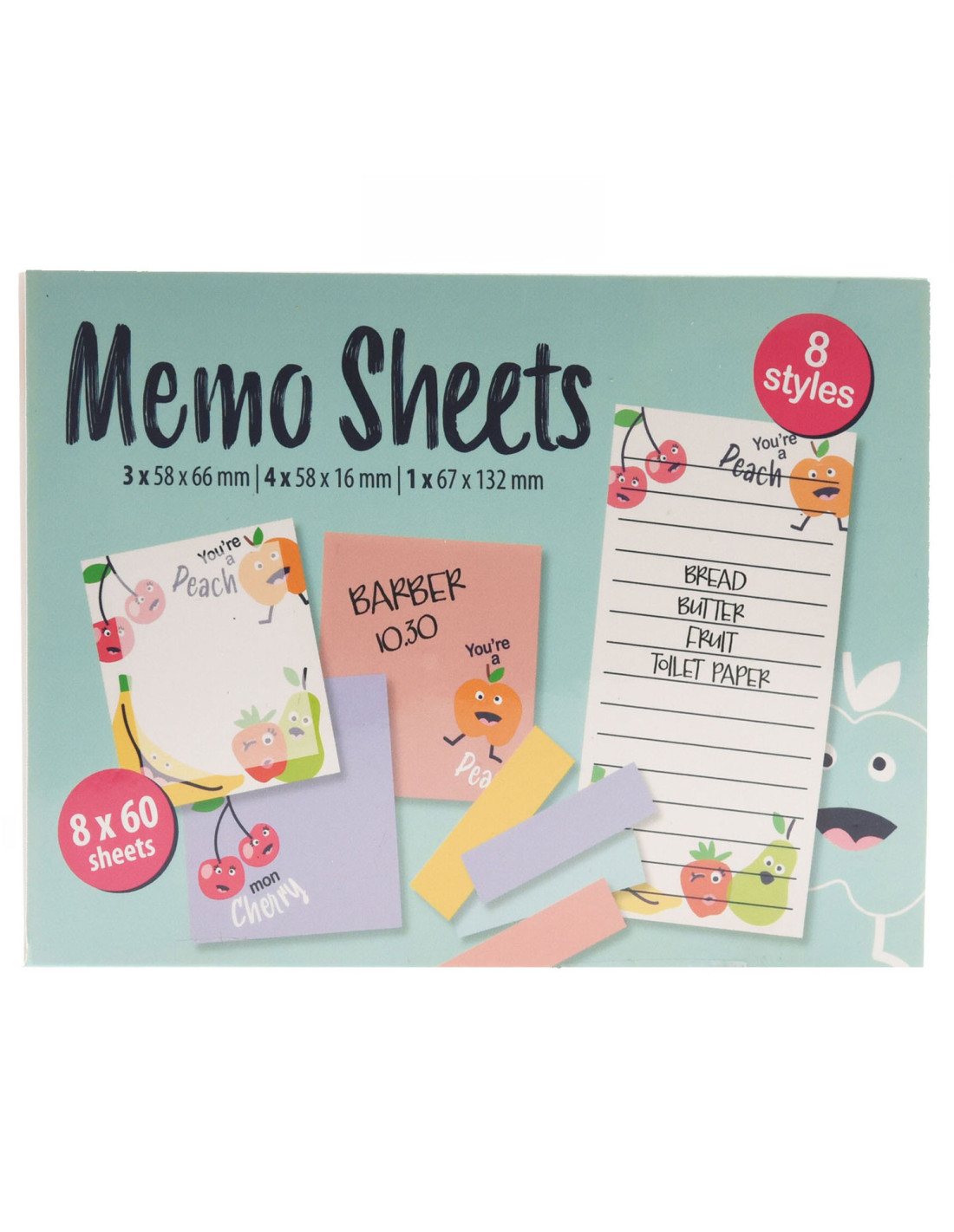 Set met verschillende plakkende memonotities met schattige fruitprints. Met 8 keer 60 memoblaadjes (3 varianten 58x66mm, 4 varianten 58x16 mm, 1 variant 67x132 mm).