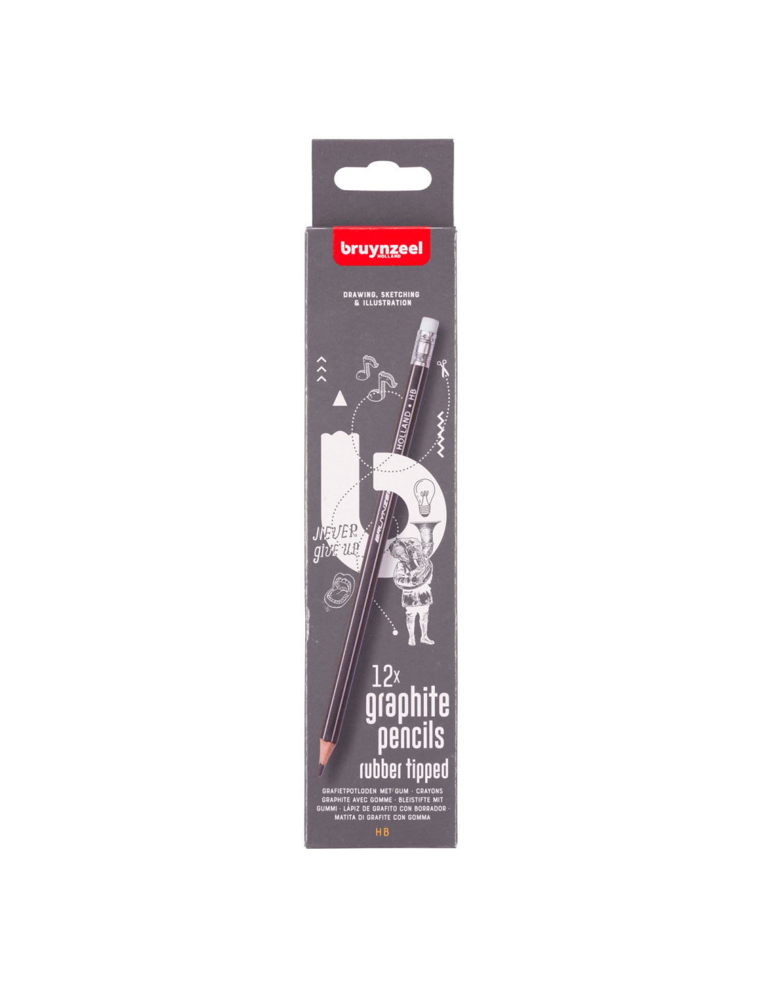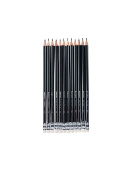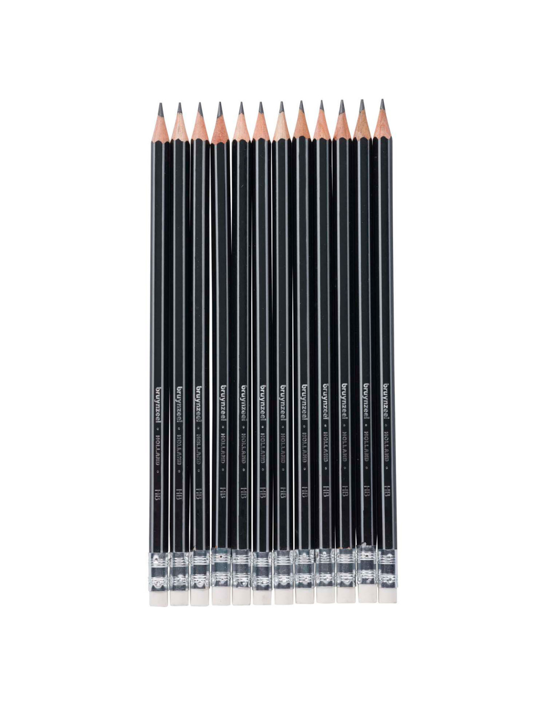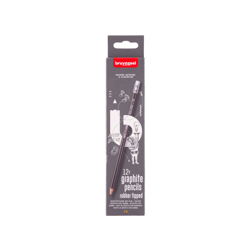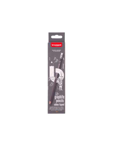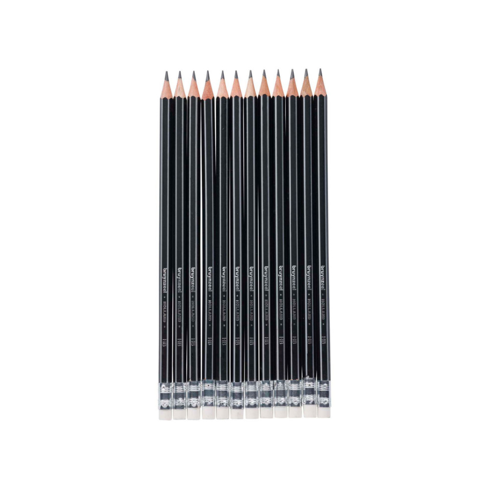 12 HB grafietpotloden van de kenmerkende Bruynzeel-kwaliteit, met een gummetje op de bovenkant. Speciaal ontwikkeld voor scholen. Extra sterk door de dikke kern en de volledige verlijming van de stift aan het hout.