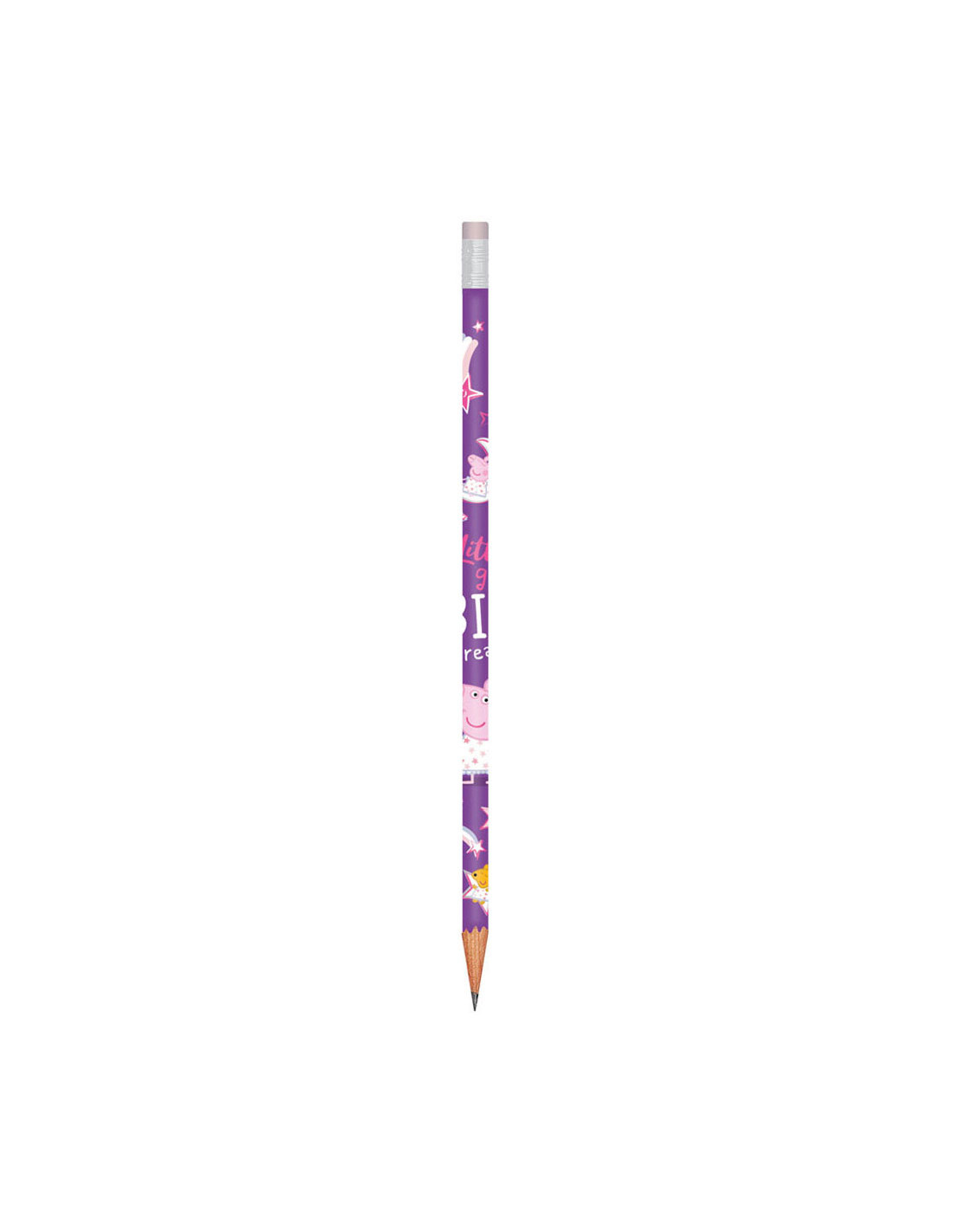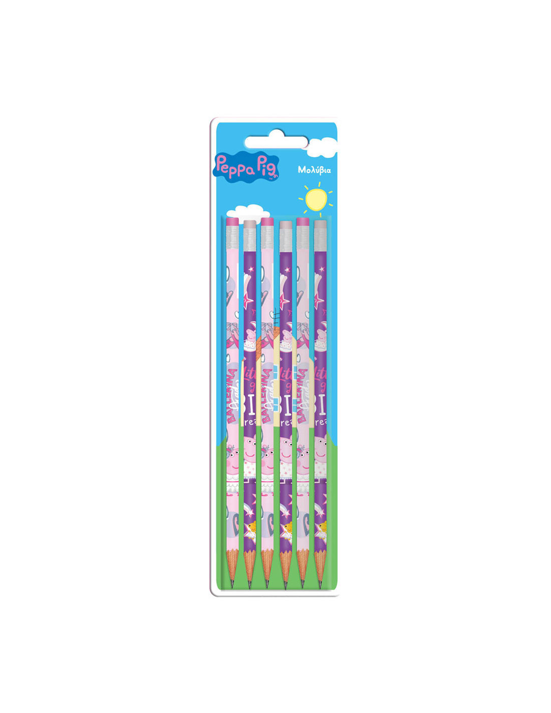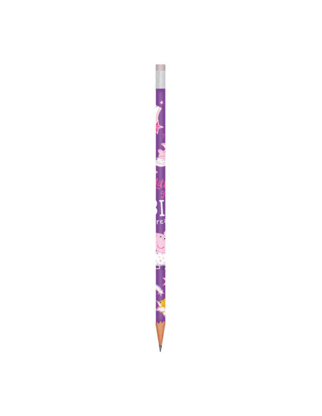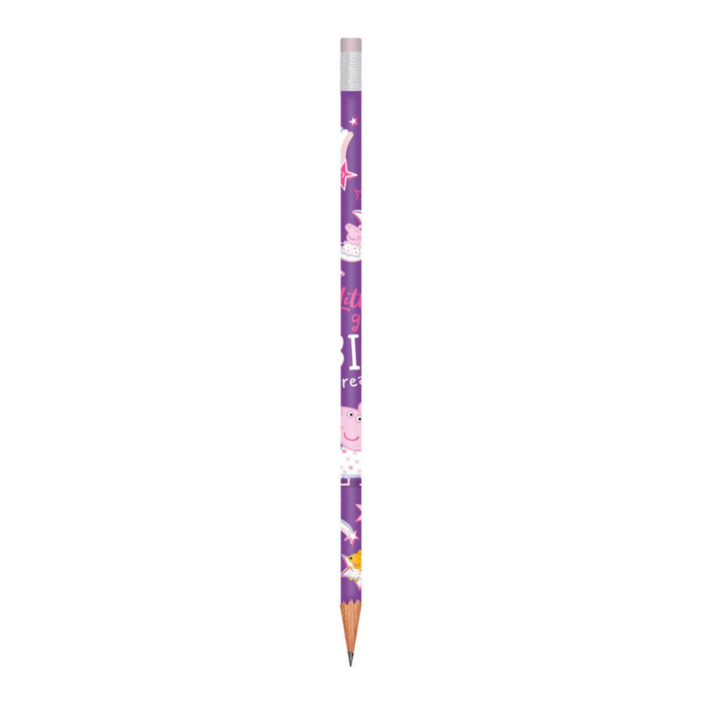Set van 6 paarse en roze potloden met Peppa Pig-print. De potloden schrijven grijs en hebben elk een klein gummetje aan het uiteinde. Geschikt vanaf 3 jaar.