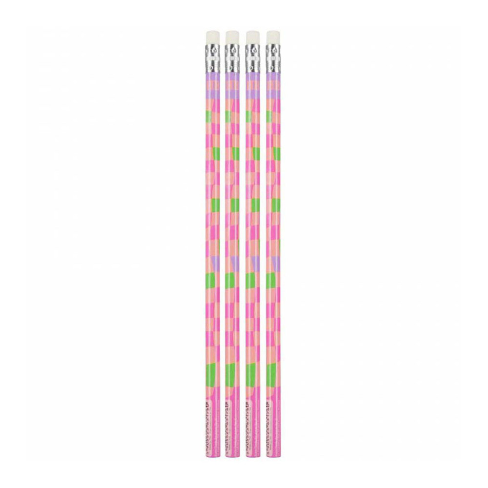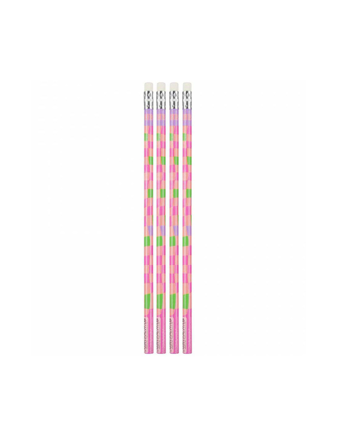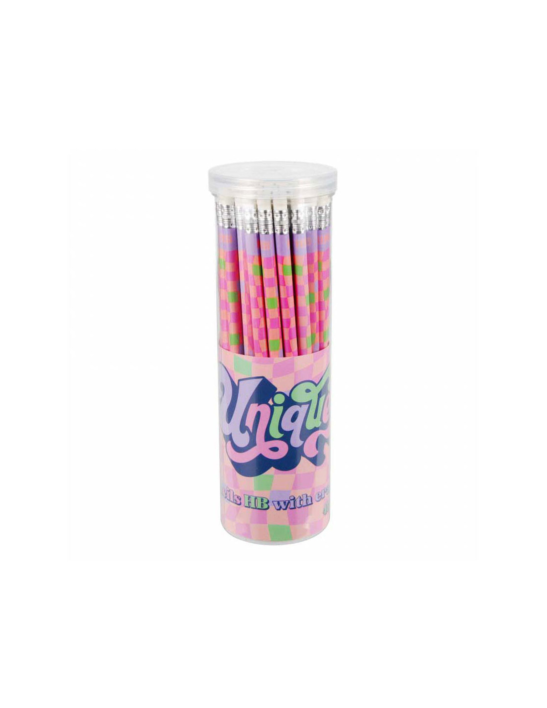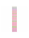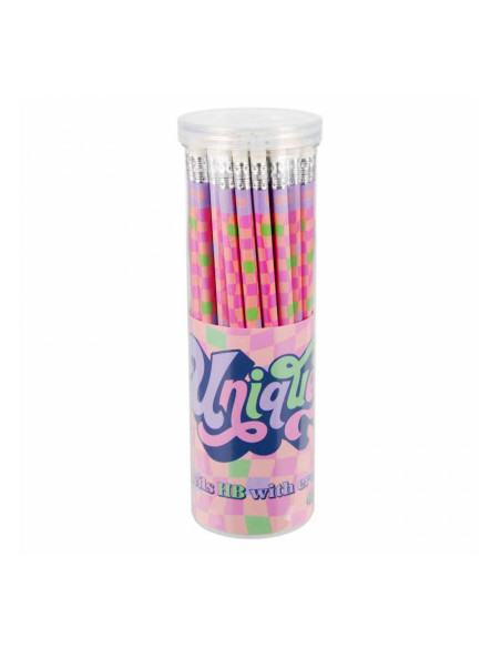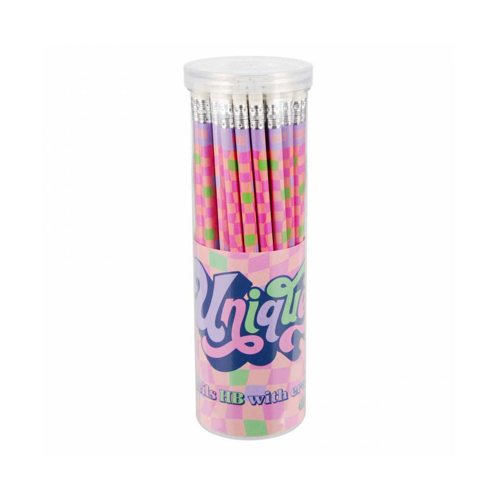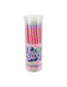 48 HB potloden met groen, roze en paarse opdruk, in doorzichtige koker. Elk potlood heeft een gum. Geschikt voor kinderen vanaf 3 jaar.