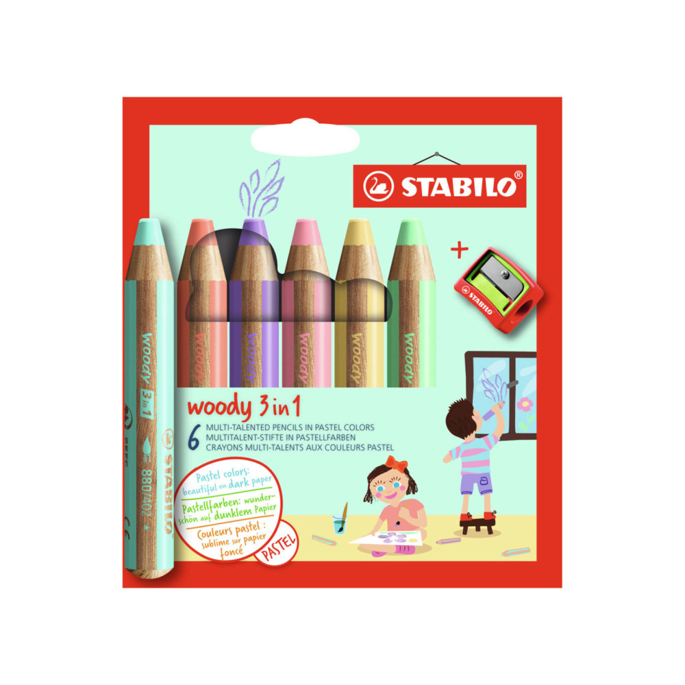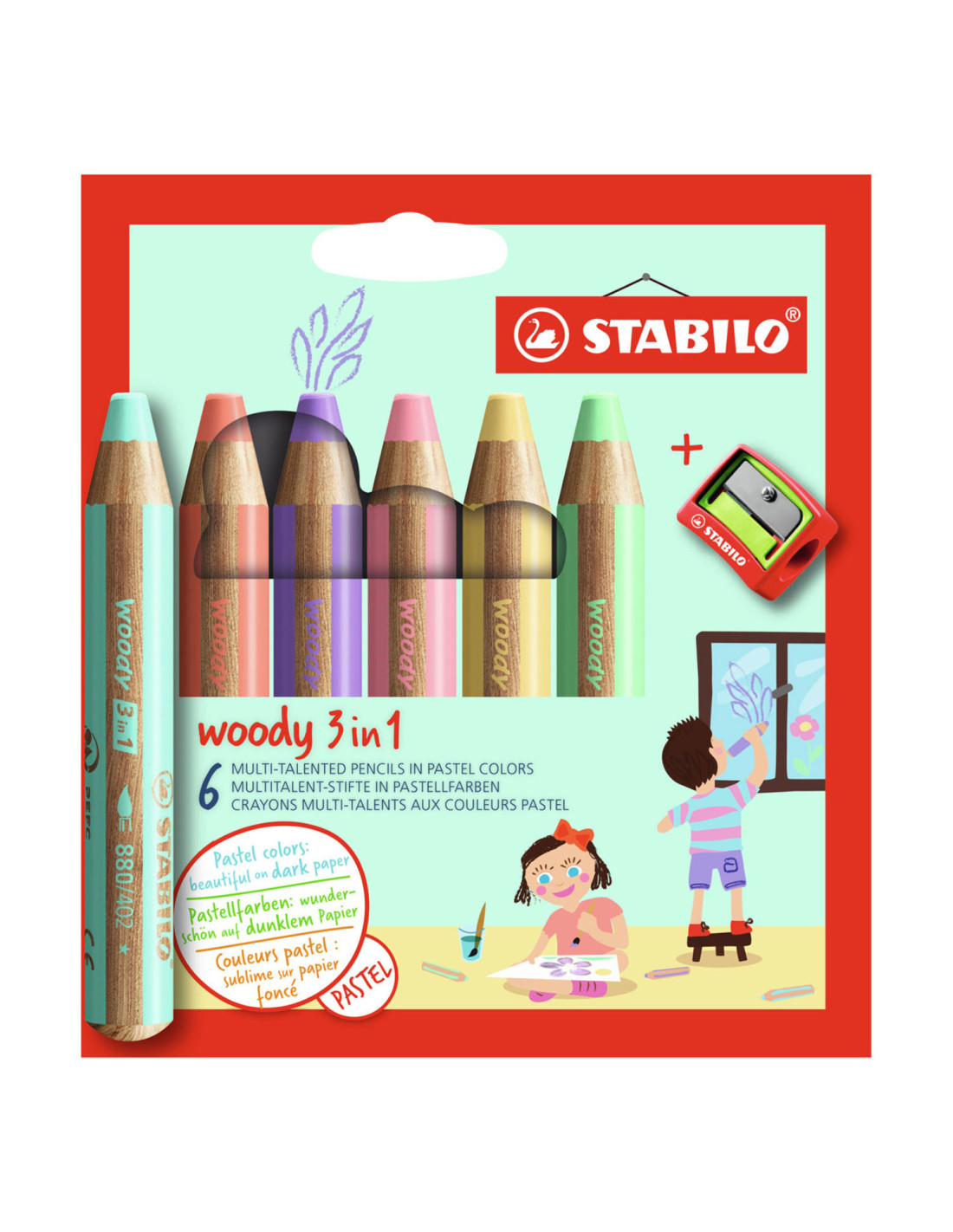 Met de STABILO woody 3 in 1 kan zowel op papier of karton als op gladde oppervlakken, zoals ramen, kunststof, regenlaarzen, broodtrommels, leer en steen worden gekleurd. Dekt zelfs op zwarte ondergronden. Met een kwast en water erbij kunnen prachtige kunstwerken worden gemaakt. De woody 3 in 1 kan weer heel gemakkelijk van harde, niet poreuze, gladde oppervlakken worden verwijderd, zoals ramen.