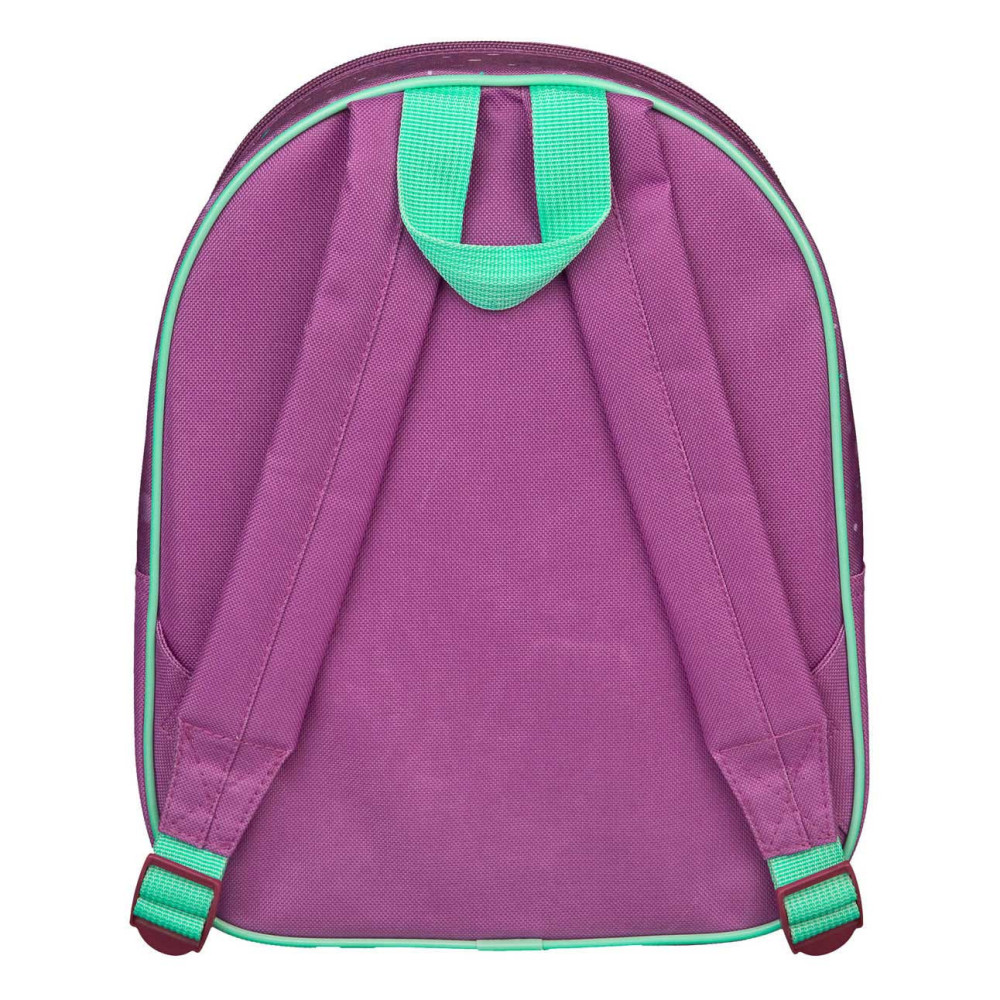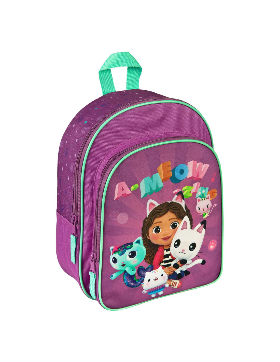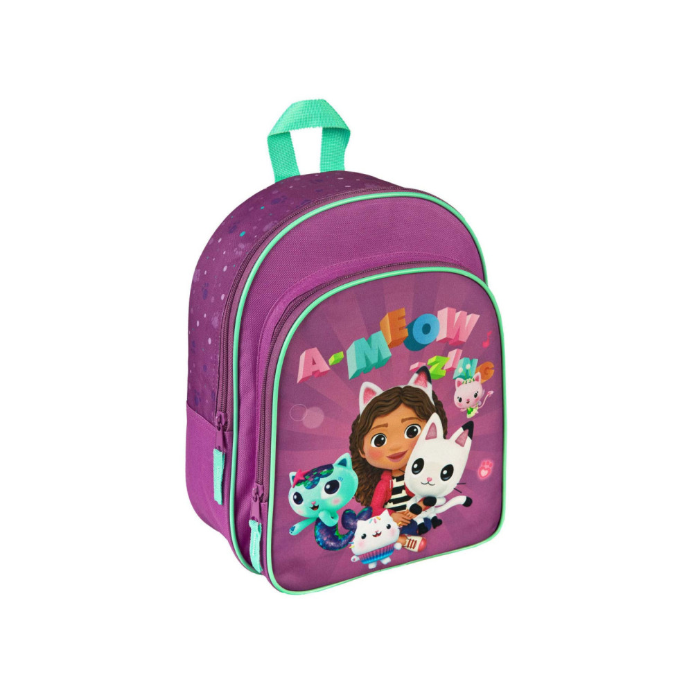 Paarse rugzak van Gabby’s Poppenhuis met groene details. De rugzak is 30 x 25 x 10 centimeter groot en heeft een groot hoofdvak en een voorvak, verstelbare schouderbanden en een draaglus aan de bovenkant. Geschikt voor kinderen vanaf 3 jaar oud.