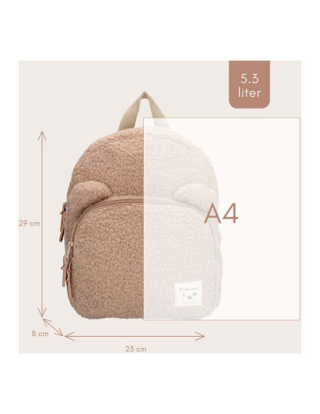 Deze leuke rugzak van Kidzroom uit de Beary Excited collectie is volledig van teddystof met 2 berenoortjes op het voorvak! De tas is beige van kleur en heeft een ruim hoofdvak die sluit met een rits. Verder heeft de tas nog een voorvak. Aan de bovenkant van de rugzak is een handige lus waardoor de tas gemakkelijk aan de hand te dragen is. Verder zijn de schouderbanden te verstellen en voor iedereen op maat te maken.