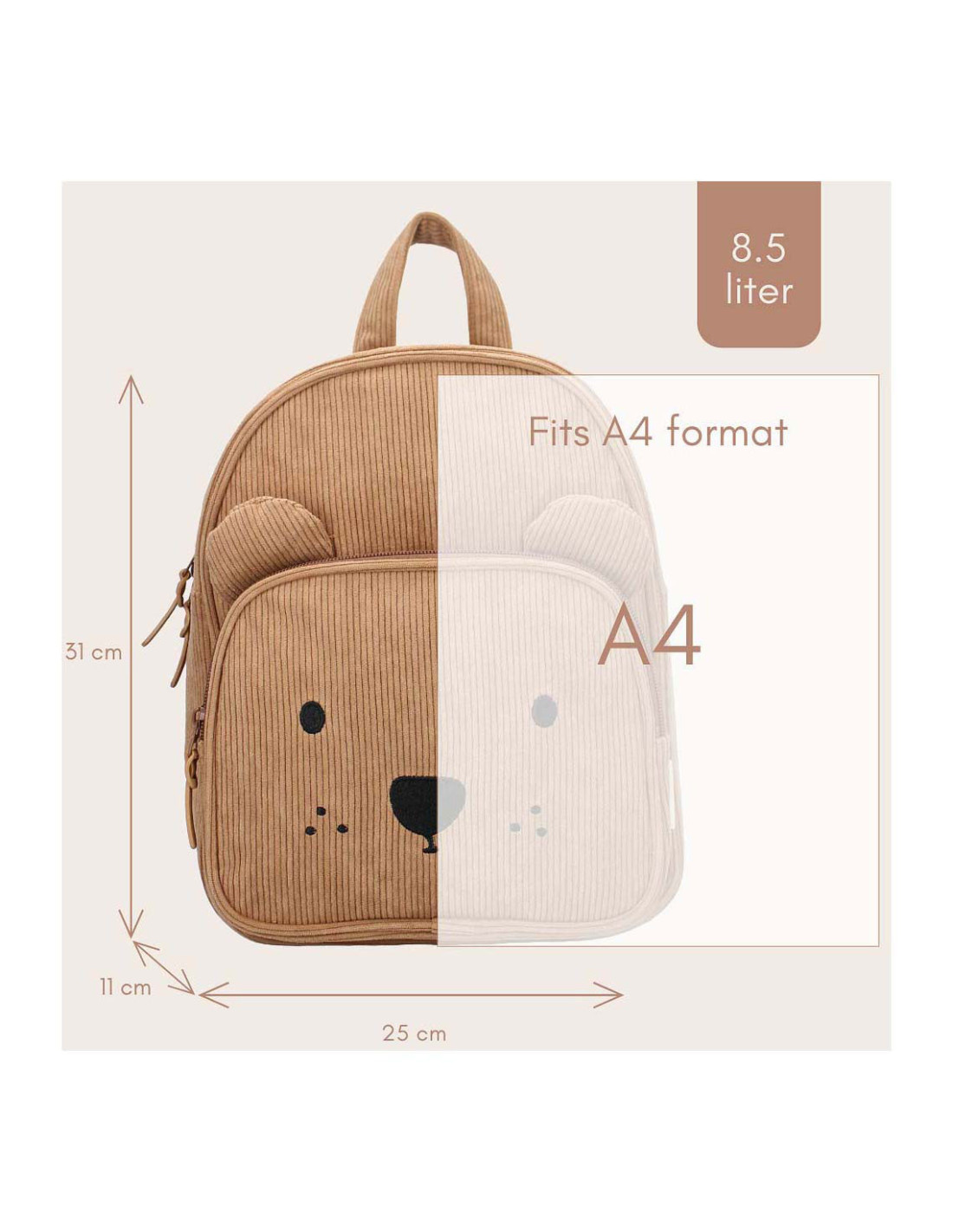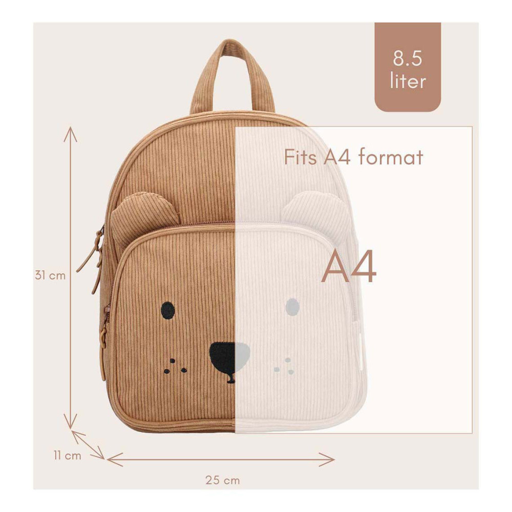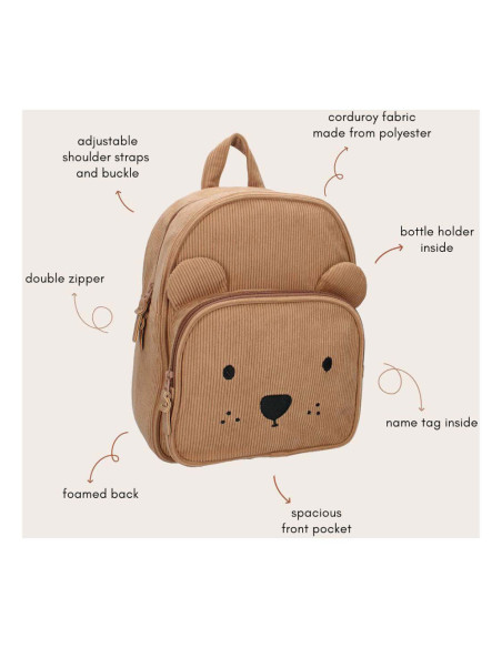 Deze rugzak van Kidzroom uit de 'Beary Excited' collectie is helemaal trending. Deze bruine tas is van ribstof gemaakt van polyester. Het voorvak is in de vorm van een teddybeer en heeft zelfs oortjes en een gezichtje! Verder sluit zowel het hoofd- als voorvak met een dubbele rits. Ook is er aan de bovenkant van de tas een handige lus. De schouderbanden en buckle zijn op maat te verstellen!