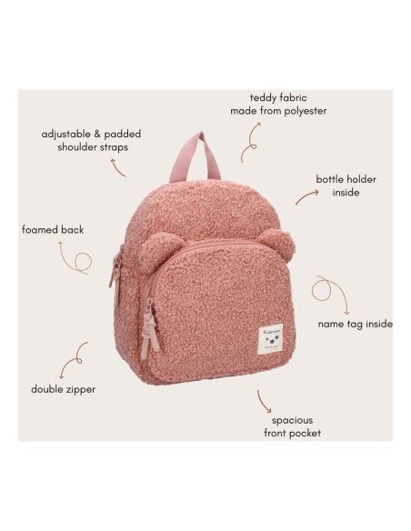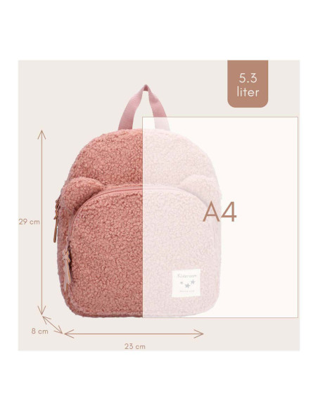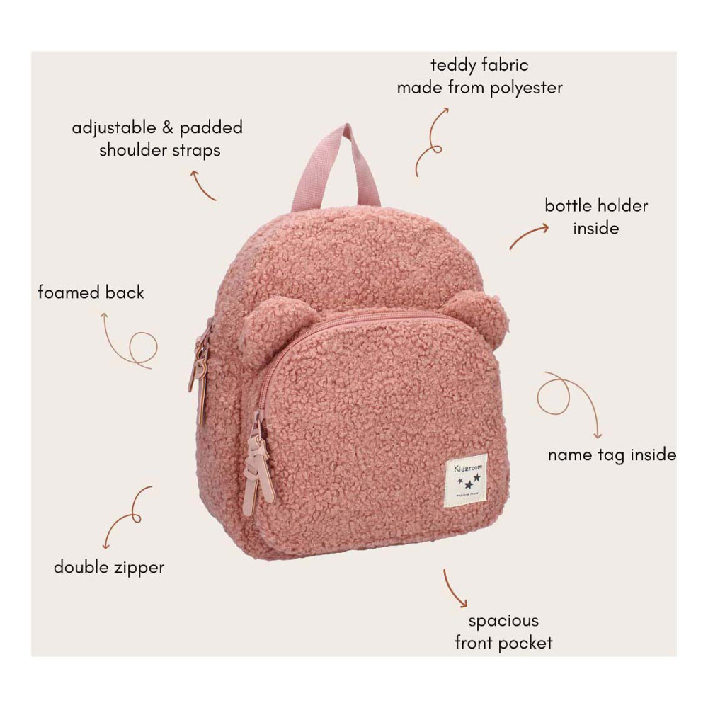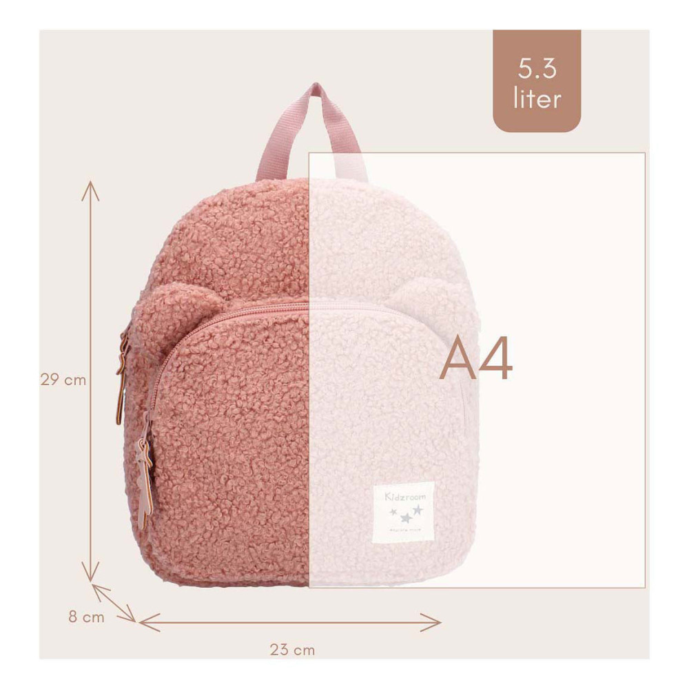 Deze leuke rugzak van Kidzroom uit de Beary Excited collectie is volledig van teddystof met 2 berenoortjes op het voorvak! De tas is roze van kleur en heeft een ruim hoofdvak die sluit met een rits. Verder heeft de tas nog een voorvak. Aan de bovenkant van de rugzak is een handige lus waardoor de tas gemakkelijk aan de hand te dragen is. Verder zijn de schouderbanden te verstellen en voor iedereen op maat te maken.