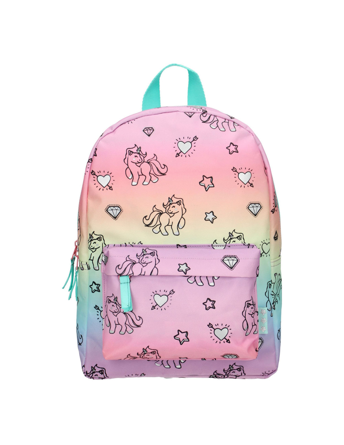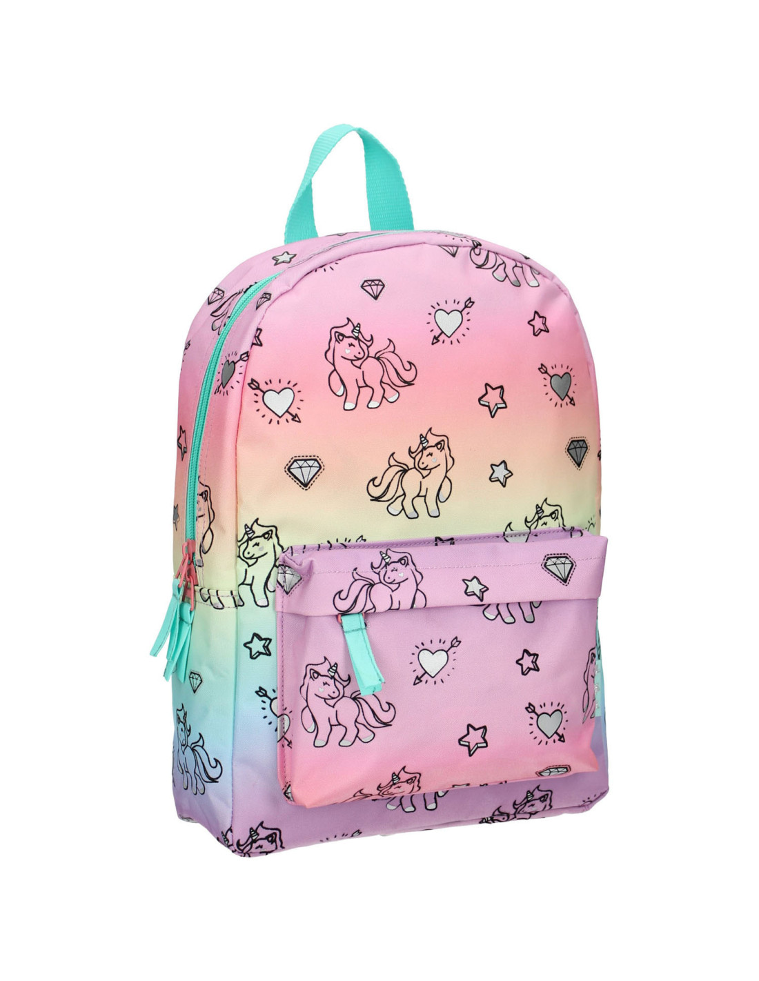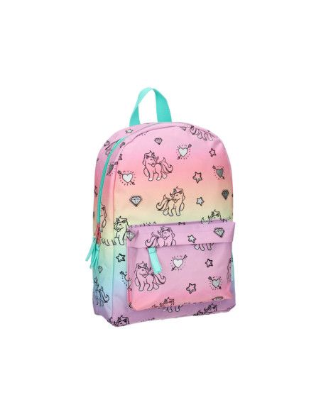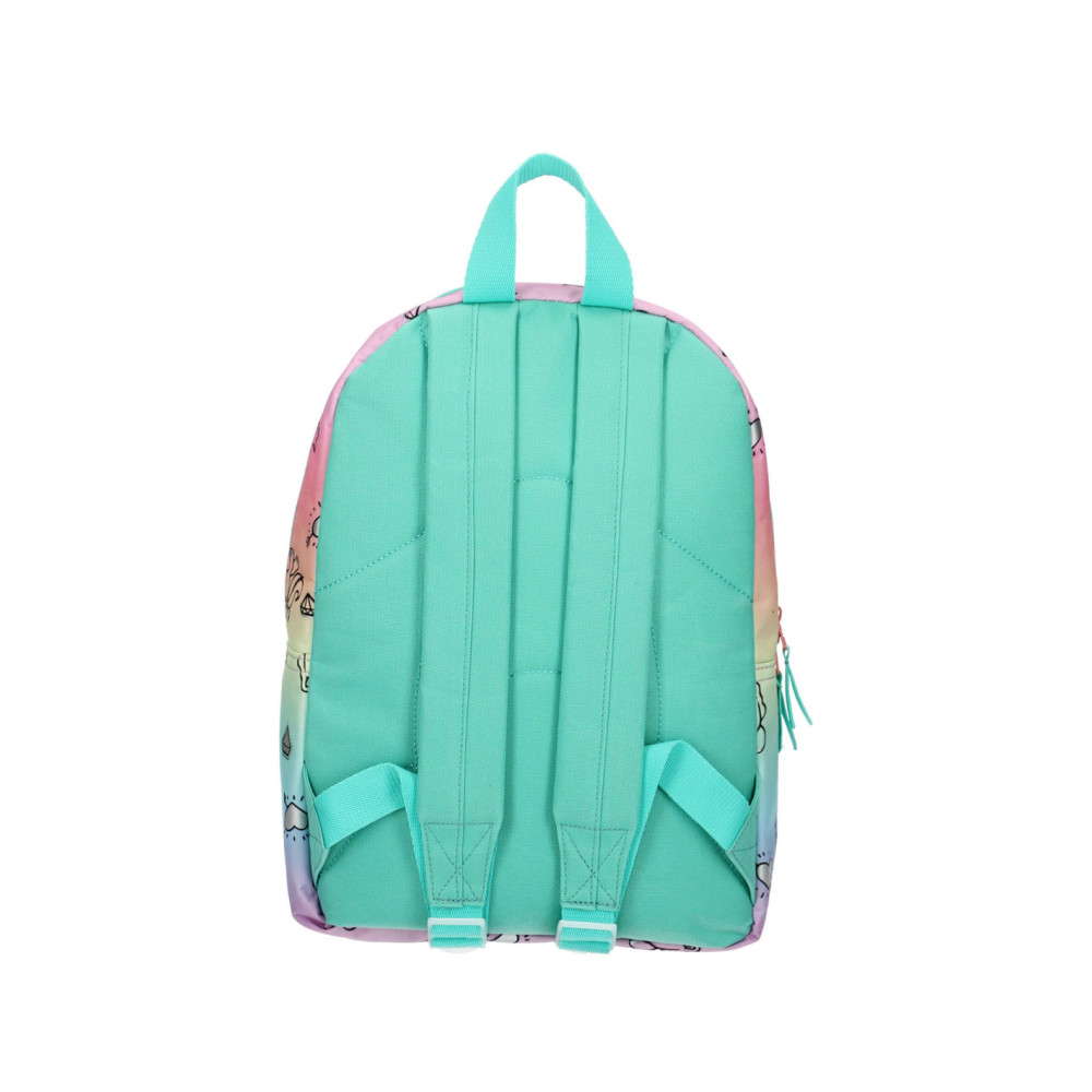 Waar worden kleine meisjes gelukkig van? Regenbogen en Eenhoorns! De Milky Kiss Rainbows and Unicorns collectie is dan ook een prachtige must-have collectie voor kleine unicorn fans in regenboog/pastelkleuren. De rugzak heeft een ruim hoofdvak en is met rits af te sluiten, net als het kleine opbergvakje aan de voorzijde. Het rugpand is verstevigd en de schouderbanden gewatteerd en in lengte verstelbaar. De rugzak is ook te dragen aan de lus aan de bovenzijde.