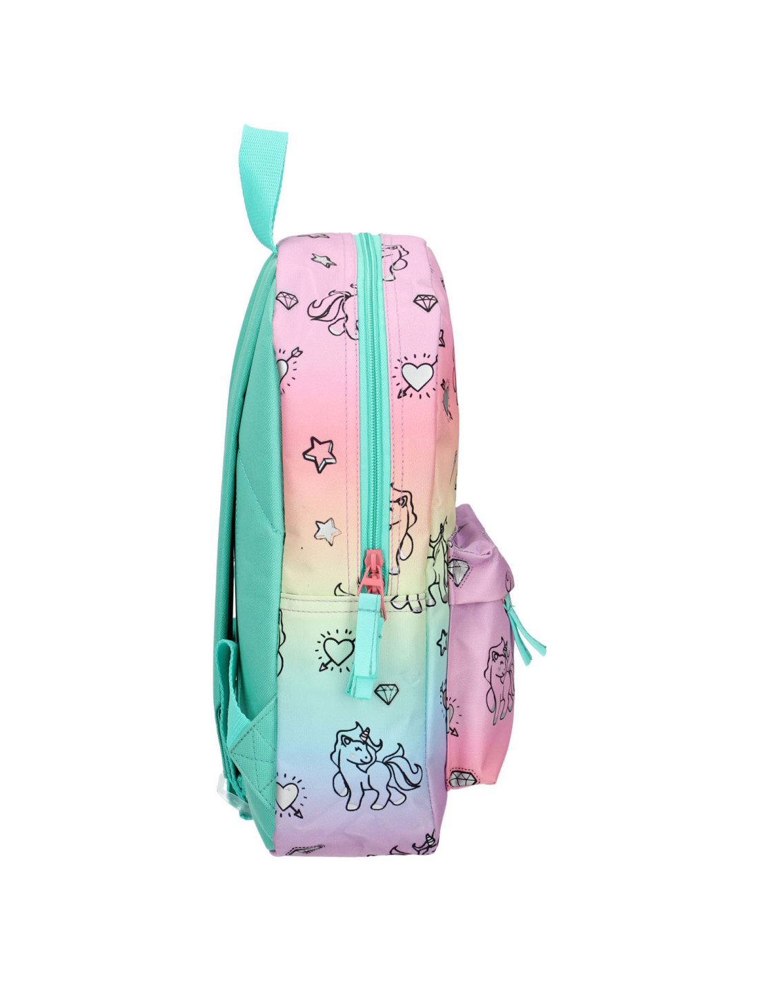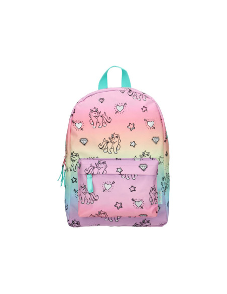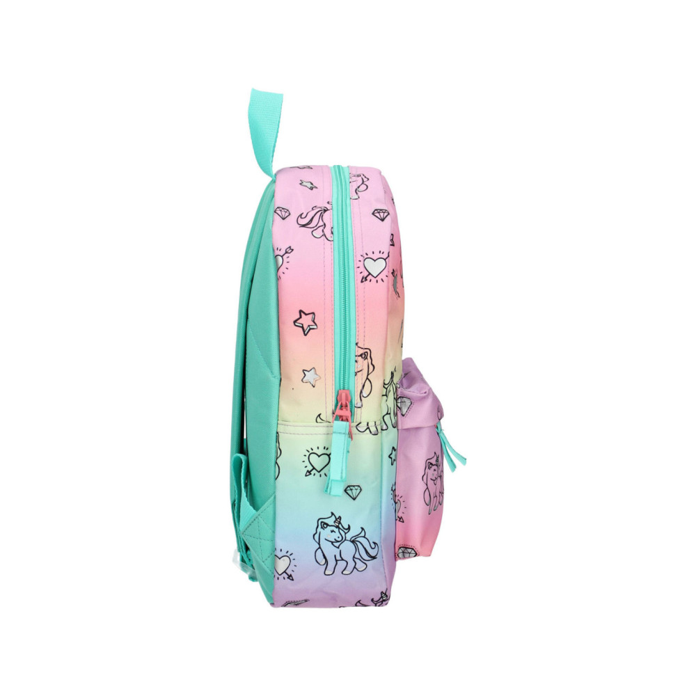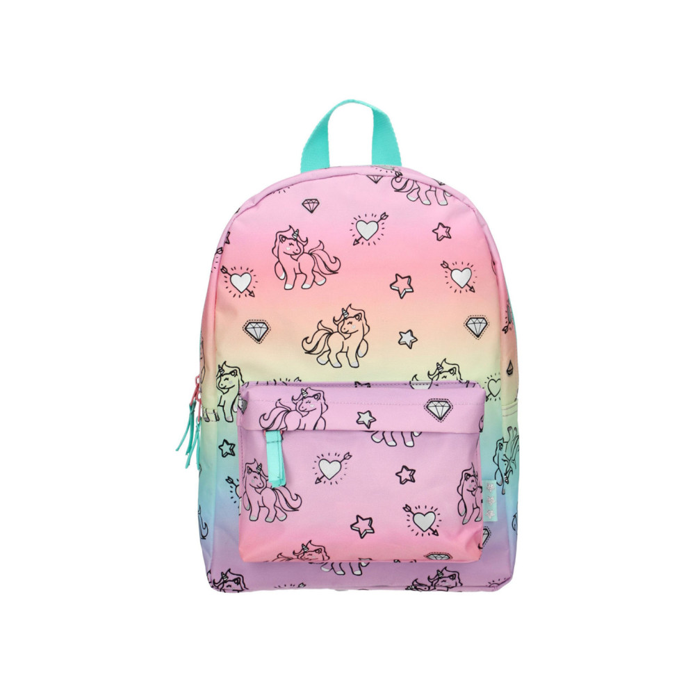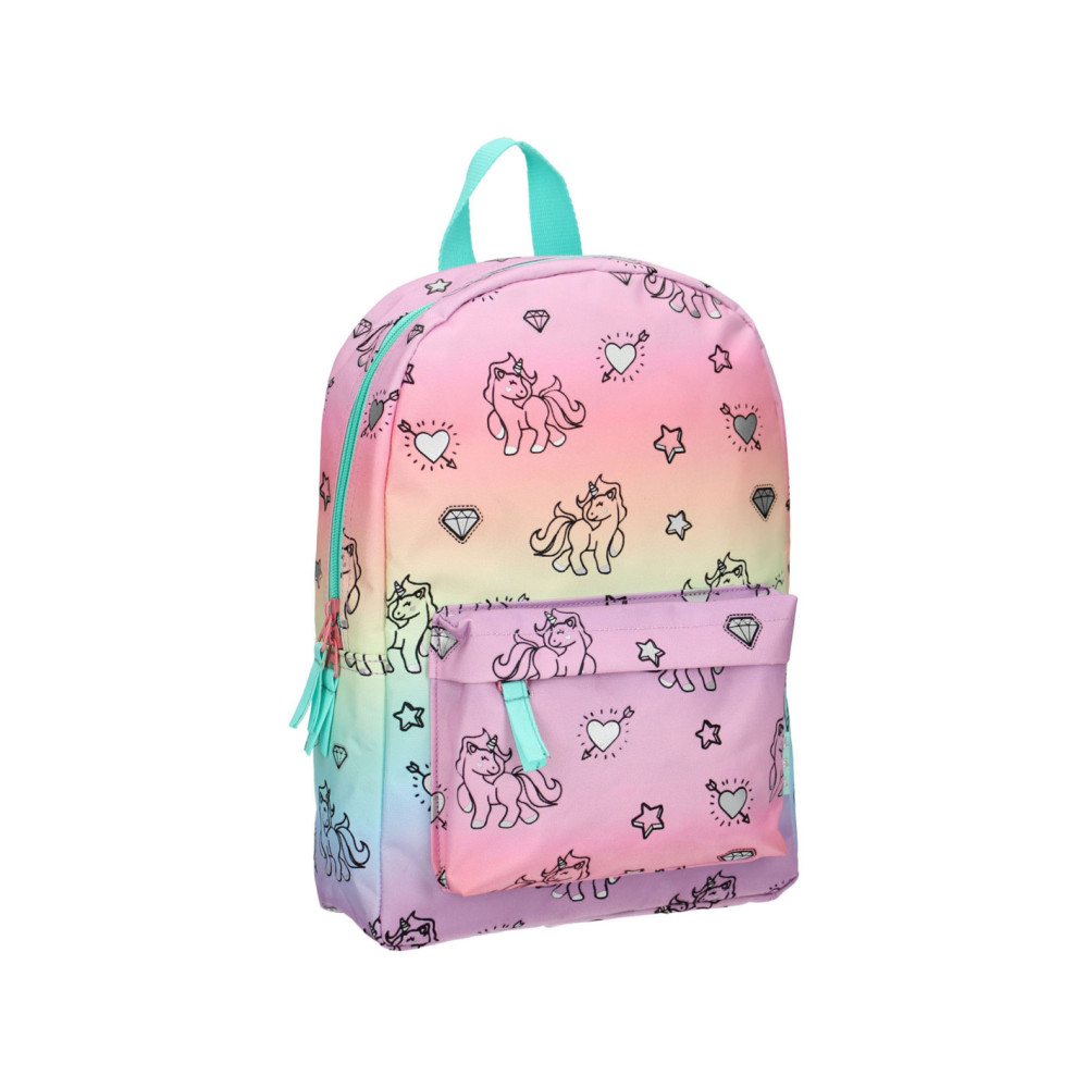 Waar worden kleine meisjes gelukkig van? Regenbogen en Eenhoorns! De Milky Kiss Rainbows and Unicorns collectie is dan ook een prachtige must-have collectie voor kleine unicorn fans in regenboog/pastelkleuren. De rugzak heeft een ruim hoofdvak en is met rits af te sluiten, net als het kleine opbergvakje aan de voorzijde. Het rugpand is verstevigd en de schouderbanden gewatteerd en in lengte verstelbaar. De rugzak is ook te dragen aan de lus aan de bovenzijde.