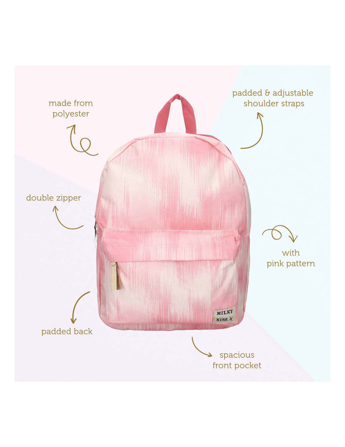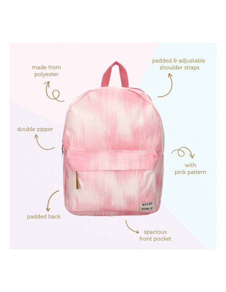 Stap in de wereld van stijl met de Milky Kiss rugzak uit de "Bold Style" collectie! Deze opvallende tas is perfect voor wie durft op te vallen. Met zijn prachtige roze kleur is deze rugzak een echt fashion statement. Hij heeft één ruim hoofdvak en een handig voorvak om al je spullen georganiseerd te houden. De verstelbare schouderbanden zorgen voor optimaal draagcomfort, terwijl het hengsel aan de bovenkant het gemakkelijk maakt om de tas in je hand te dragen. Met het logo van Milky Kiss rechtsonder op het voorvak, laat je ook nog eens zien dat je oog hebt voor detail. Ga voor een coole stijl met deze Milky Kiss rugzak uit de "Bold Style" collectie!