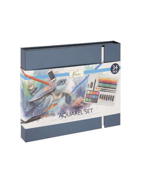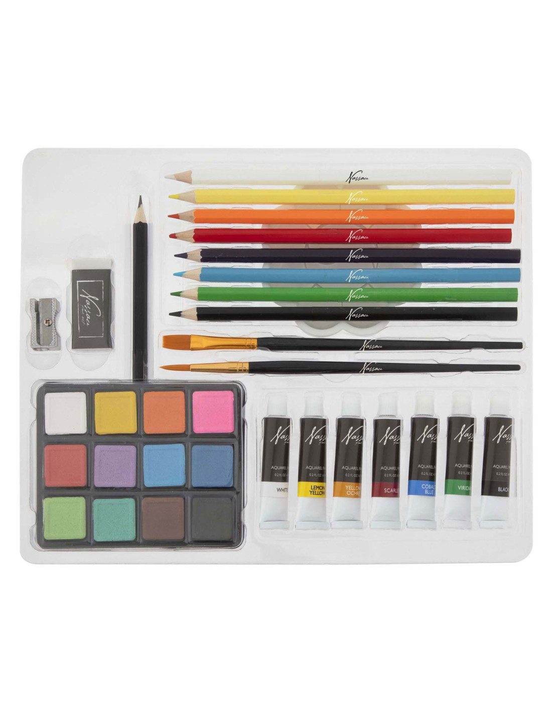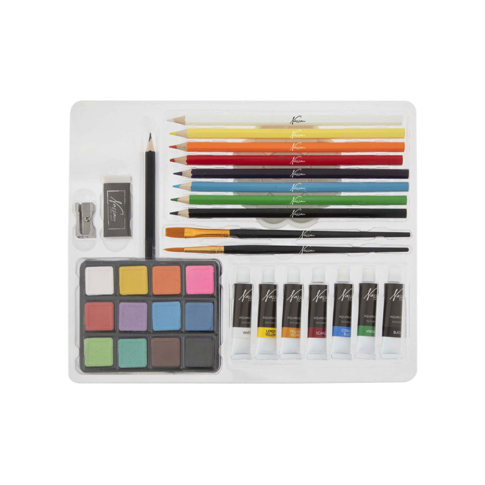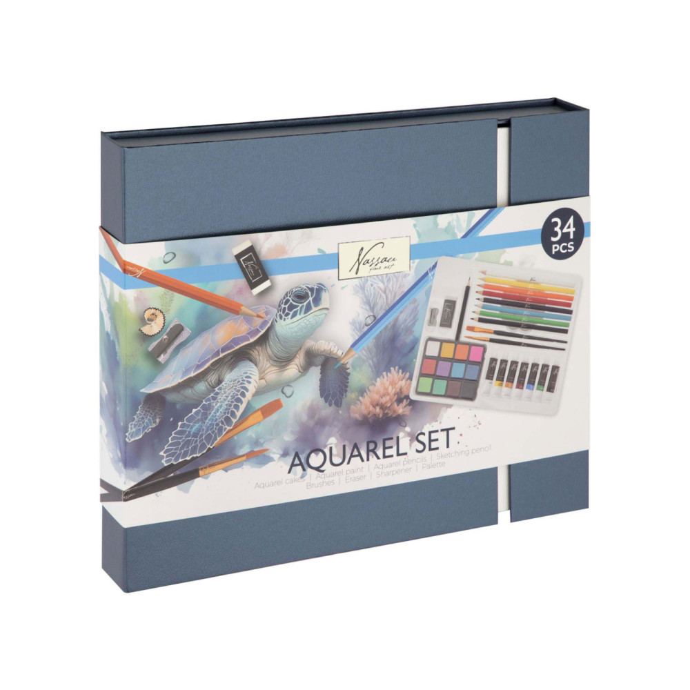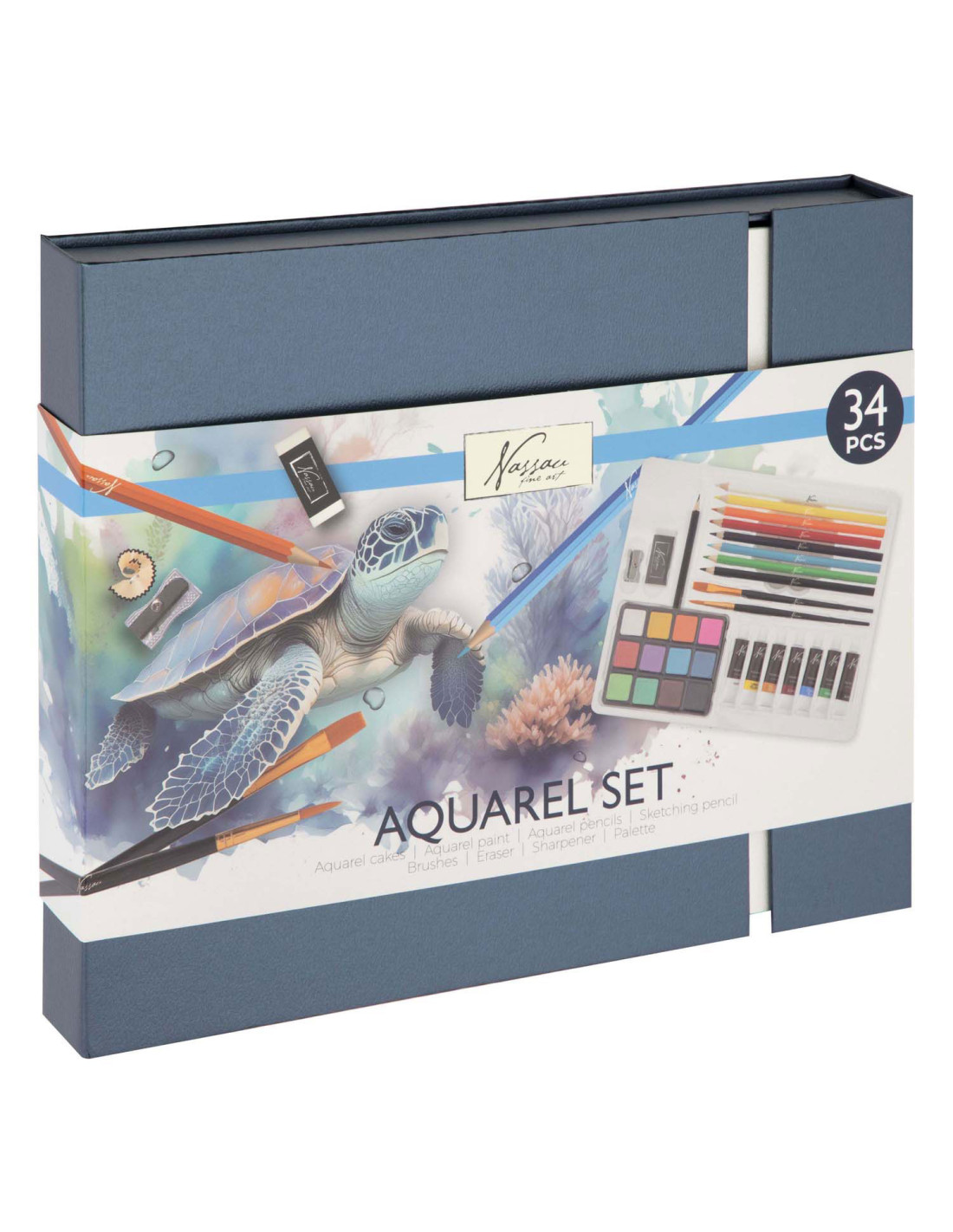 Aquarel Art Set, 34-delig van Nassau Fine Art. Deze set bevat aquarelverf, aquarelpotloden, een schetspotlood, kwasten, een gum, een slijper en een palette.