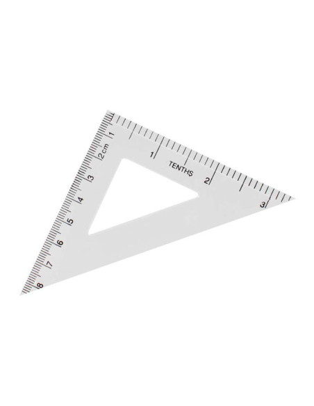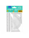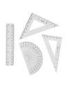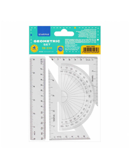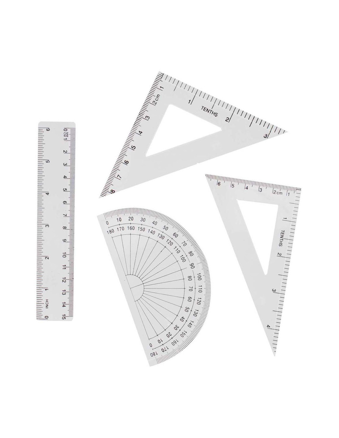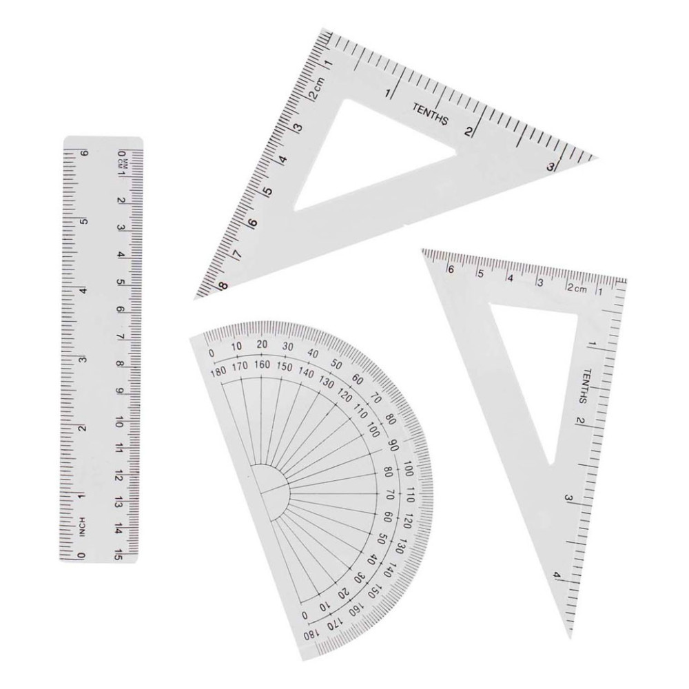Geometrische set van 4 onderdelen. De set bestaat uit een liniaal van 15 cm, een geodriehoek, een gradenboog en een driehoek met 2 lange zijden. Geschikt voor kinderen vanaf 3 jaar.