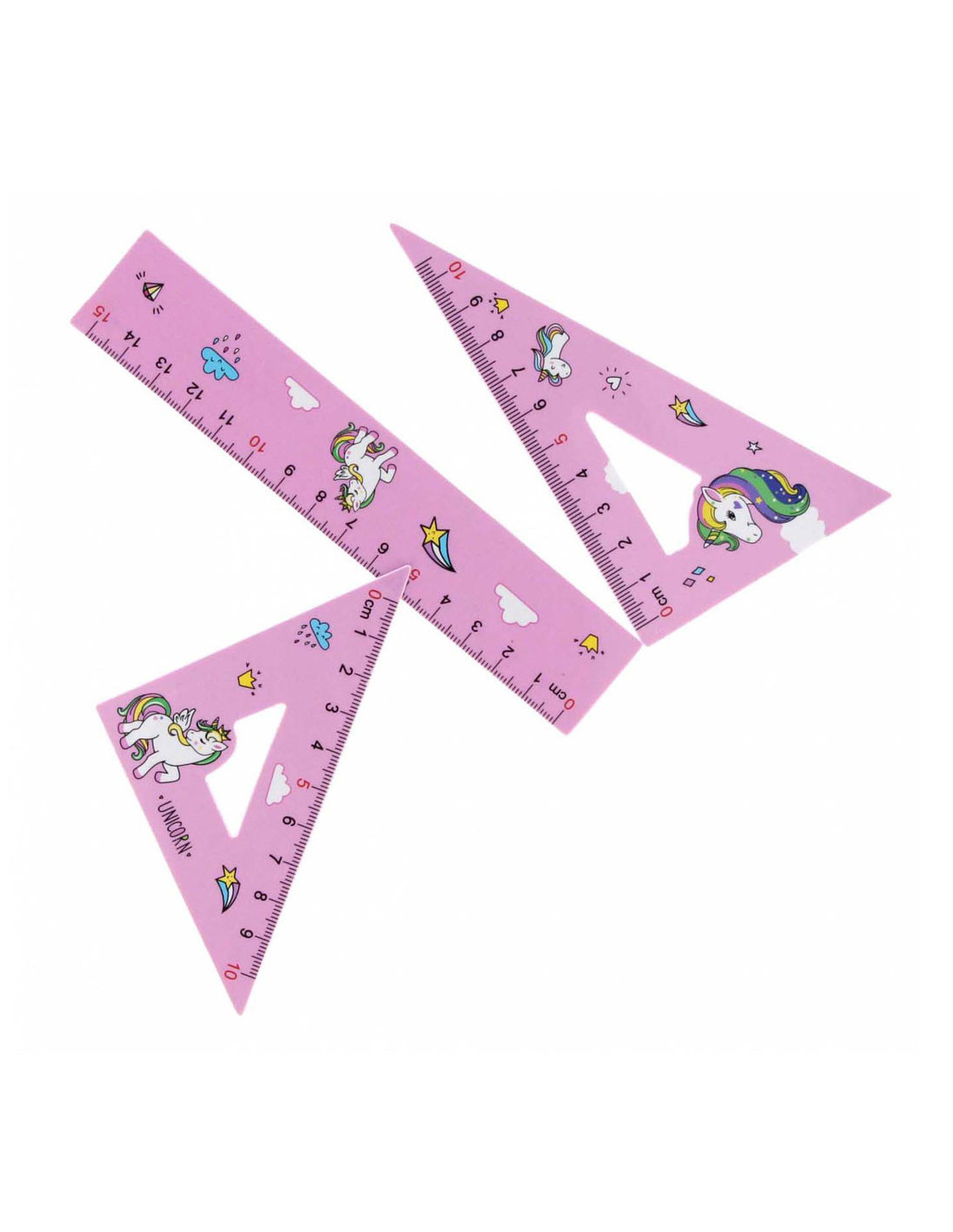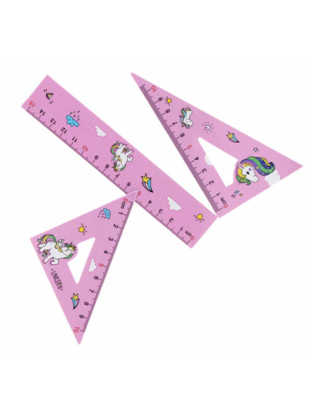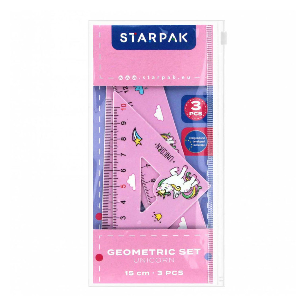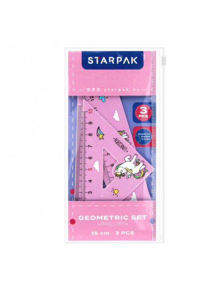 Geometrische set met een Eenhoornmotief uit de STARPAK-schoolcollectie. De geometrische set bestaat uit een liniaal van 15 cm en twee driehoeken. De set is gemaakt van hoogwaardige materialen en bedoeld voor kinderen van 3+ jaar.