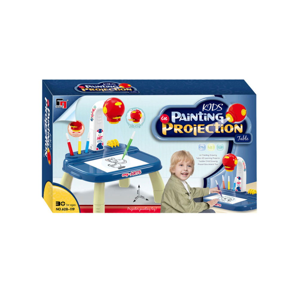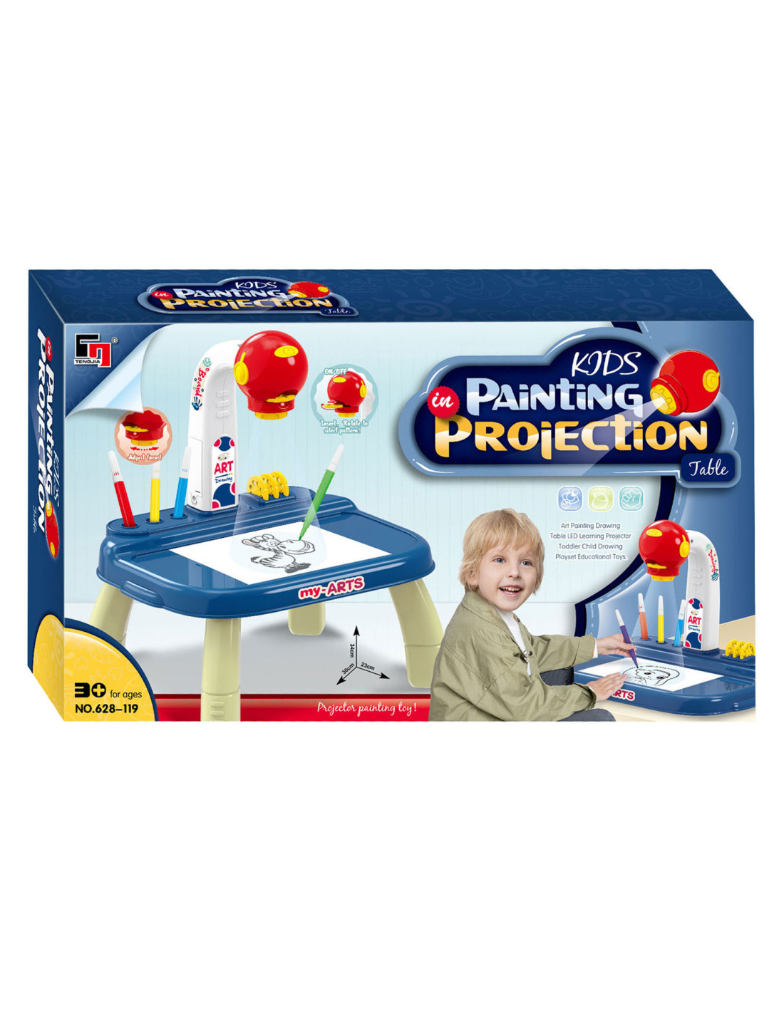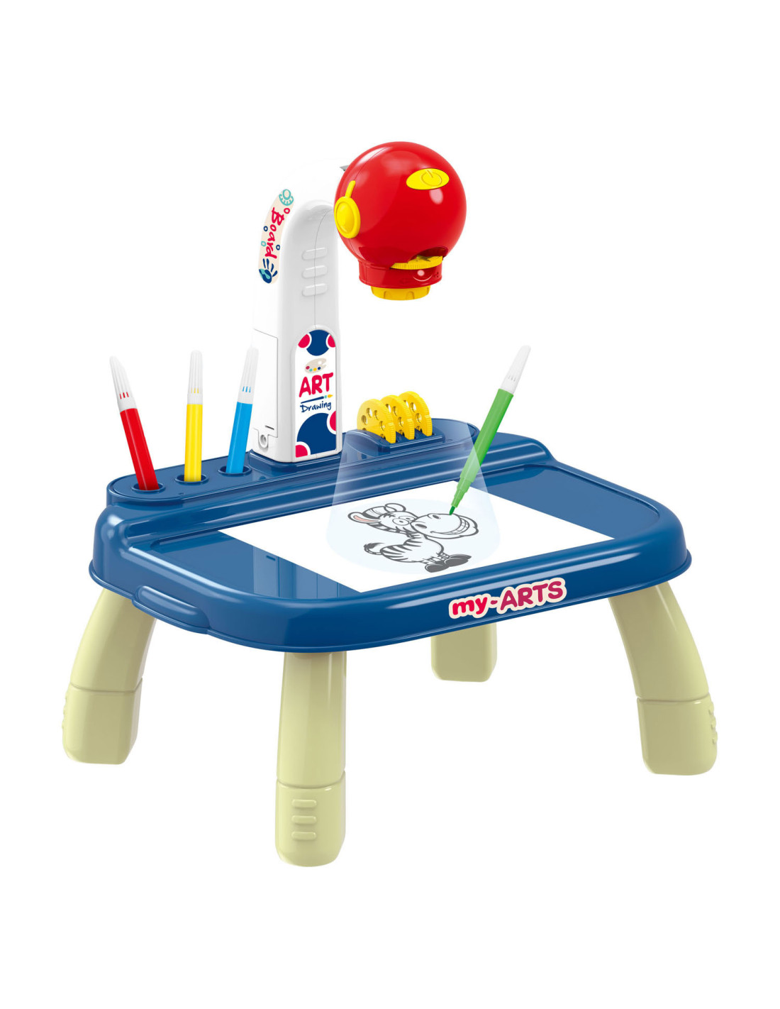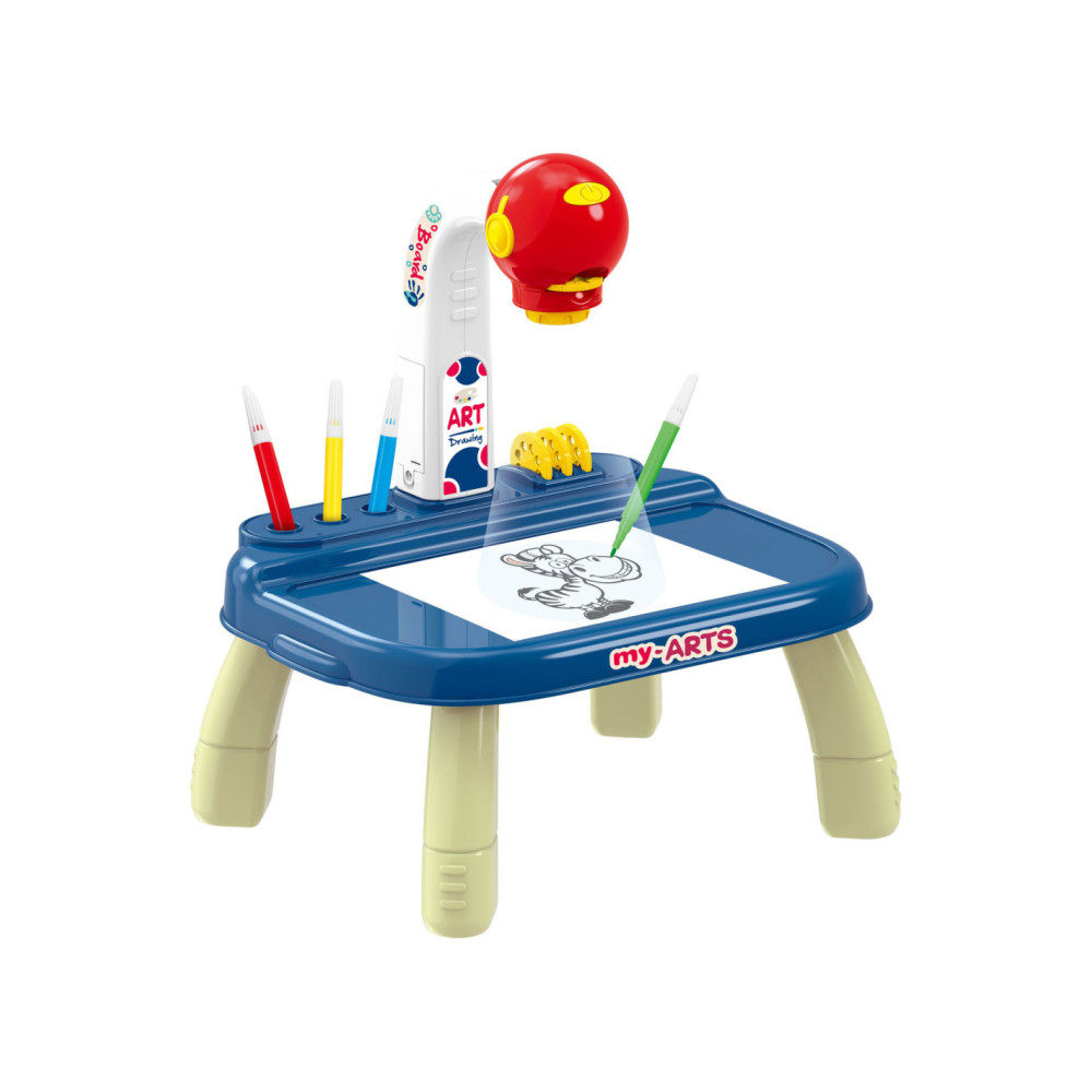 Teken projectietafel in de kleur blauw. De projectietafel bevat een projector op batterijen met 4 opzetstukken en 4 kleuren stiften. Afmetingen: 30 x 34 x 23 centimeter. Geschikt voor kinderen van 3 jaar en ouder. Werkt op 3 AAA batterijen (niet inbegrepen).