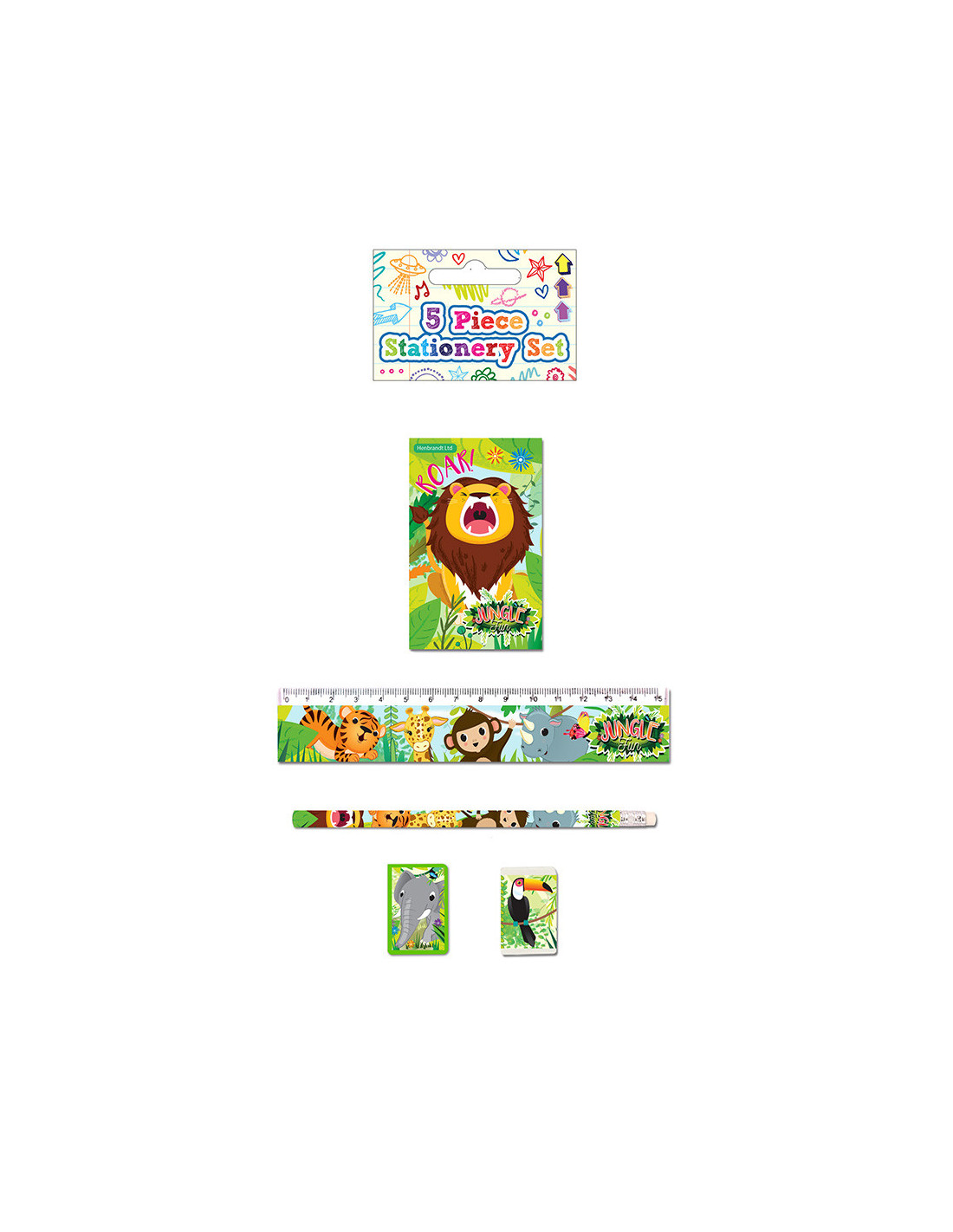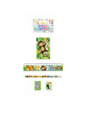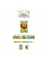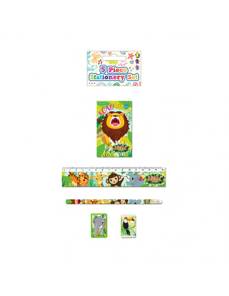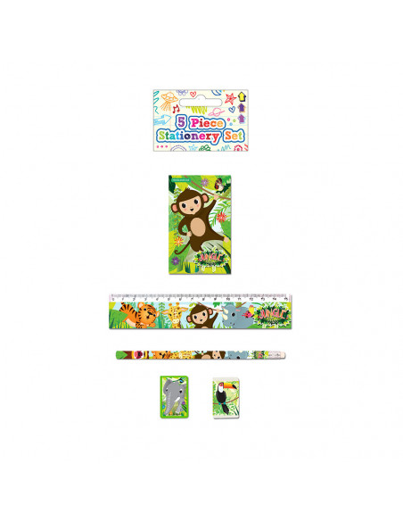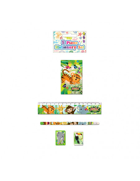 De tekenset bestaat uit een notitieboekje, liniaal, pootlood, puntenslijper en een gum. Allemaal in de thema wilde dieren. Prijs per set, verschillende uitvoeringen worden door elkaar geleverd.