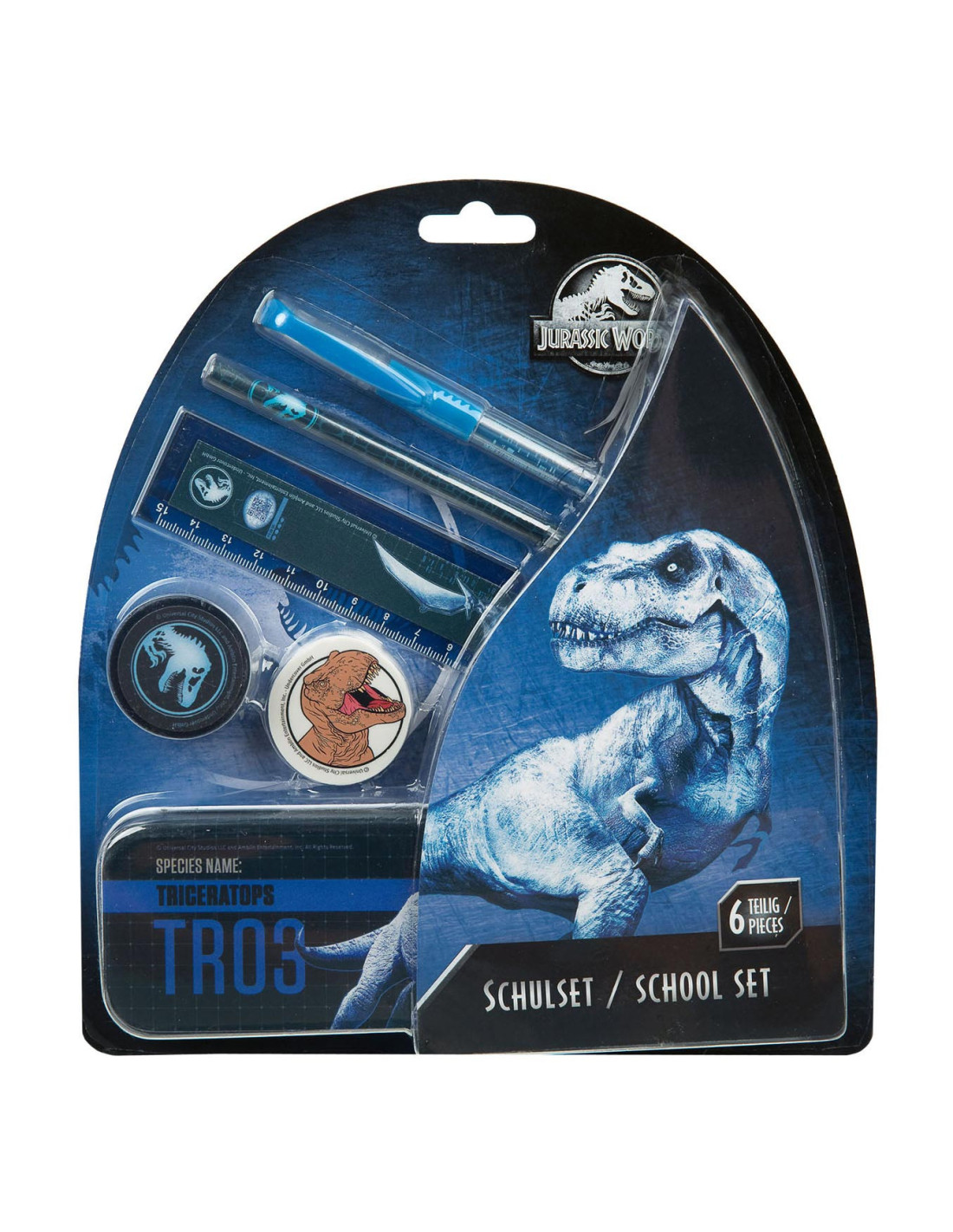 School schrijfset van Jurassic World met blikken opbergdoos, potlood, gum, puntenslijper, liniaal en gelpen. Adviesleeftijd: vanaf 3 jaar.