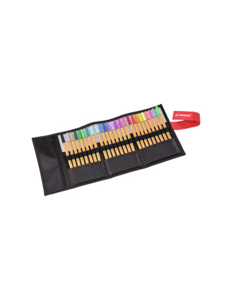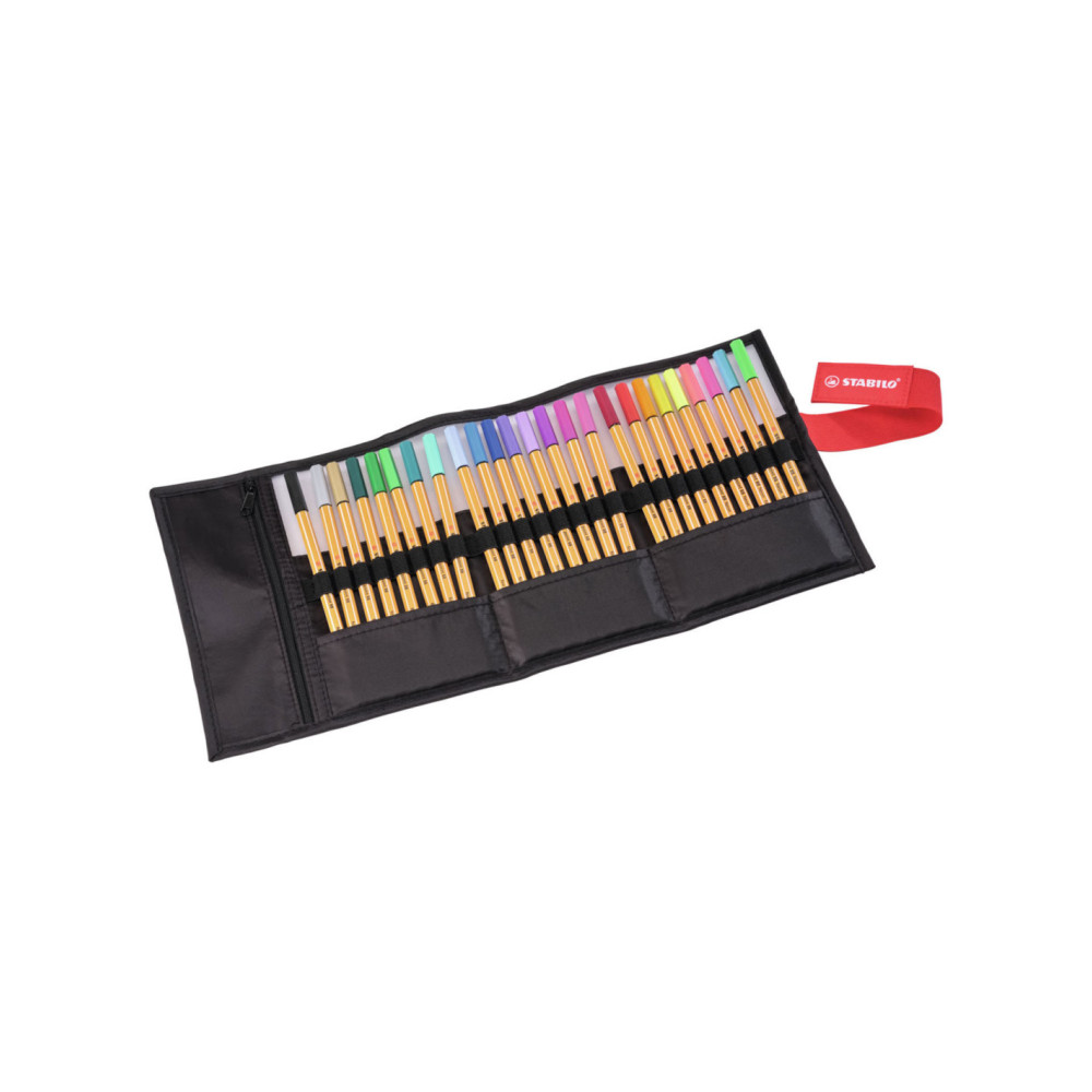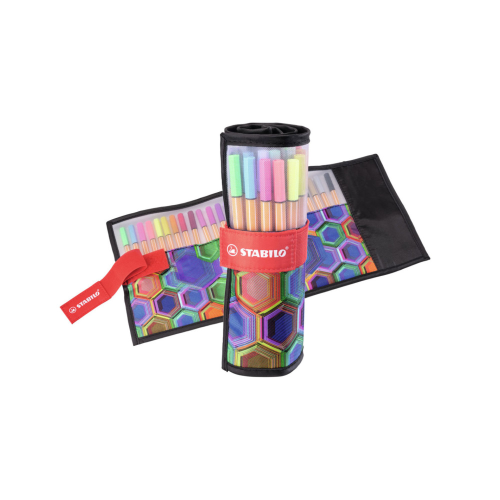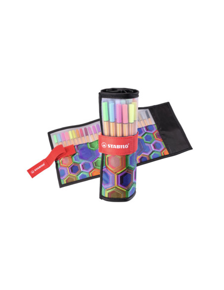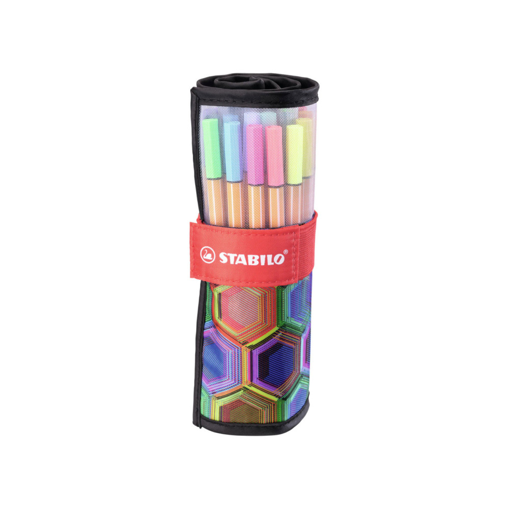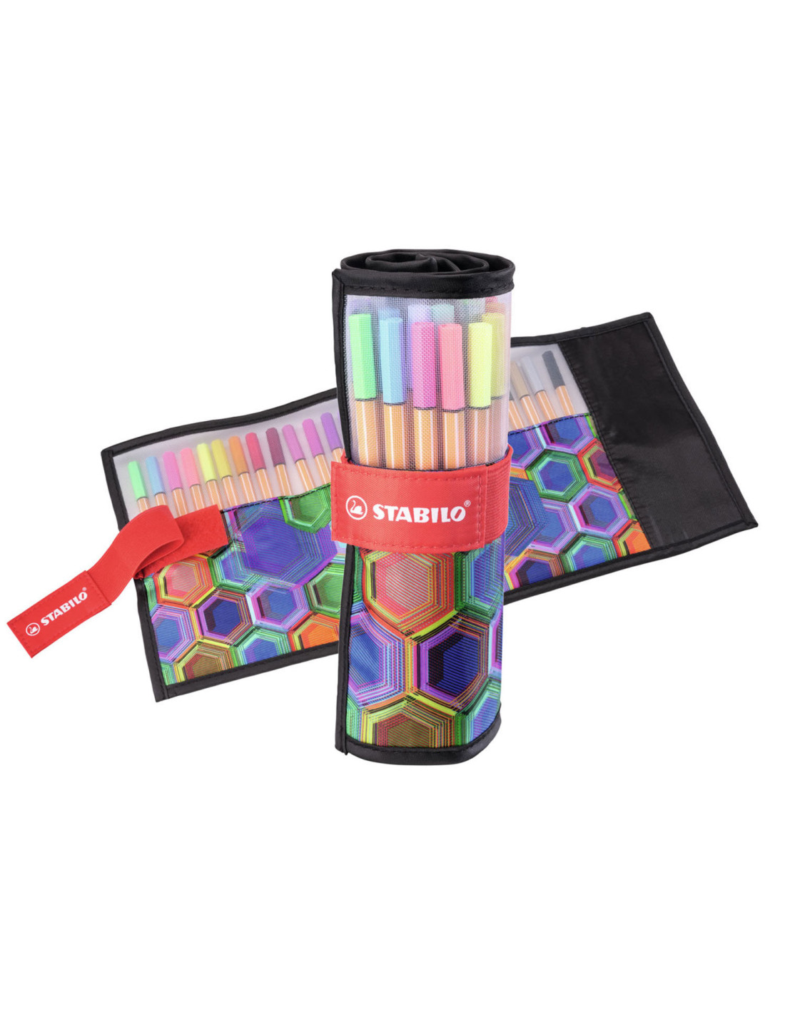 Deze rollerset is gevuld met 25 verschillende kleuren STABILO Point 88 stiften. De STABILO® point 88 is de universele fineliner voor scholieren, studenten en professionals. Lijnbreedte: 0,4 mm. De set rol je eenvoudig in elkaar met behulp van klittenband.